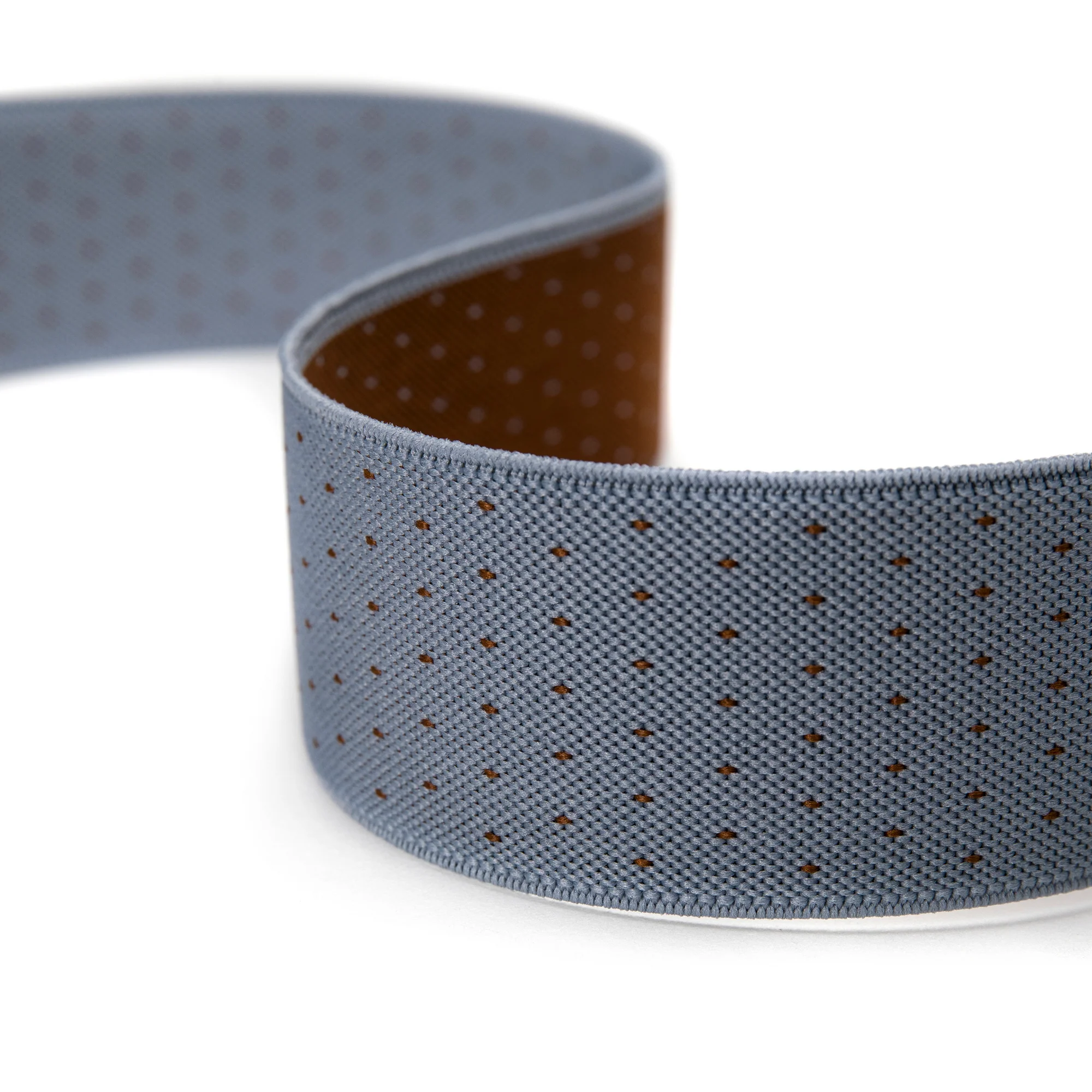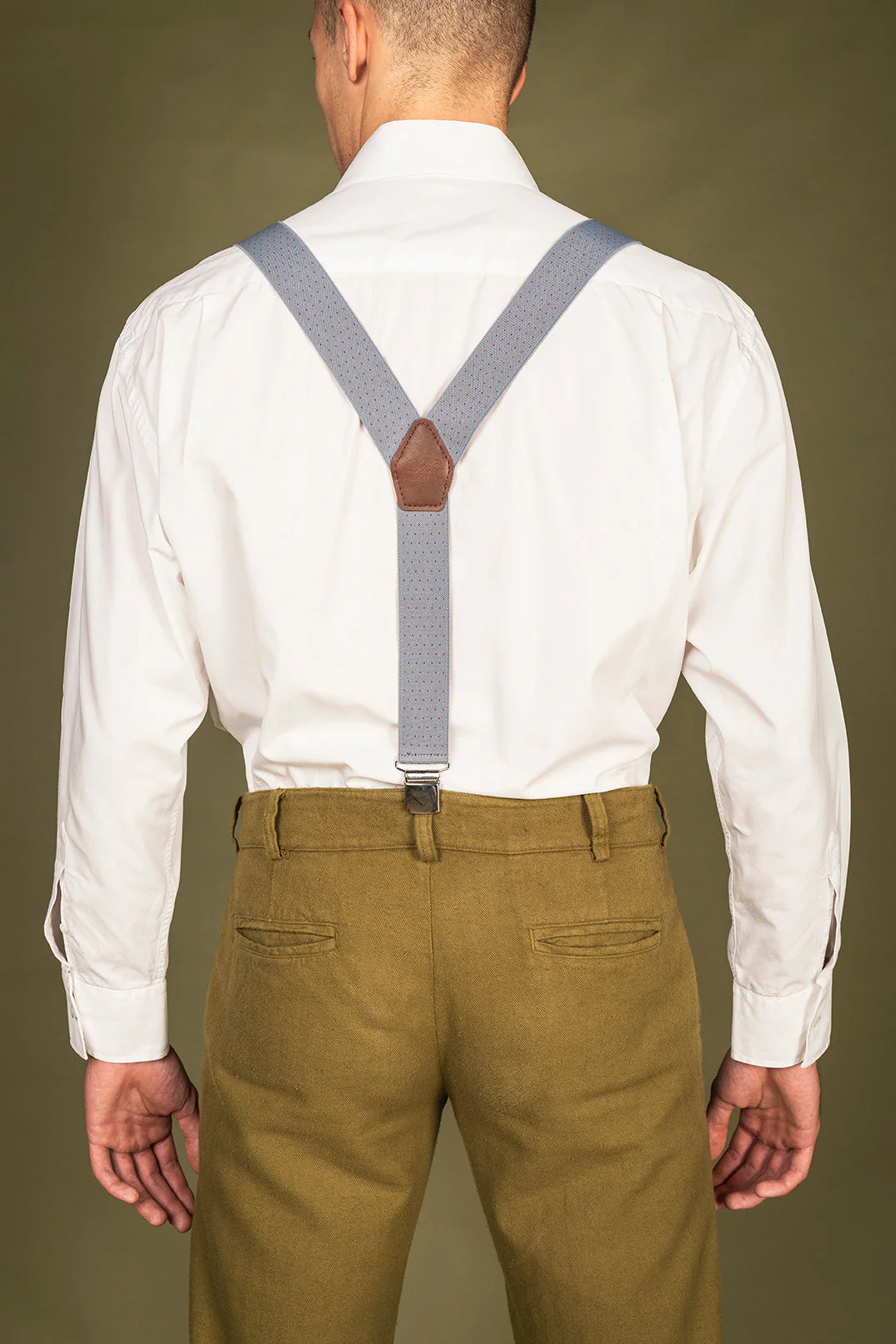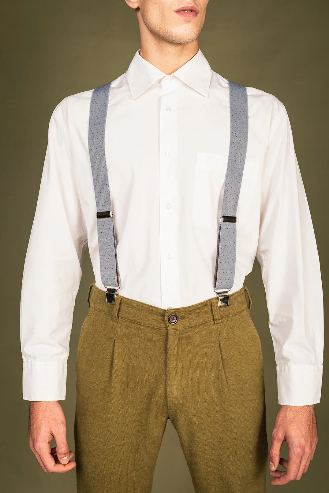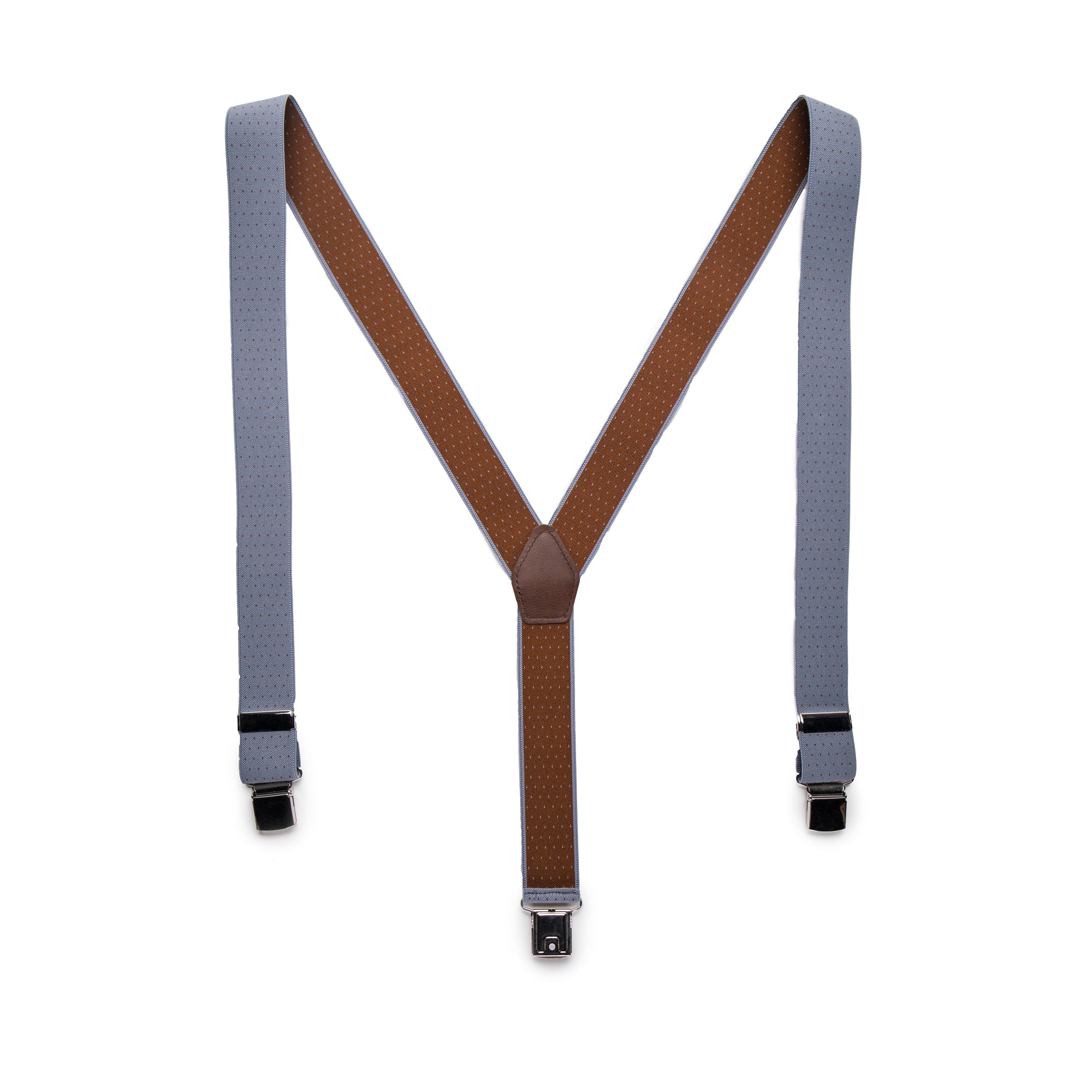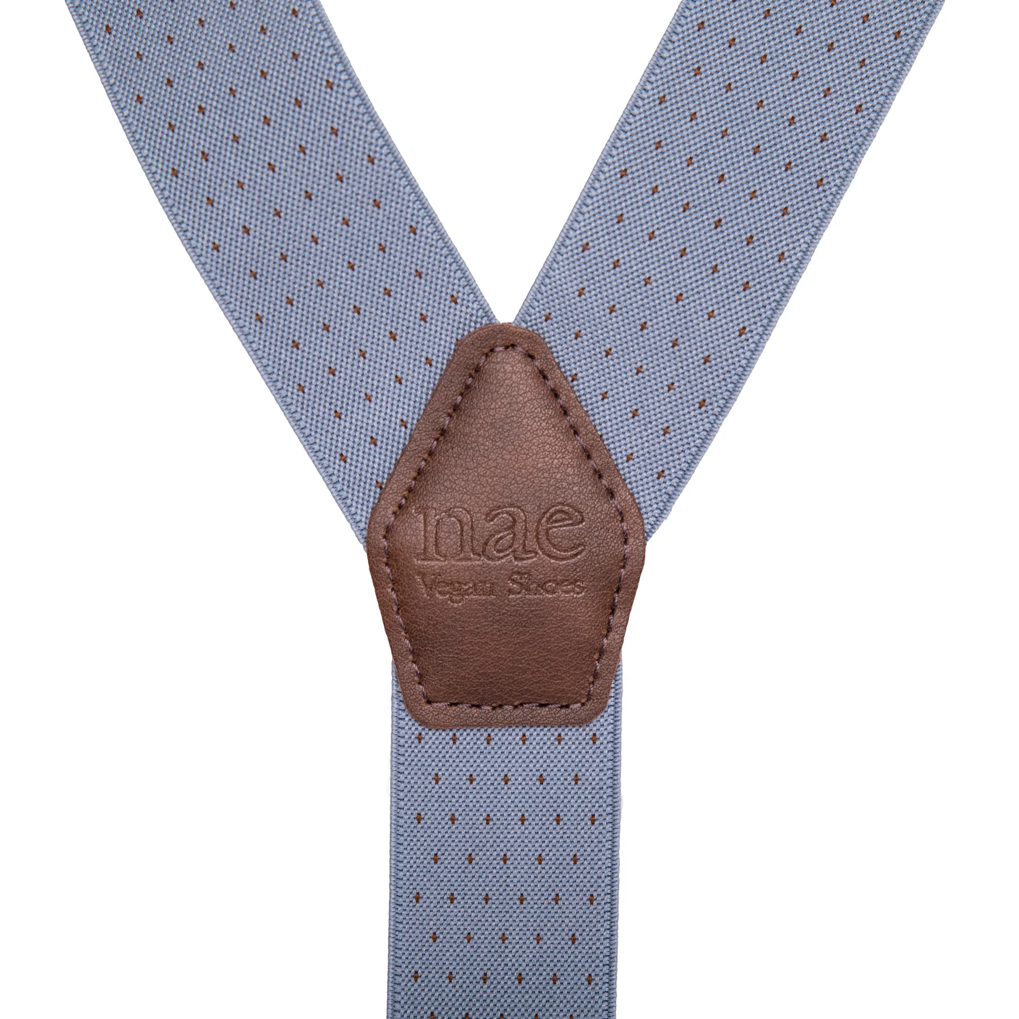 Compre online os suspensórios vegan Adam em forma de Y, ajustáveis em elástico com sólidos fechos em clip. Na parte de trás têm uma peça em microfibra o que faz com que seja totalmente ajustável a qualquer pessoa e tamanho. O padrão dos elásticos é na parte exterior num cinza-azul com pequenos pontos em castanho e o seu interior em castanho com pequenos pontos em cinza-azul.