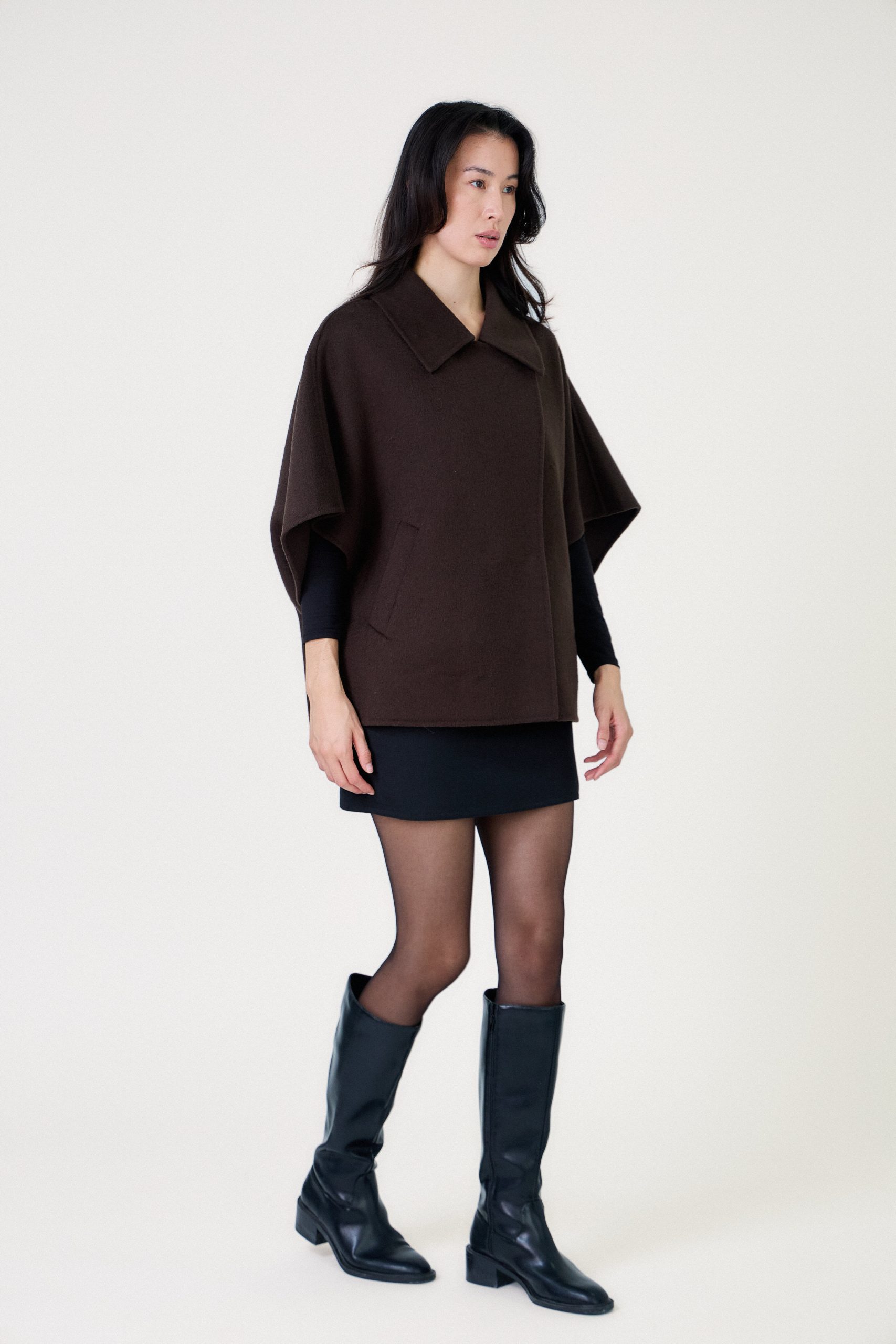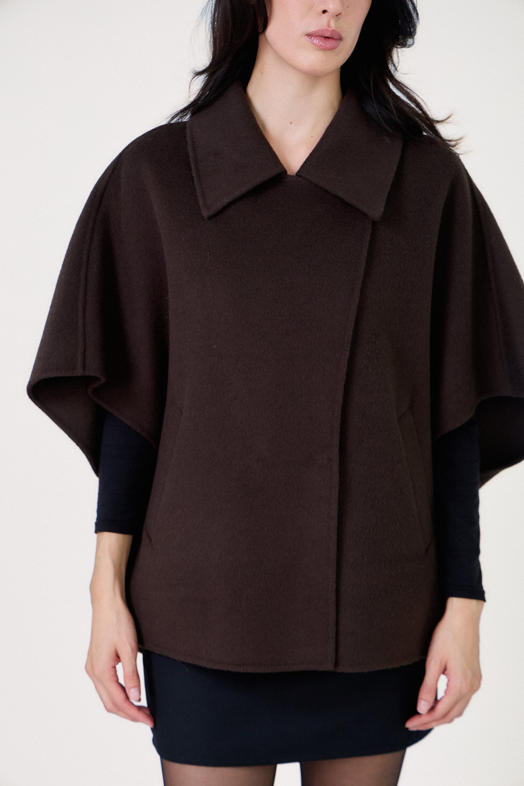 Cape ample majorité laine Manches larges esprit kimono Fermeture zippée Finitions faites main Notre mannequin mesure 177cm et porte une taille S