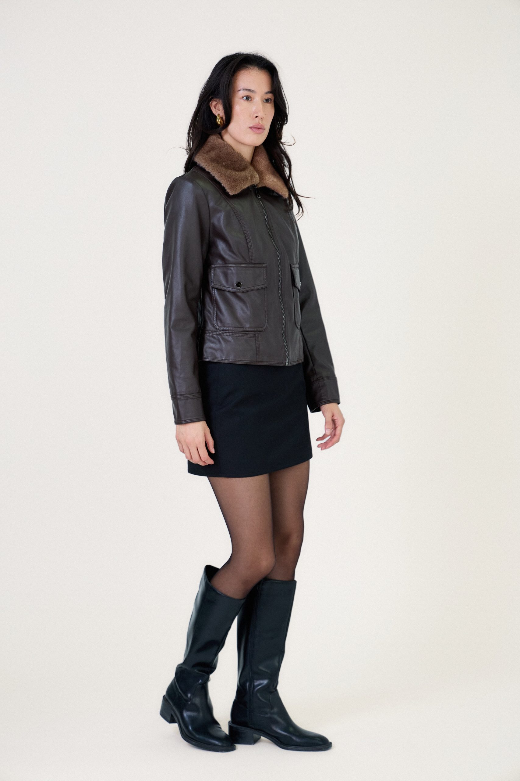 Veste court à coupe ajustée Col en fausse fourrure Fermeture zippée Col chemise Poches plaquées à rabat pressionné Finition effet cuir lisse, esprit vintage Notre mannequin mesure 177cm et porte une taille S