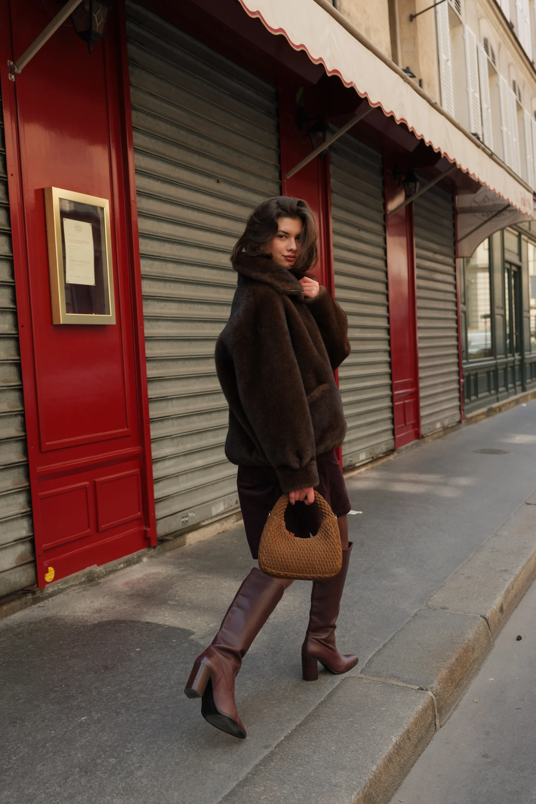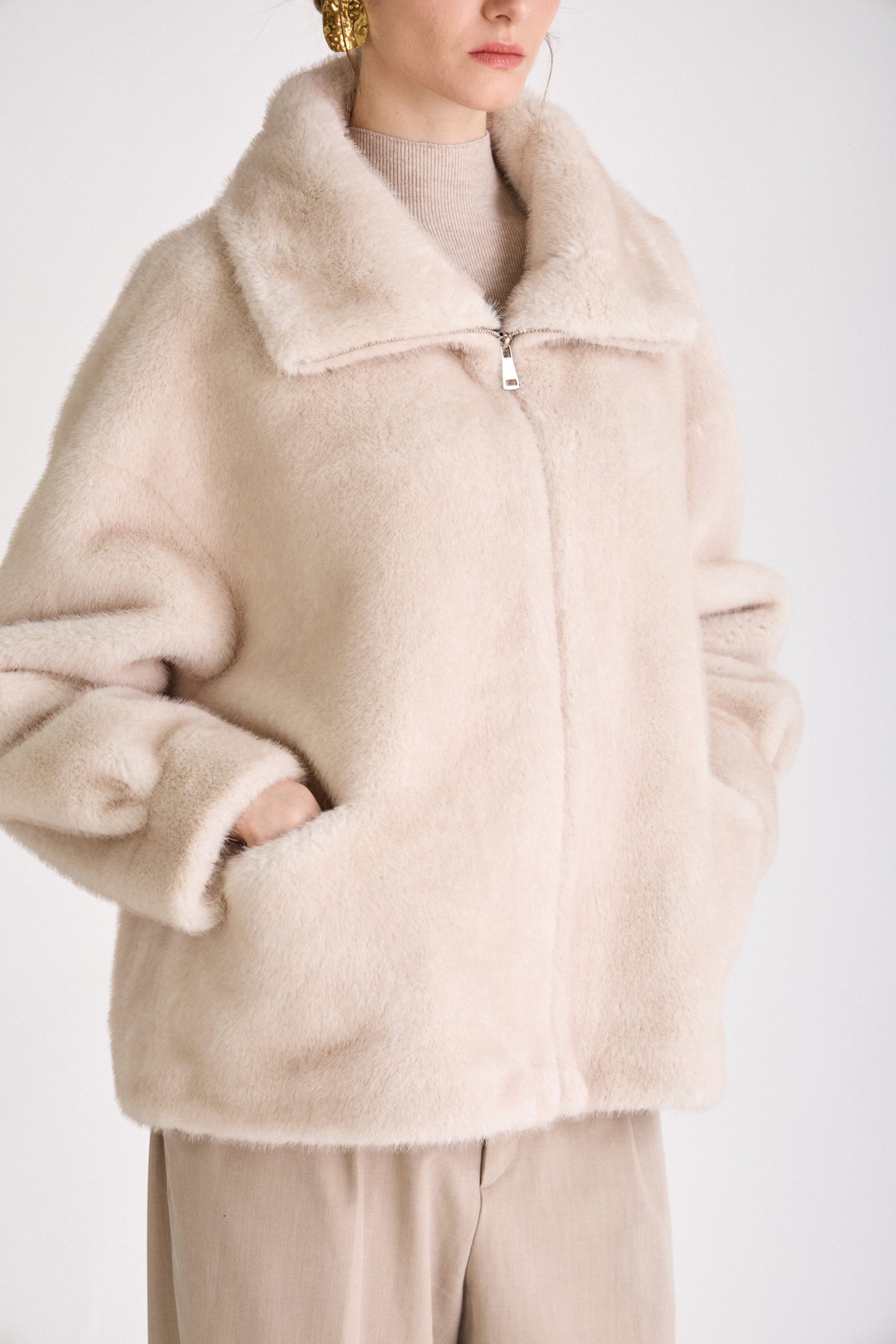 Blouson en fausse fourrure Col montant Coupe très ample Zip frontal discret Taille ajustable grâce à un cordon de serrage Poches avant Conseil taille : prenez une taille en dessous de votre taille habituelle Notre mannequin mesure 177cm et porte une taille S