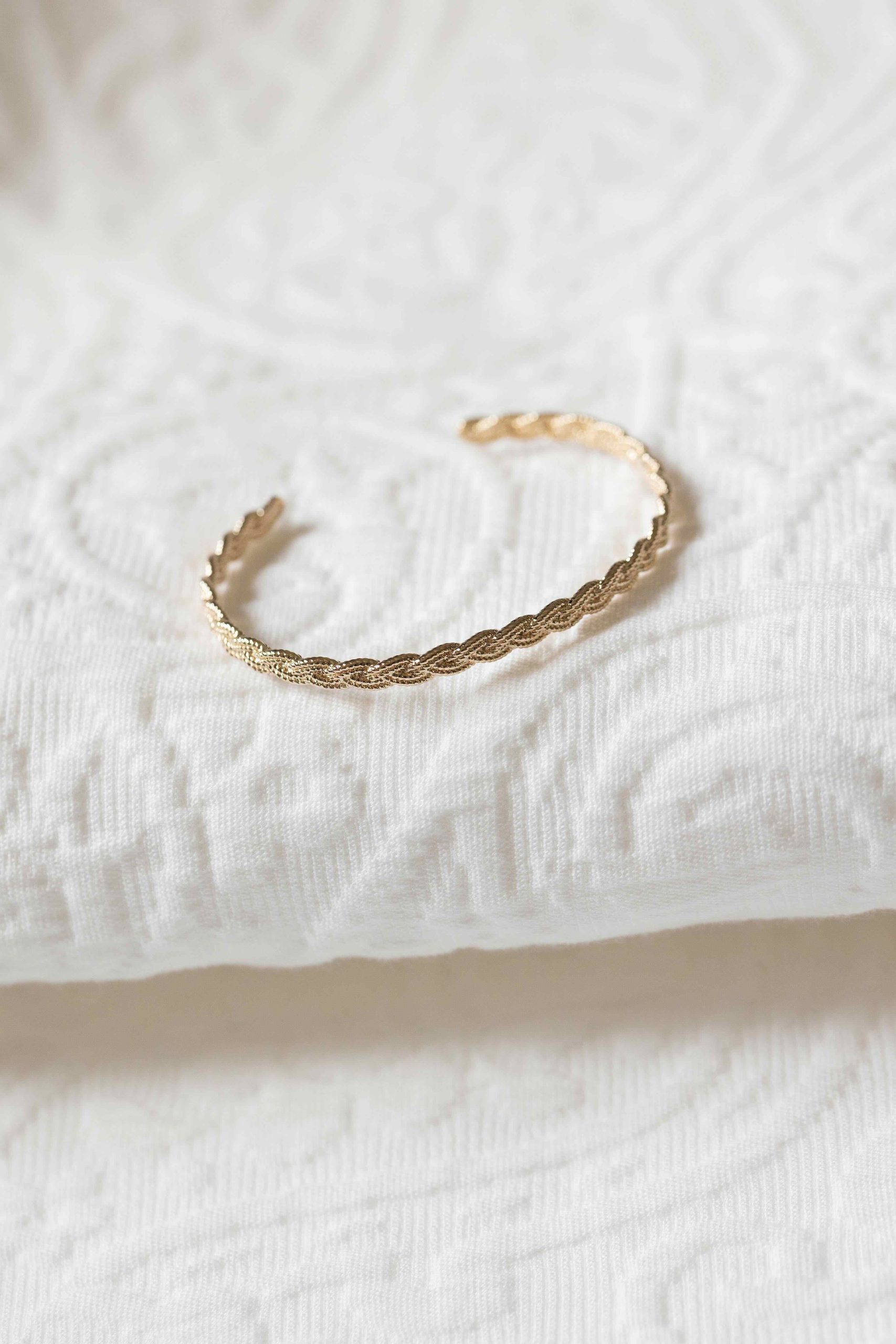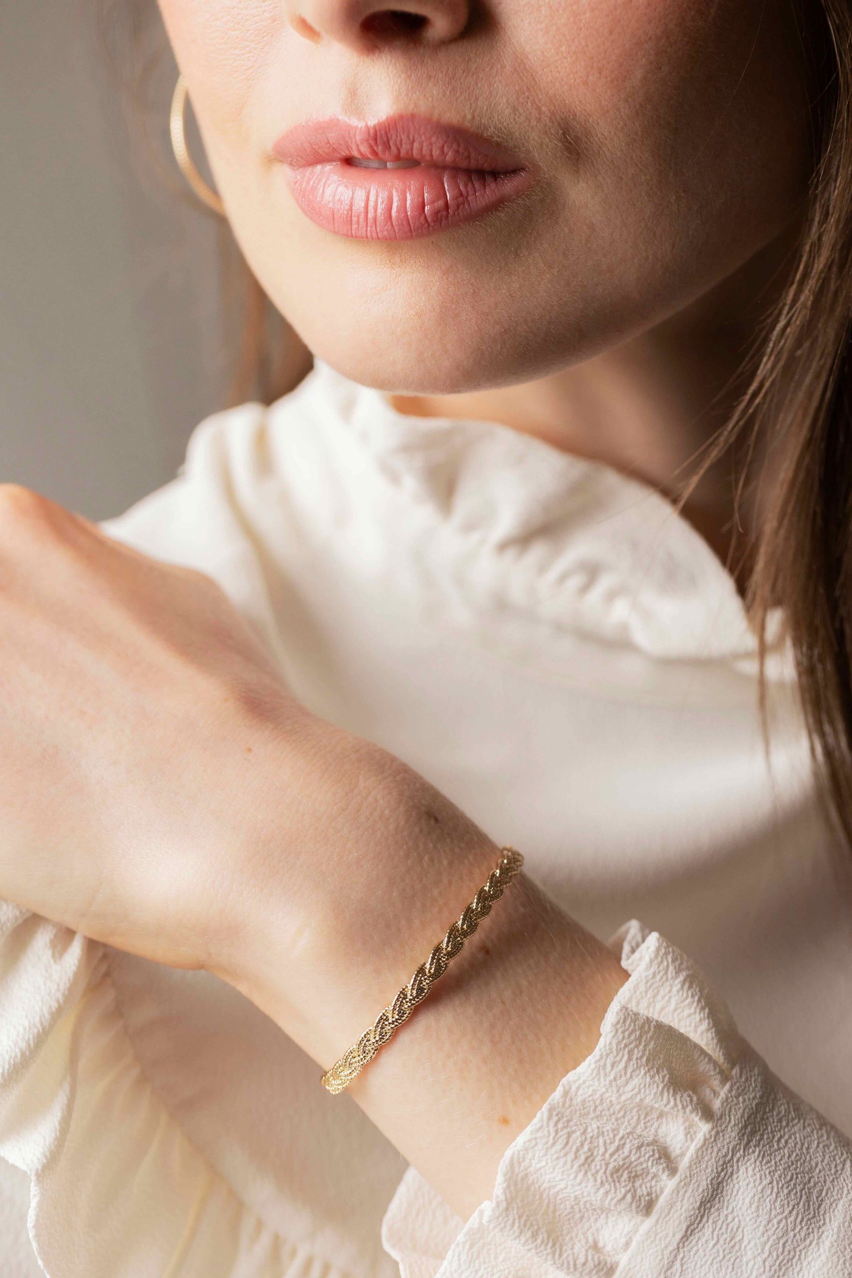 Dieser elegante, vergoldete Armreif zeigt ein wunderschönes, geflochtenes Design, das jedem Outfit einen Hauch von Raffinesse verleiht.