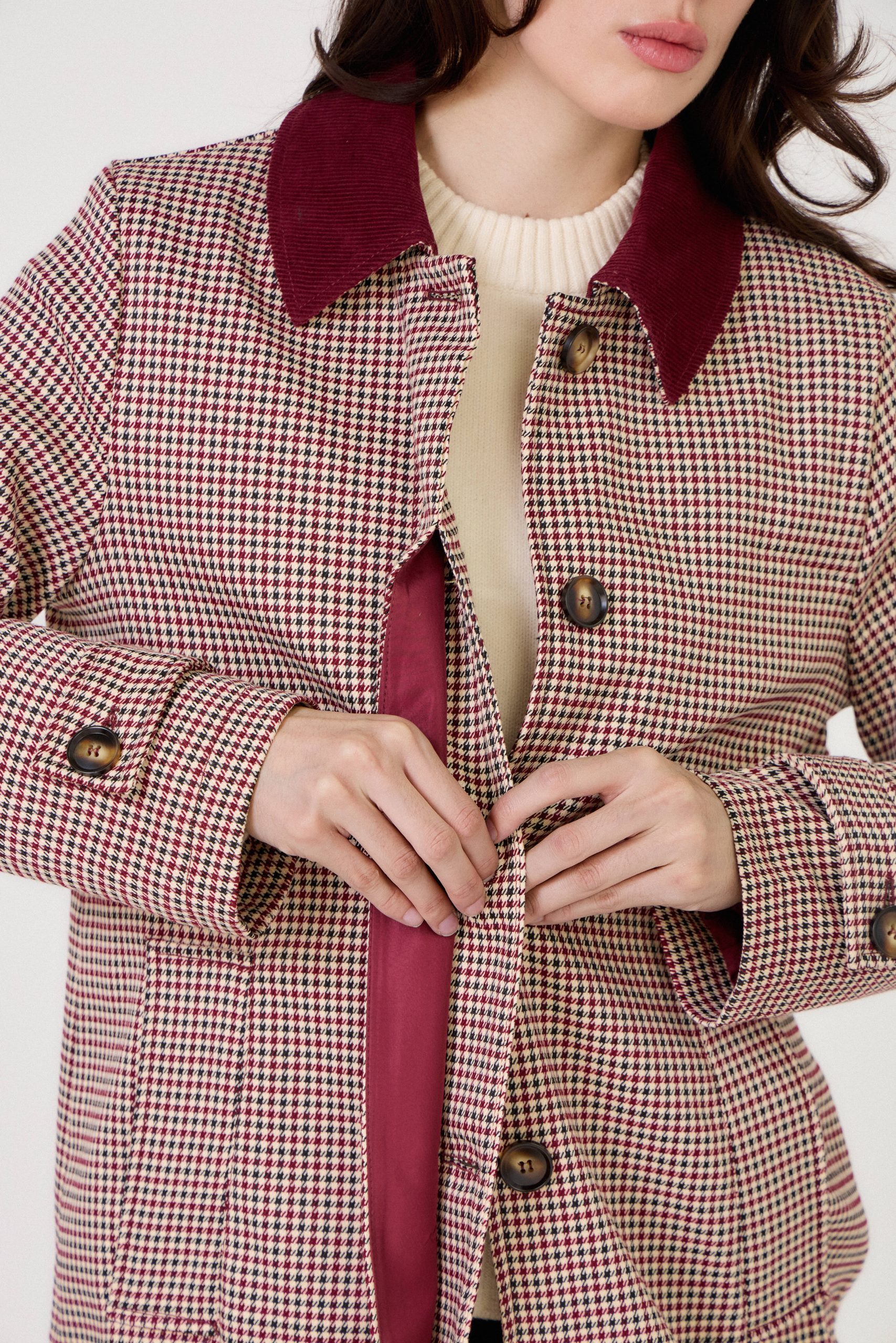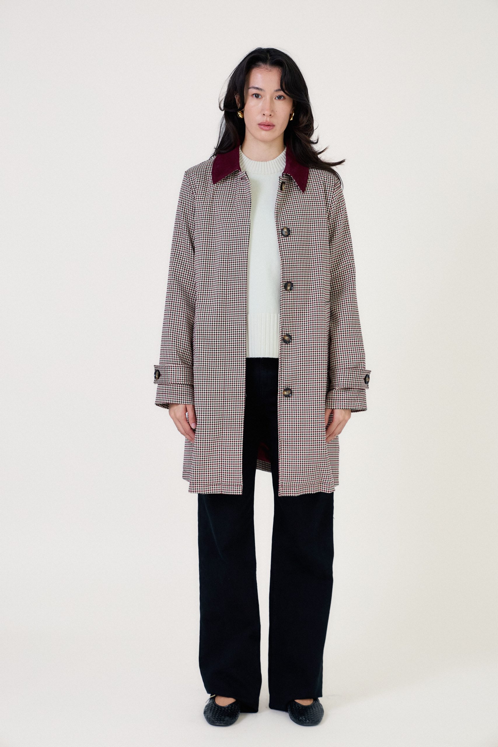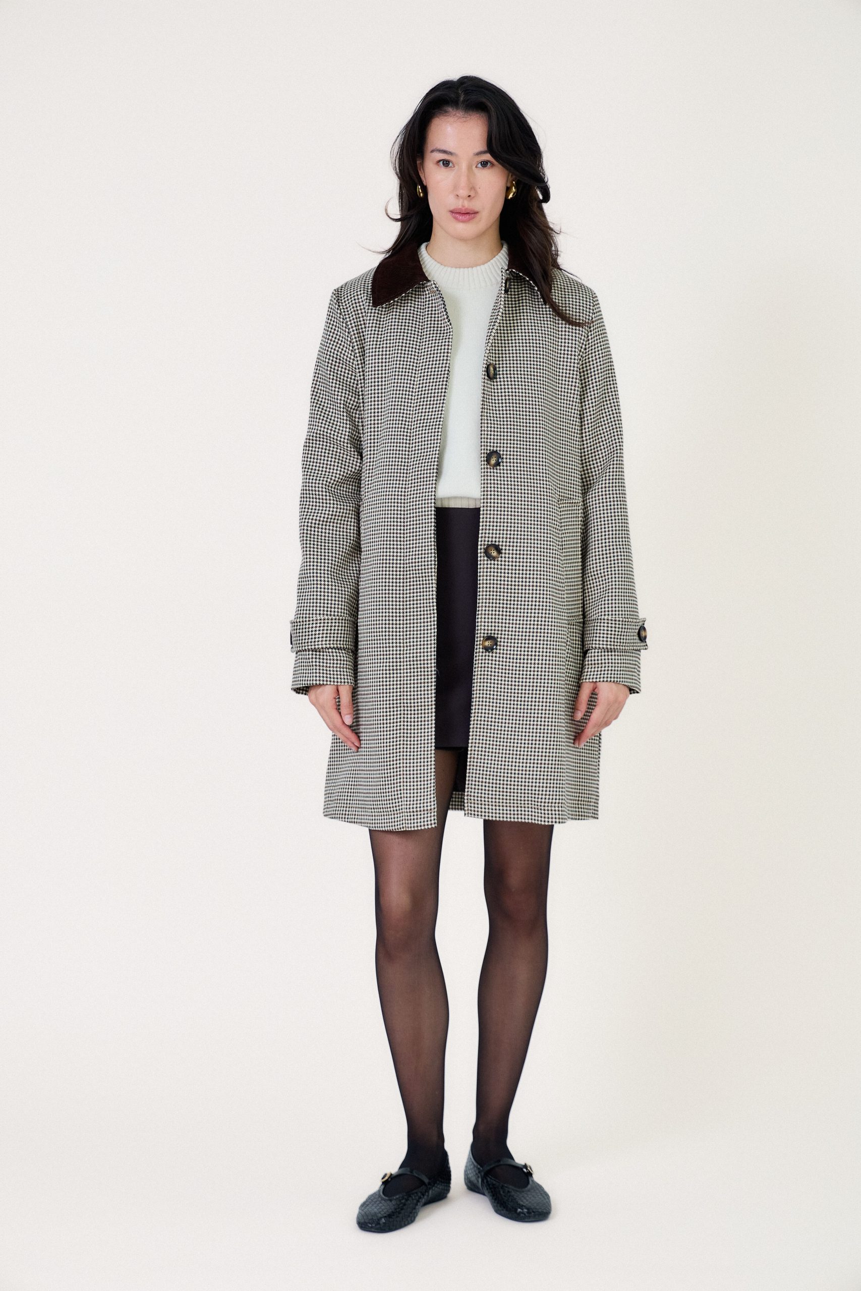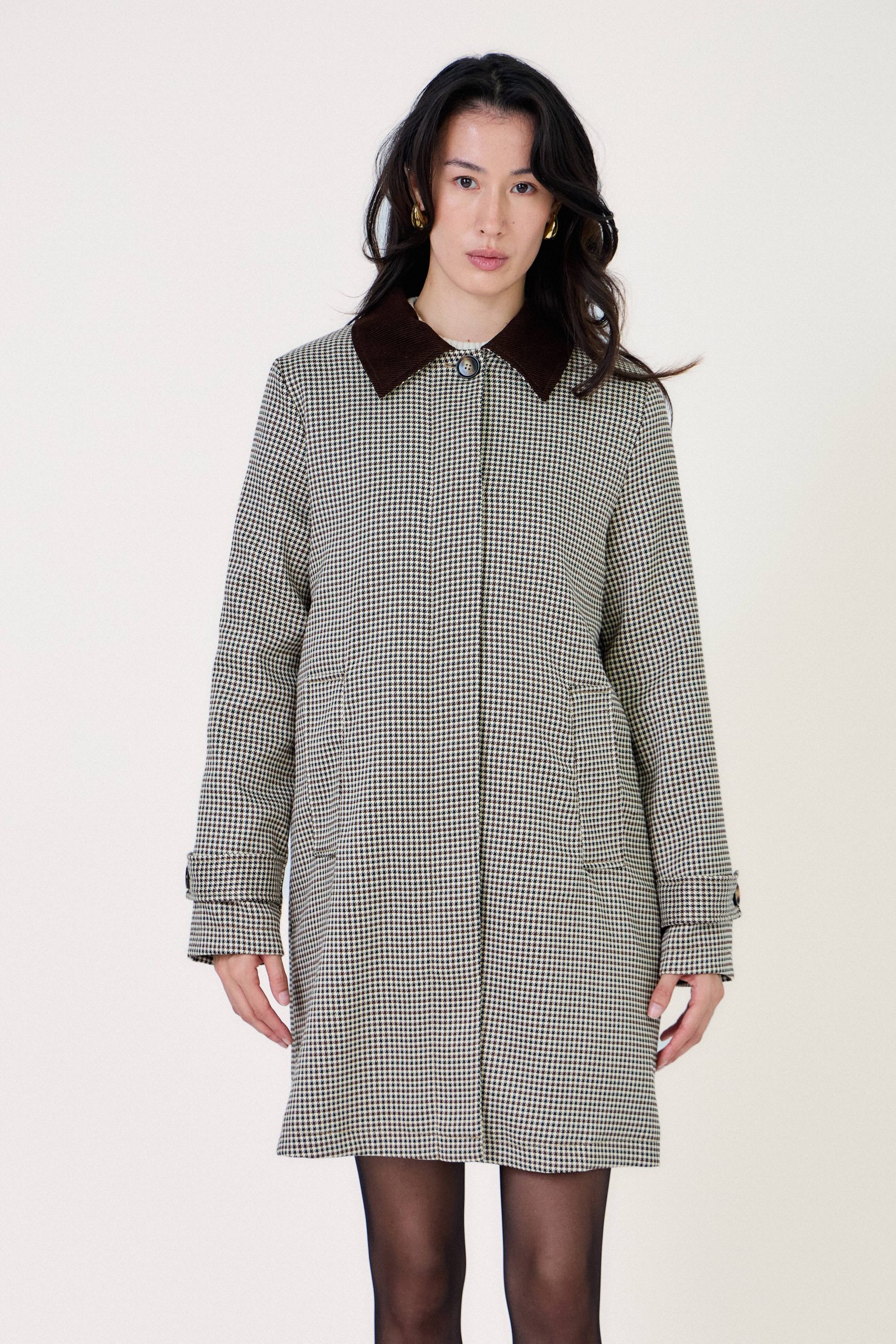 Trench long à bouton Coupe droite Col chemise contrasté en coton côtelé Tissu à motif carreaux Poches discrètes sur les côtés Poignets avec patte boutonnée Notre mannequin mesure 177cm et porte une taille S