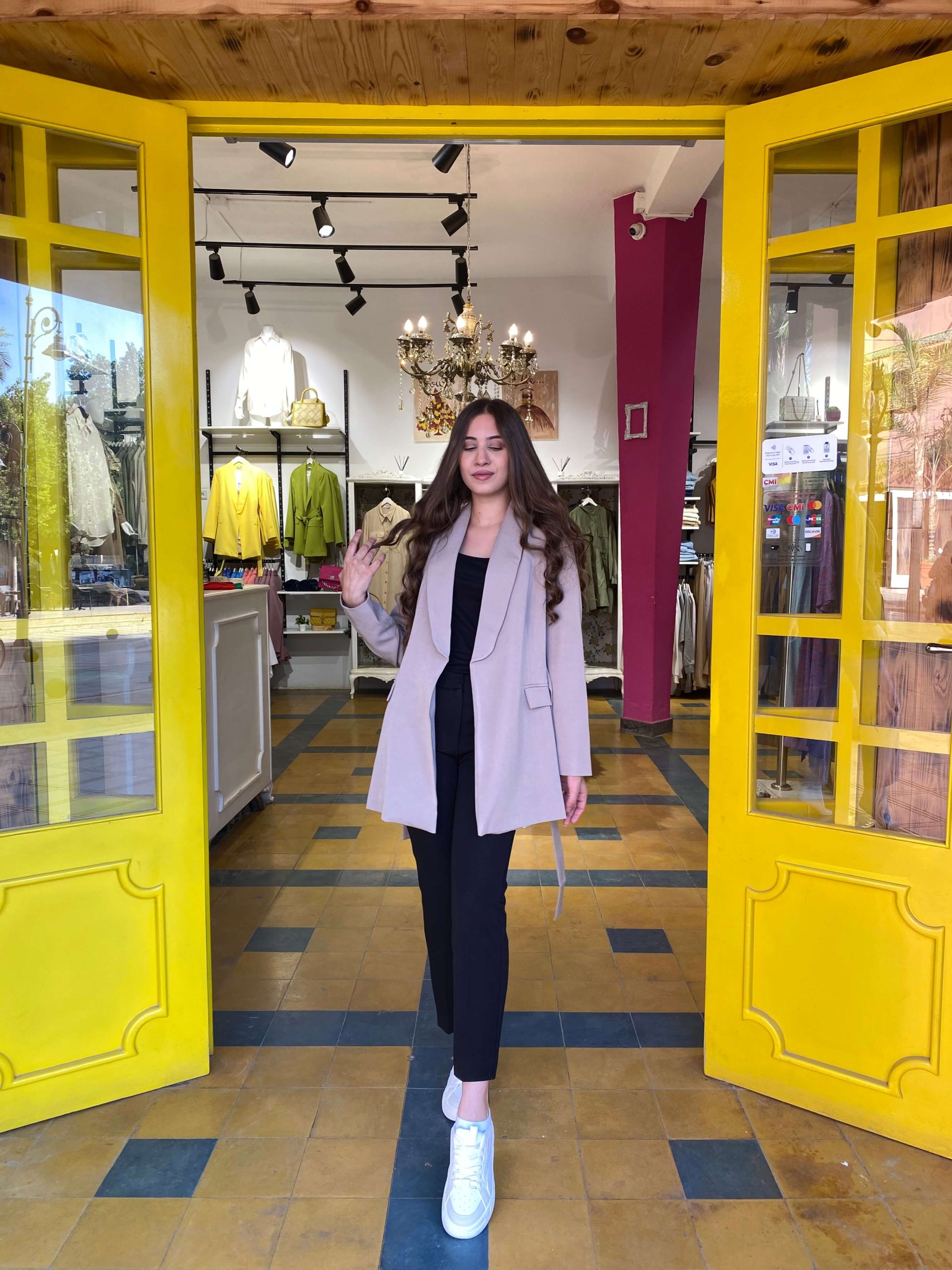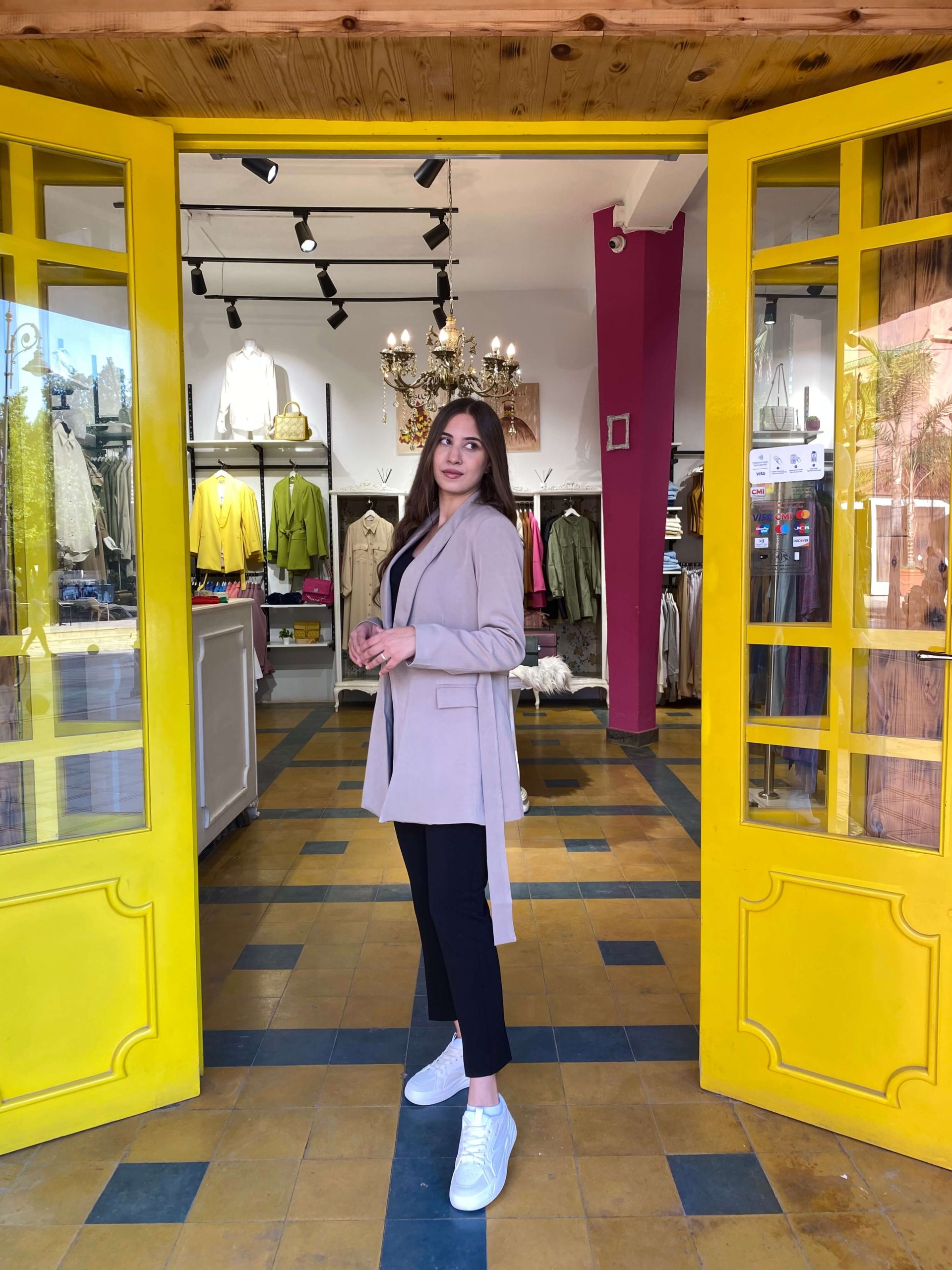 Veste blazer à col châle. Modèle qui se porte ouvert ou fermé avec ceinture . Présence de 2 poches décoratives. Intérieur en doublure. Dotée d’épaulettes.