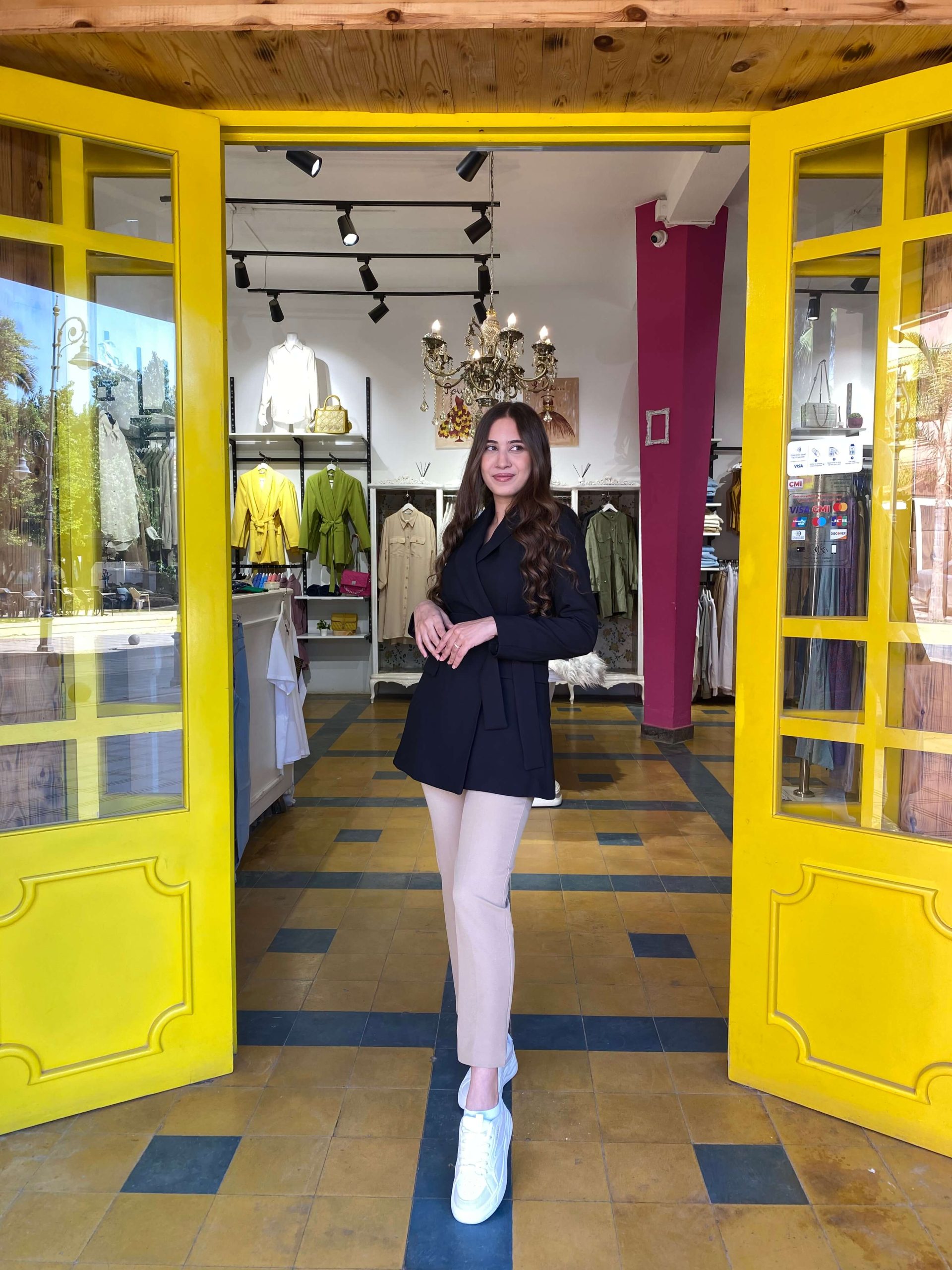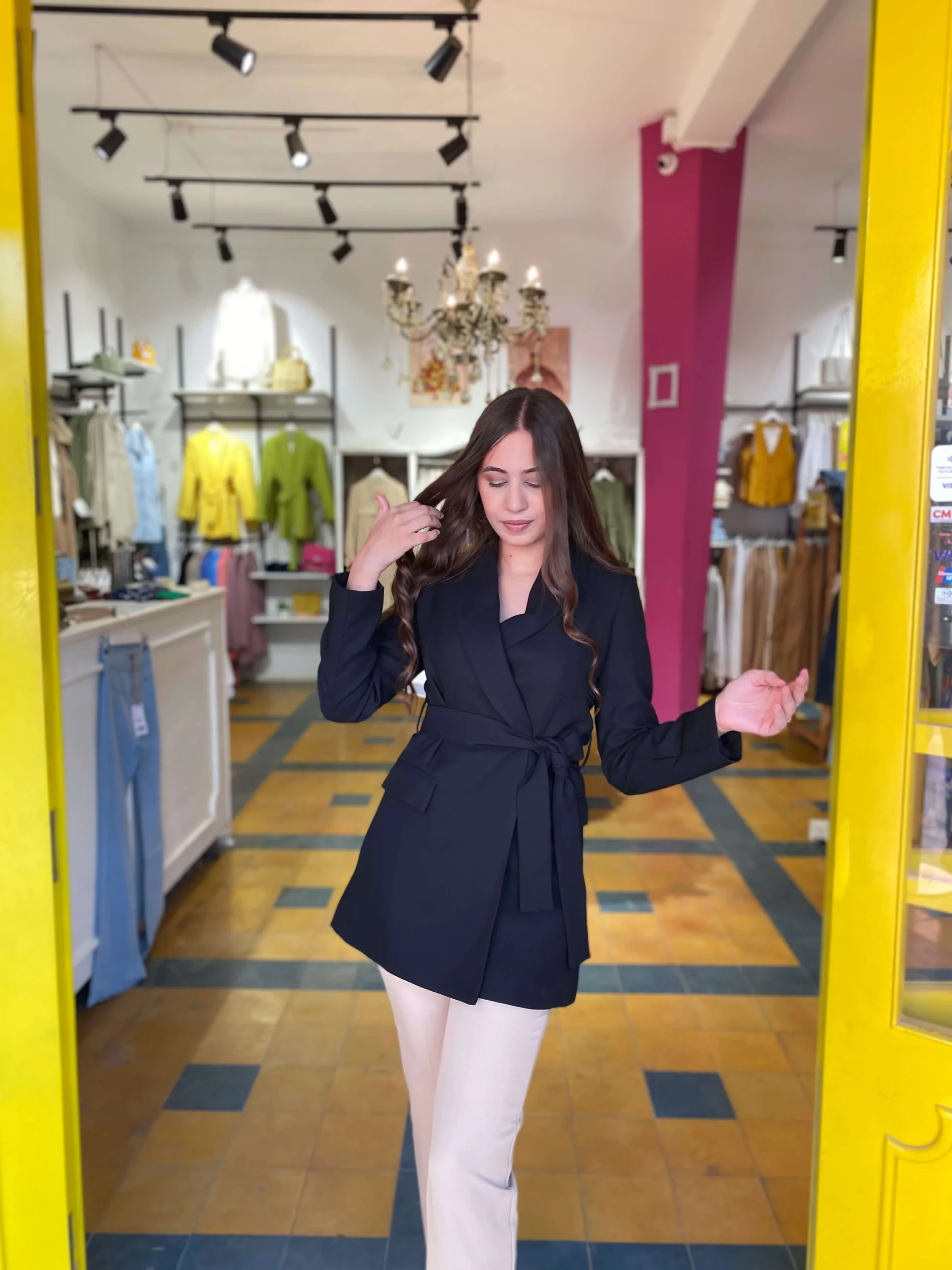 Veste blazer à col châle. Modèle qui se porte ouvert ou fermé avec ceinture . Présence de 2 poches décoratives. Intérieur en doublure. Dotée d’épaulettes.
