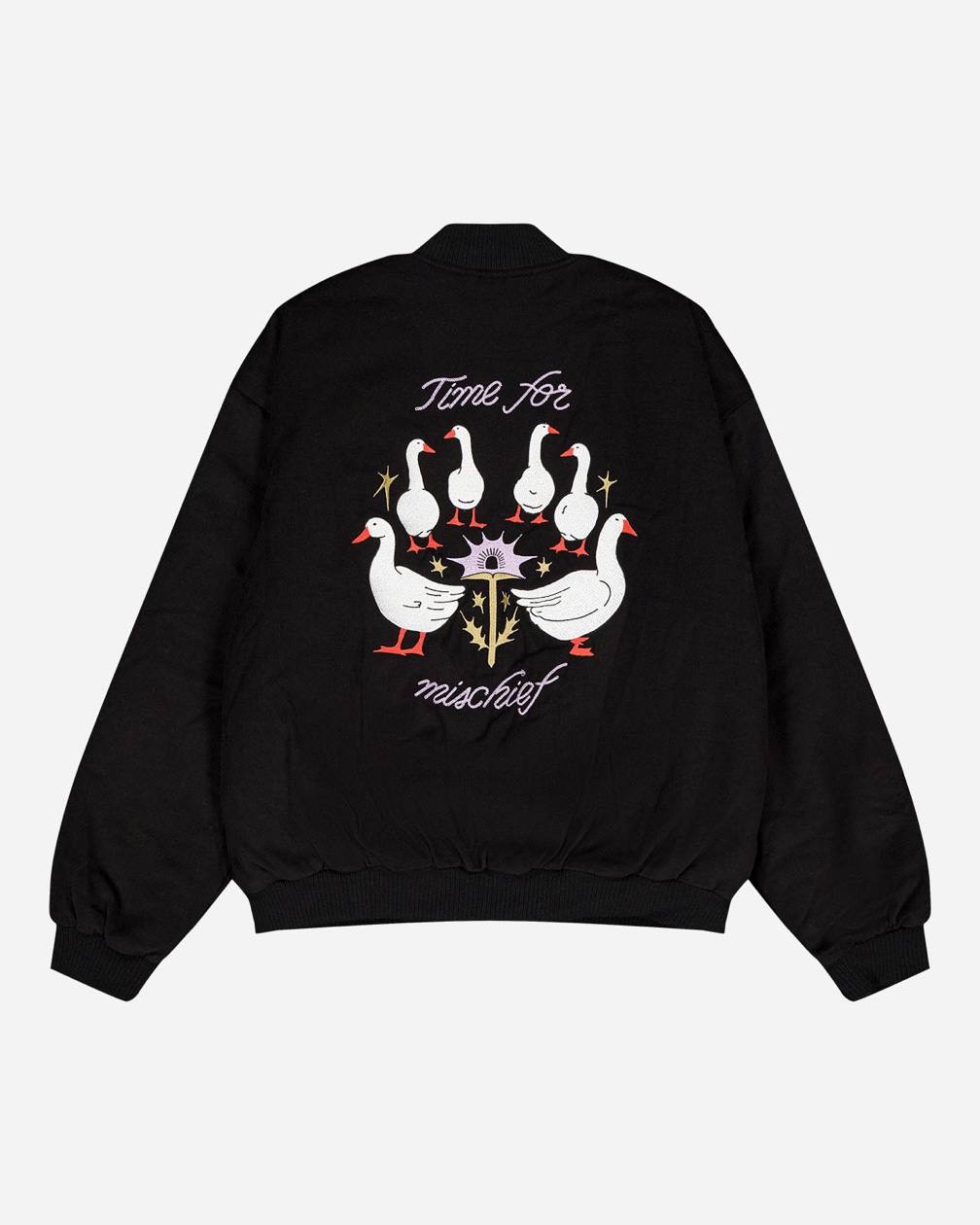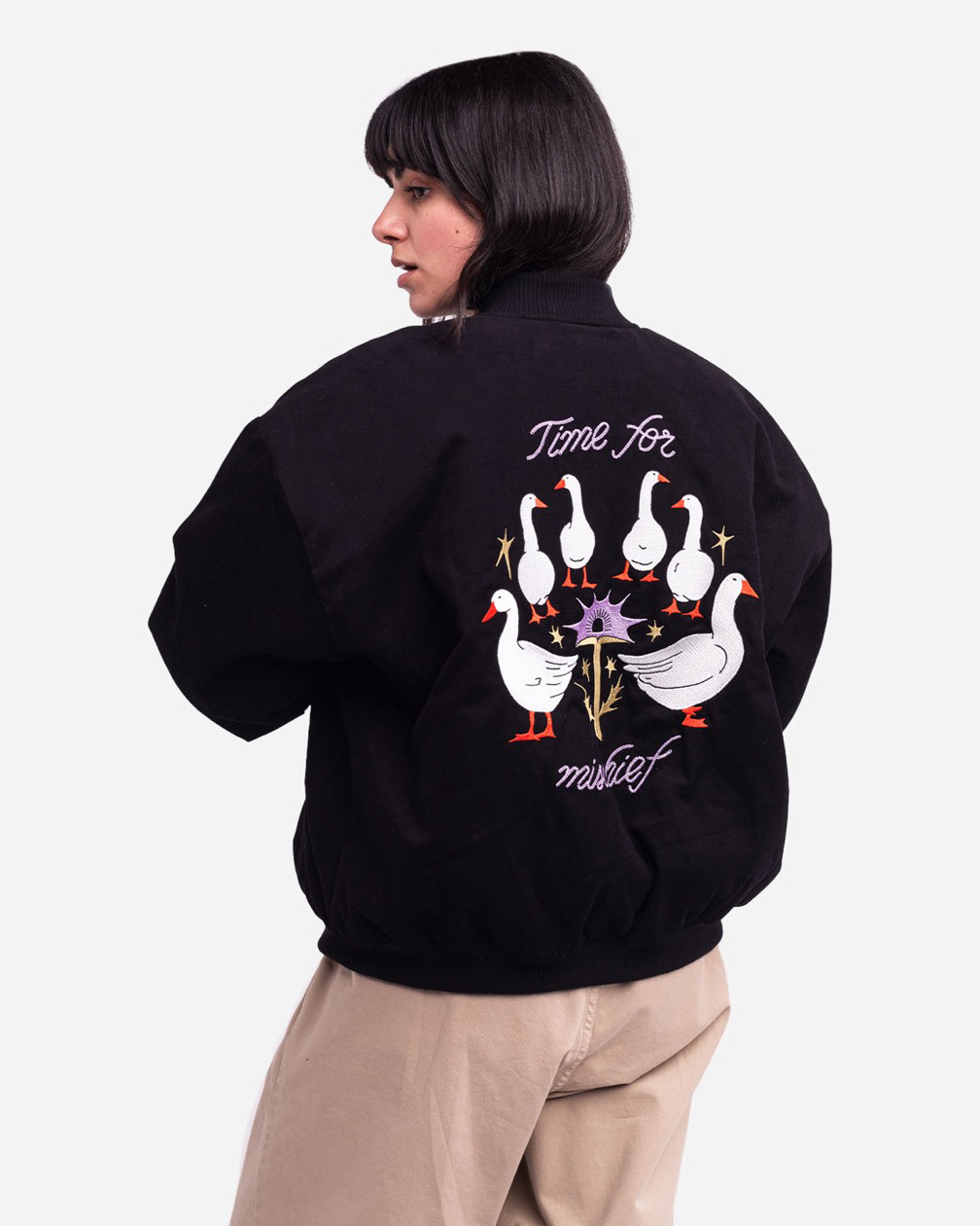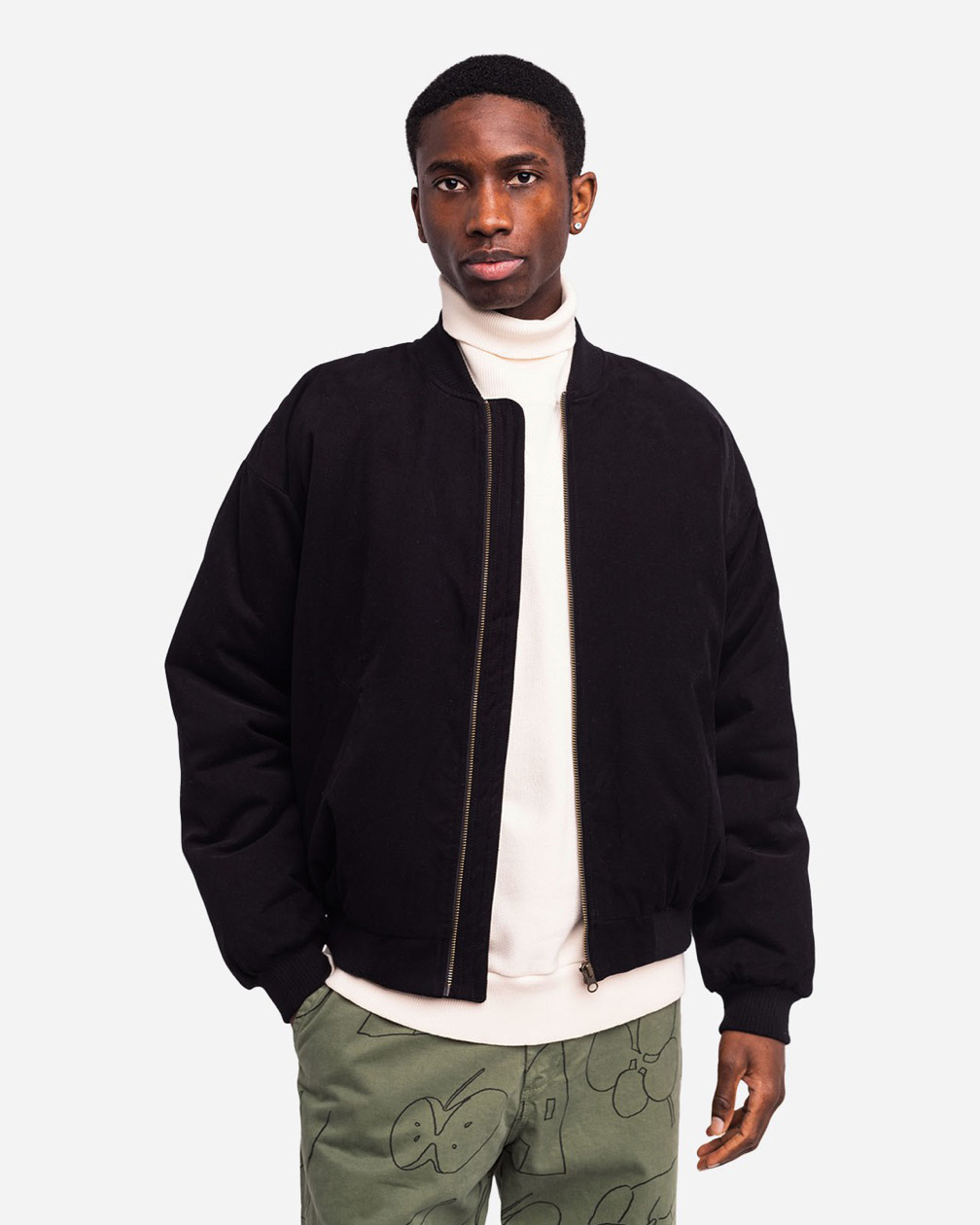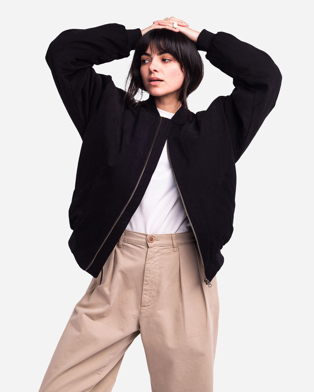 Ce blouson type bombers est fabriqué en coton biologique. Il se distingue par sa broderie dans le dos, signée Gabrielle Monceaux. Ses Bord-côtes, ses poches passepoilées et ses finitions soignées en font une pièce confortable pour la mi-saison. Coloris : Noir Composition : 100% Coton Biologique Coupe ample type bombers Deux poches passepoilées Poignets et bas en finition bord-côte Broderie dans le dos par l’Artiste Gabrielle Monceaux Fermture Zip YKK Fabriqué au Portugal