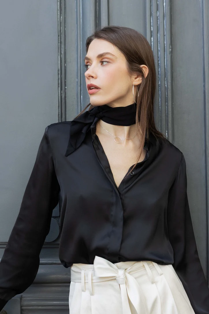 Die Bluse Benita ist aus einem fliessenden, luftigen Kreppstoff gefertigt.