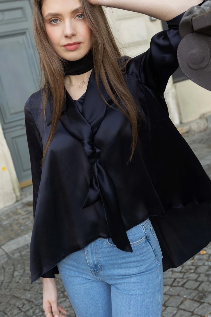 Der Halsausschnitt wird durch ein stilvolles Bindedetail betont, das auf verschiedene Weise gestylt werden kann, um Ihr Outfit zu personalisieren.