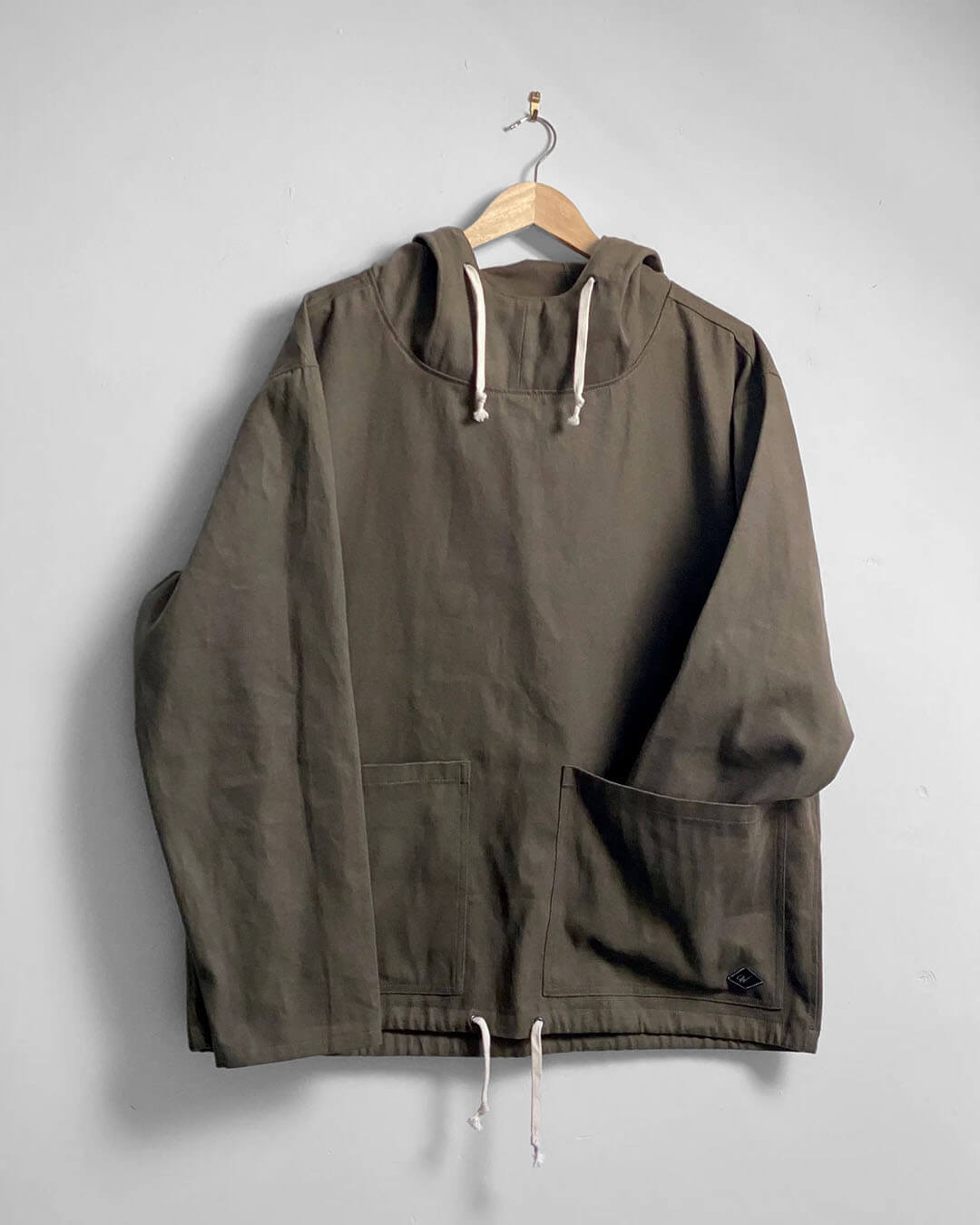 Cadder Smock Clay de Whitehill Mercantile. Vareuse artisanale avec capuche en coton, coupe ample et confortable, fabrication à la main en Écosse. Idéal pour un style workwear décontracté et durable.