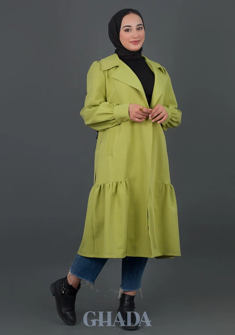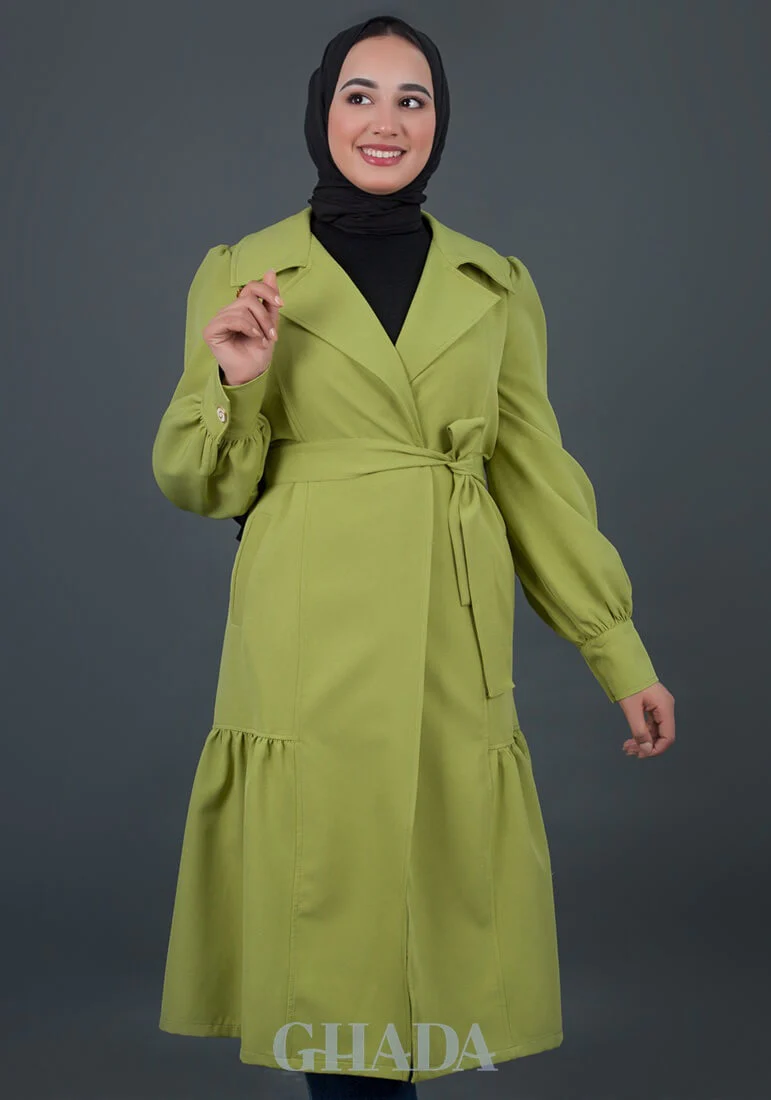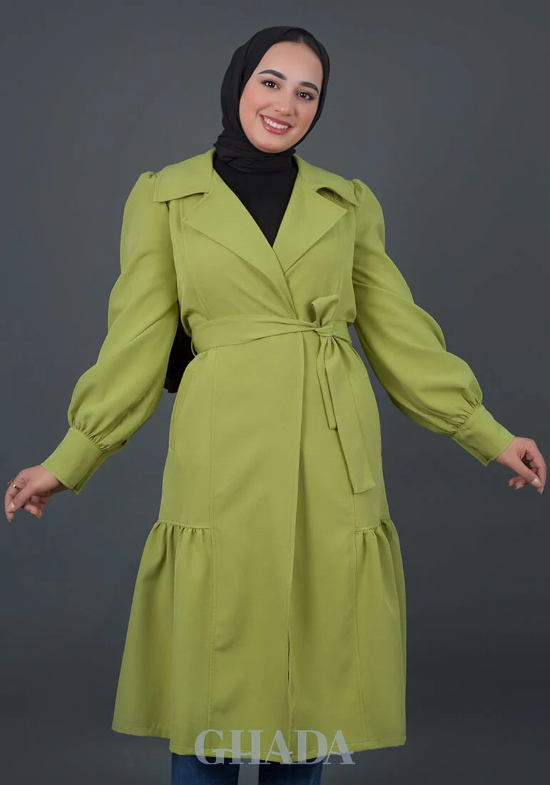cardigan en vert pistache avec ceinture et des fronces au bas.