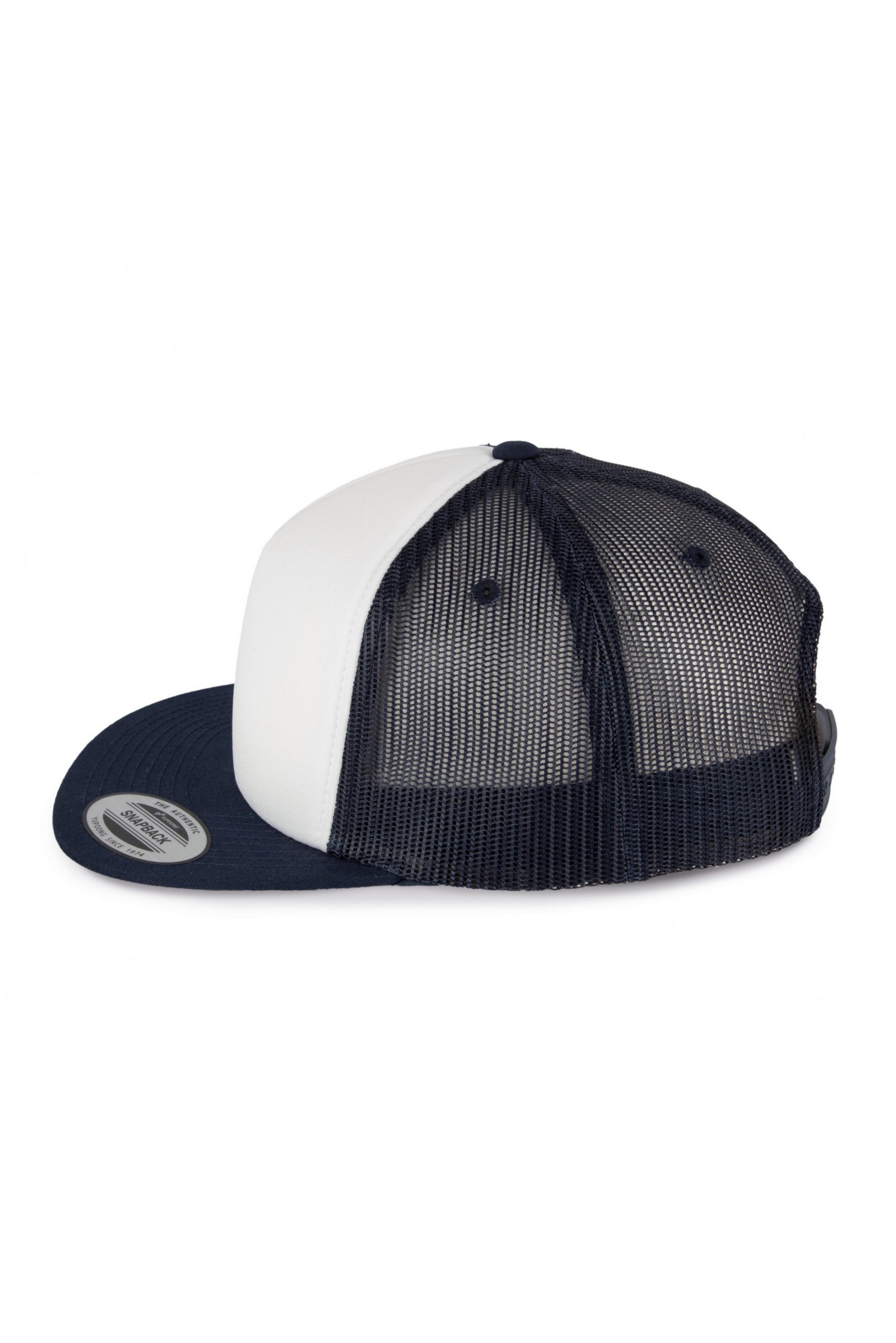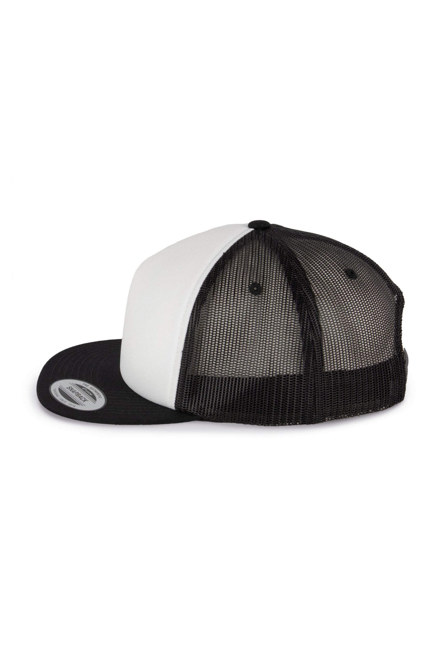 60% coton / 40% polyester. 5 panneaux. Modèle Trucker classique avec mousse de haute qualité. Enduction spongieuse sur panneau avant (ép. 6mm), idéal pour l’impression ou la broderie. Languette de réglage en plastique.