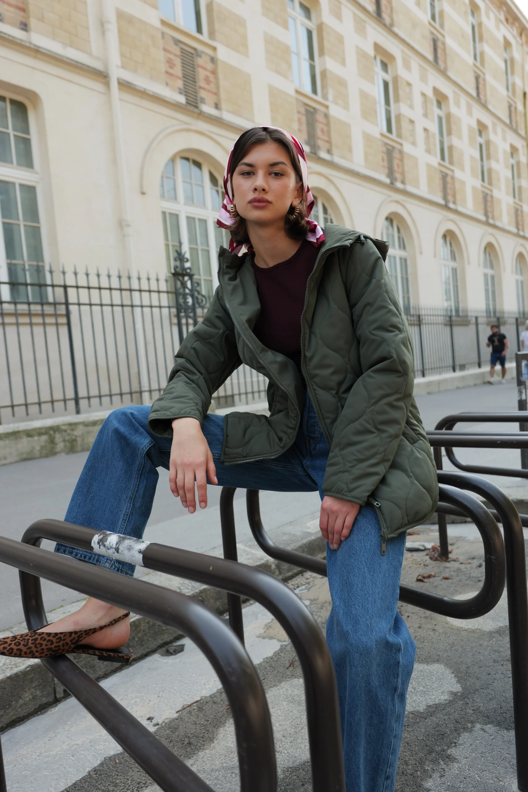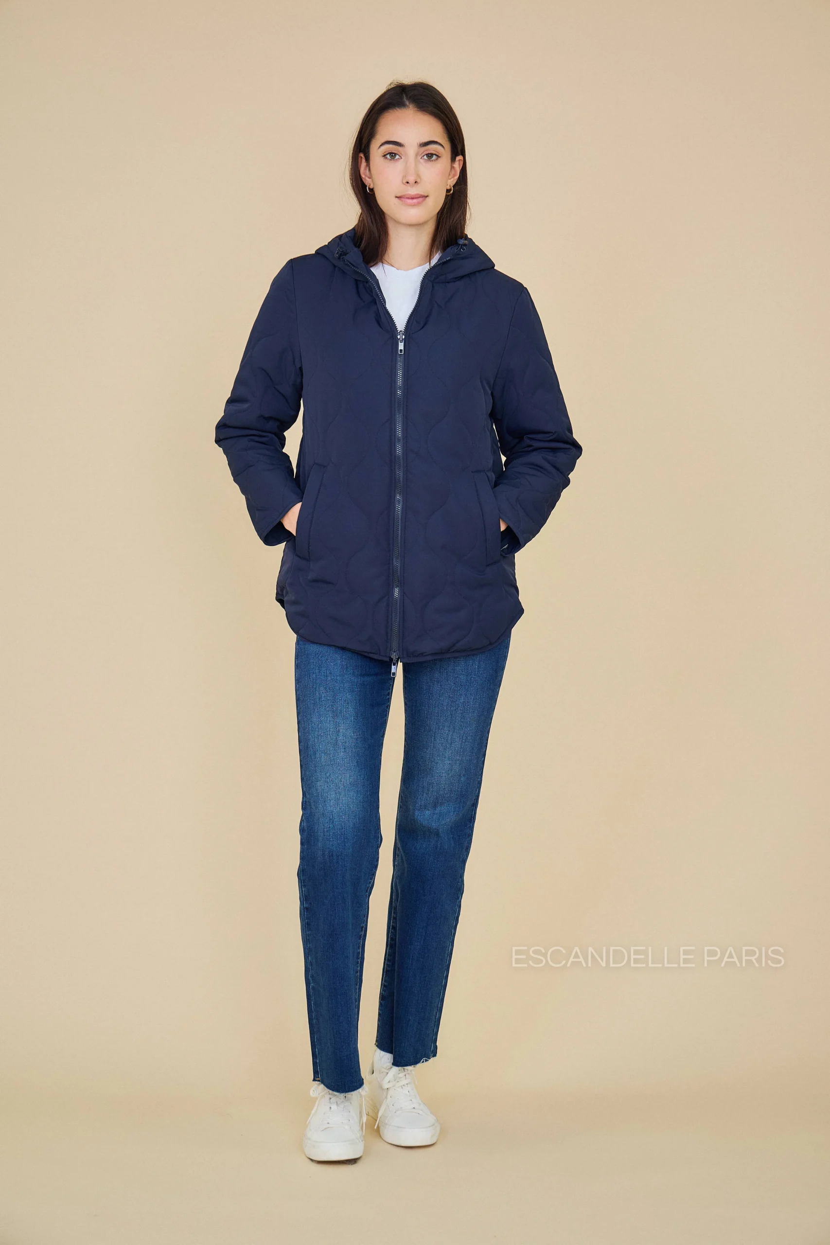 Veste mi-longue matelassée Réversible et imperméable Capuche Fermeture à zip sur le devant 2 poches latérales zippées sur le devant Un côté matelassé et un côté lisse Notre mannequin mesure 178cm et porte une taille S