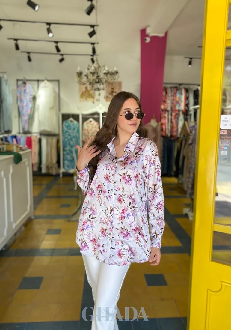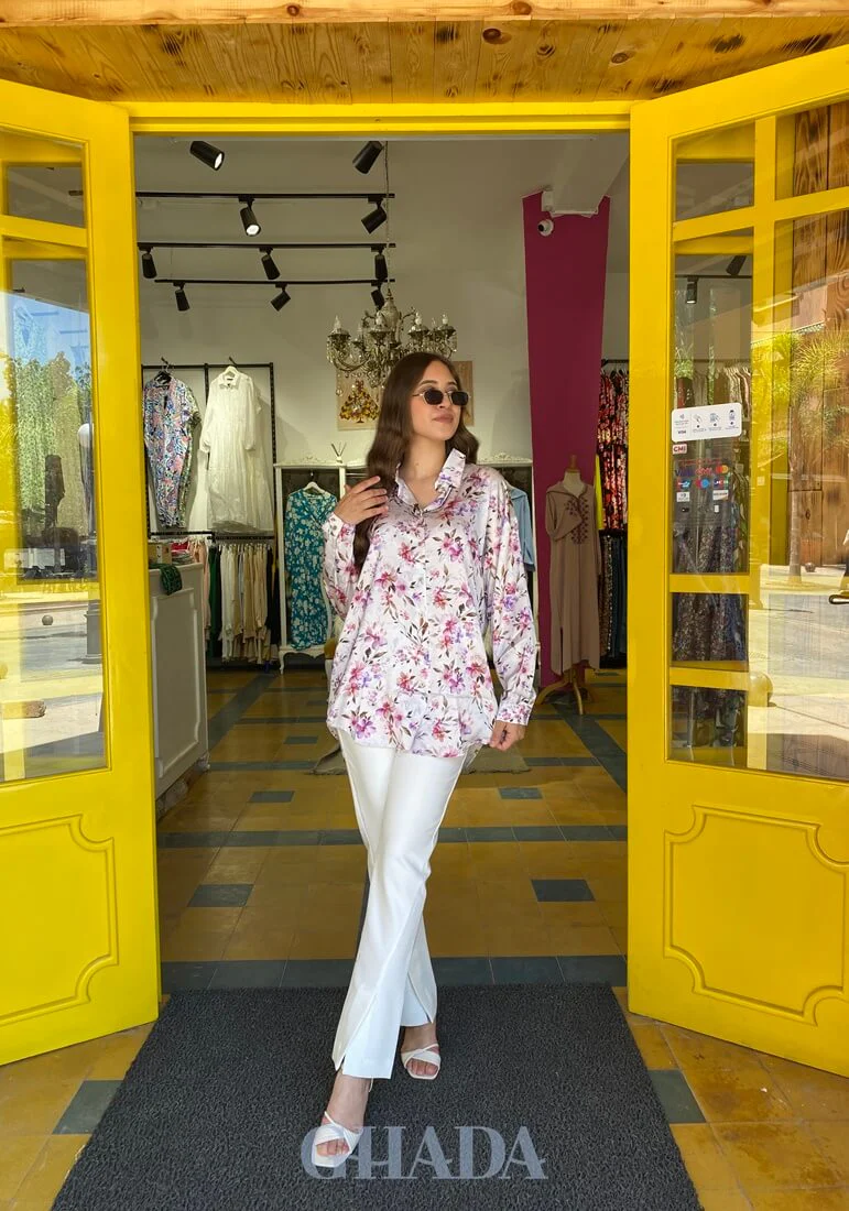 Chemise blanche imprimée La mannequin mesure 1m70 et porte la taille S Fabrication 100% marocaine