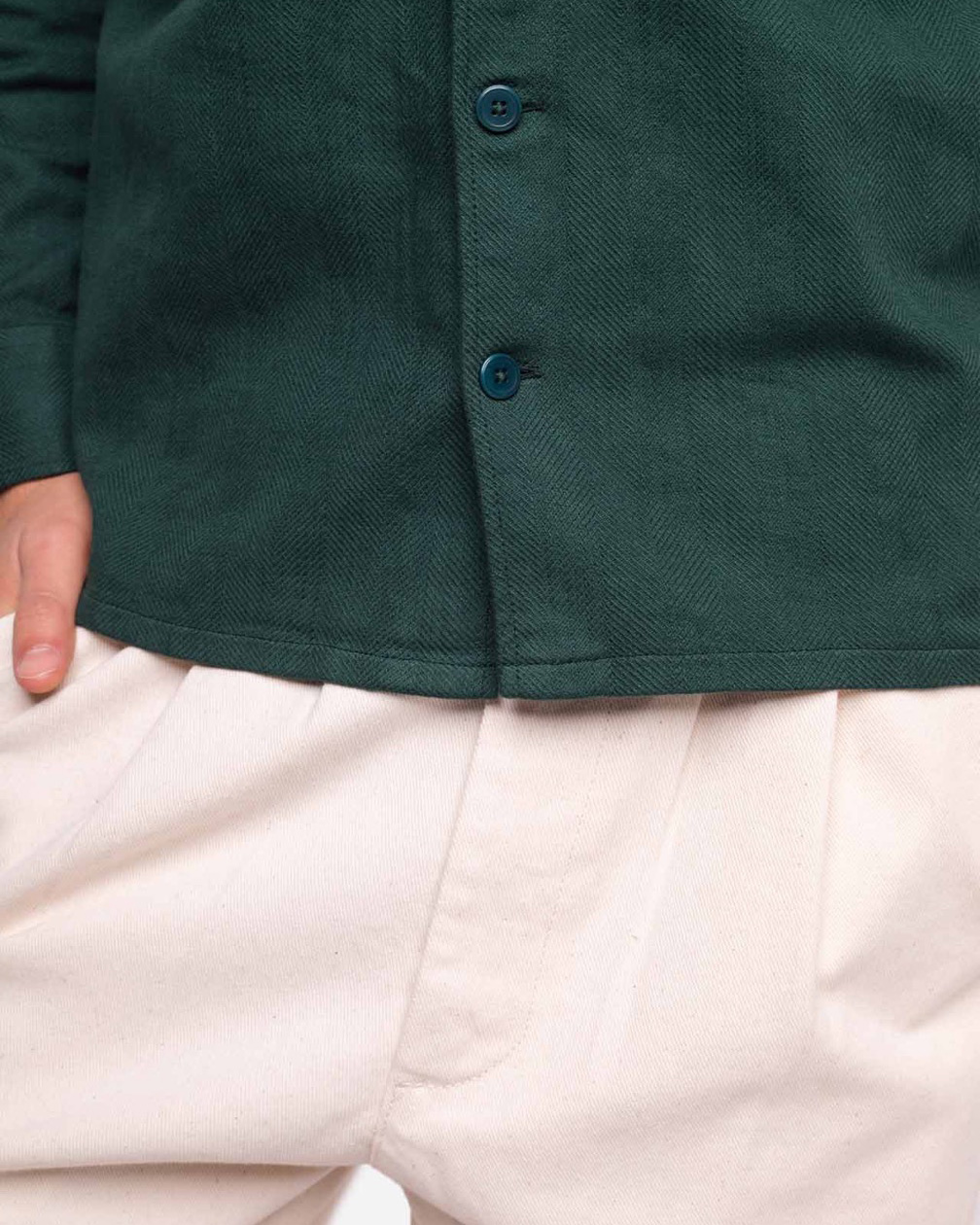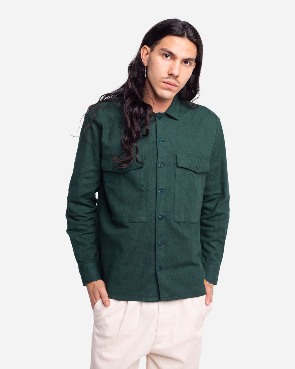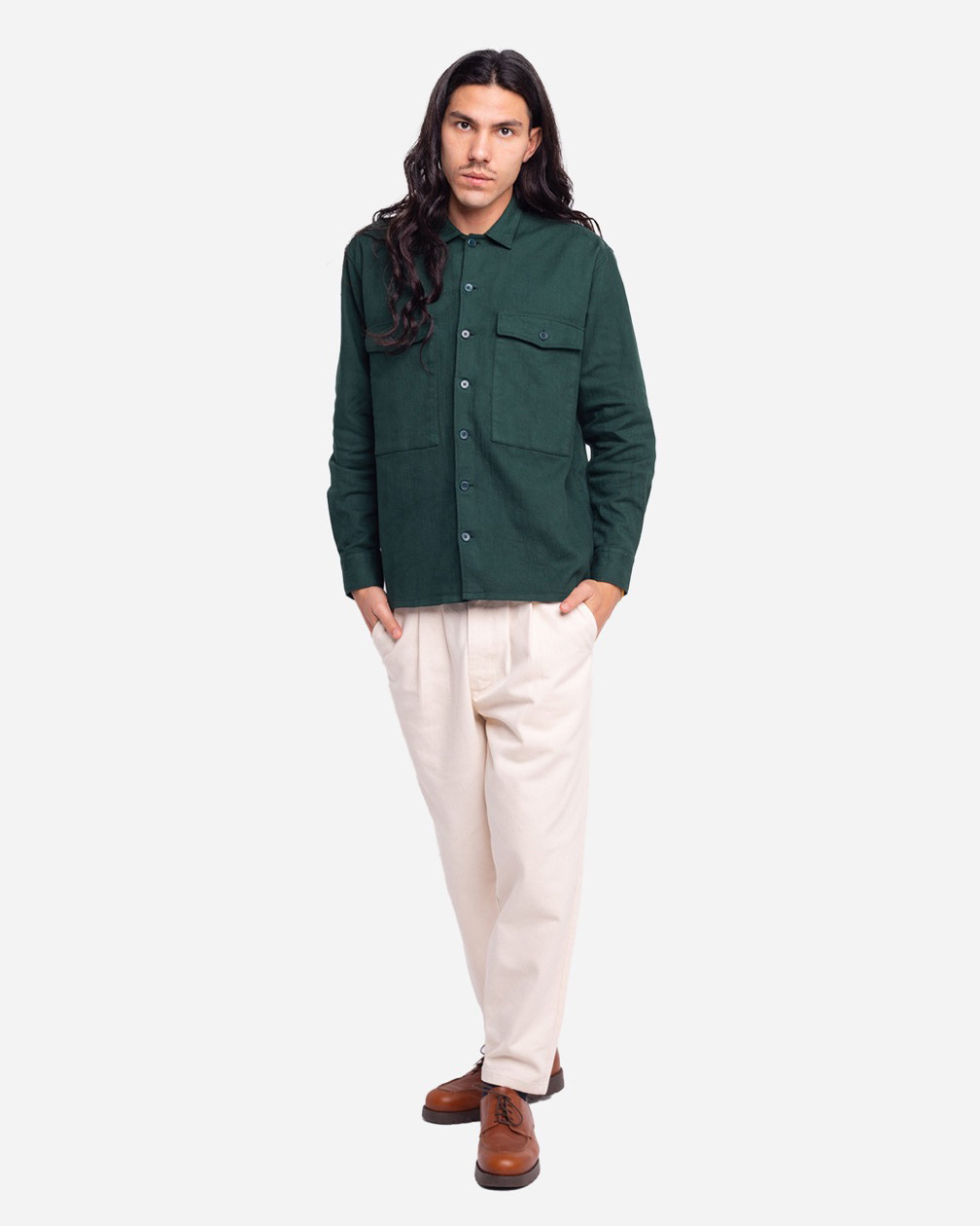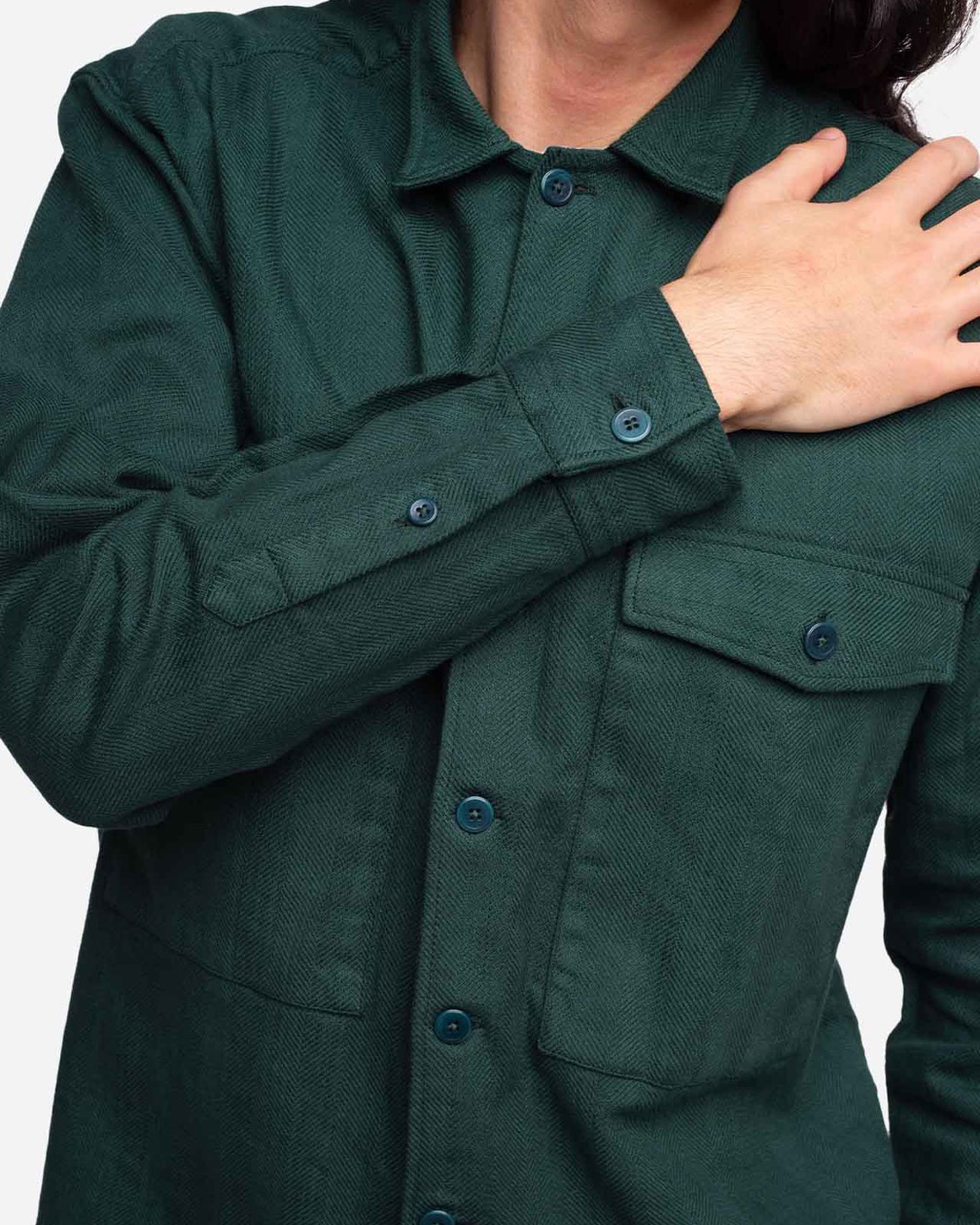 Une chemise bien robuste d’inspiration workwear, qu’on peut porter comme une veste à la mi-saison ou en chemise quand arrive l’hiver Coloris : Vert Forêt Composition : 99% coton 1% élasthane Coupe ample Boutons en corozo Poche poitrine plaquée avec rabat Fabriqué au Portugal
