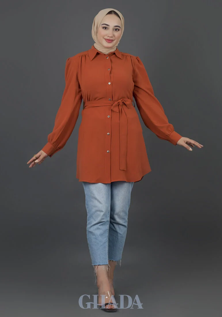 Chemise en orange avec des boutons métallique et une ceinture