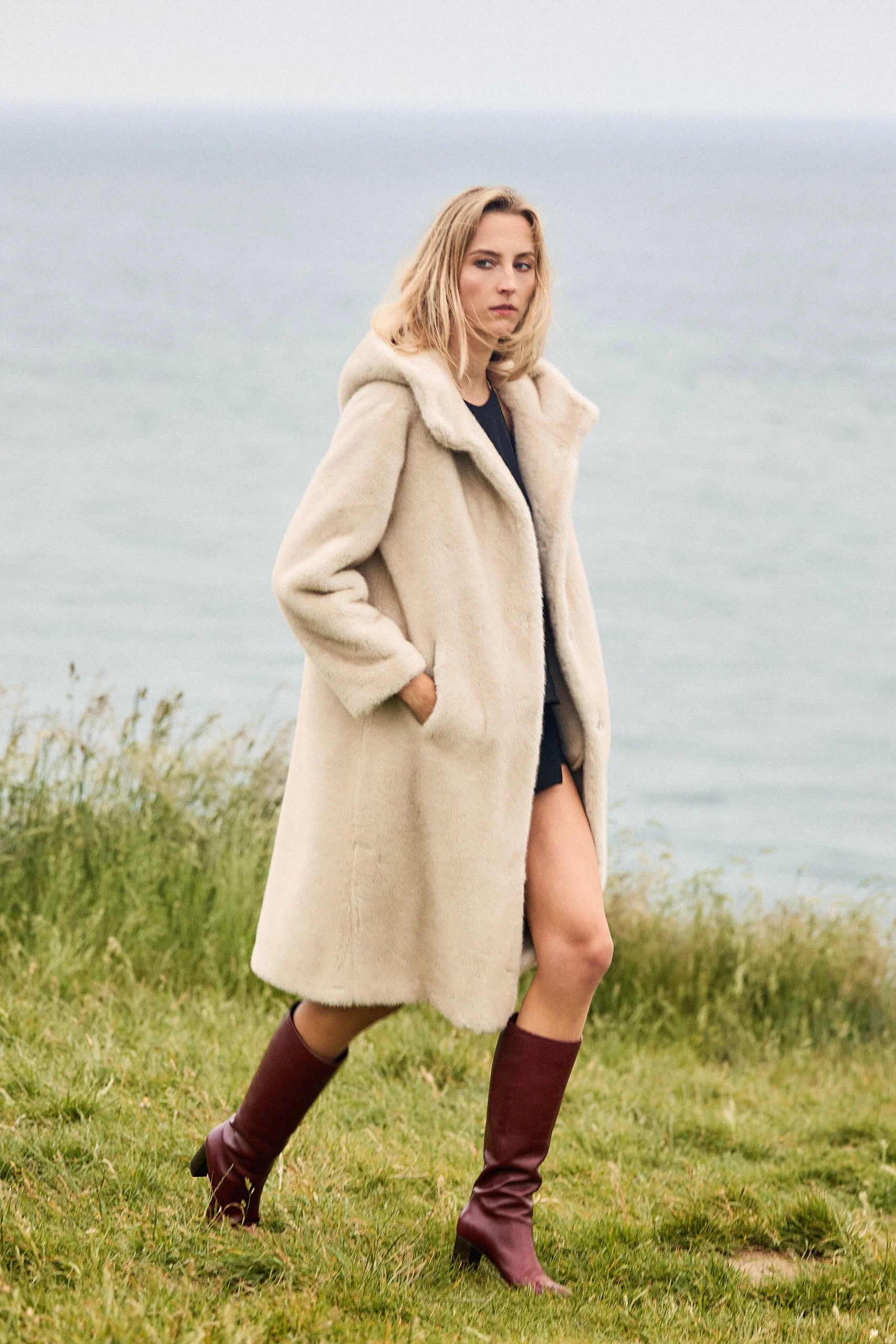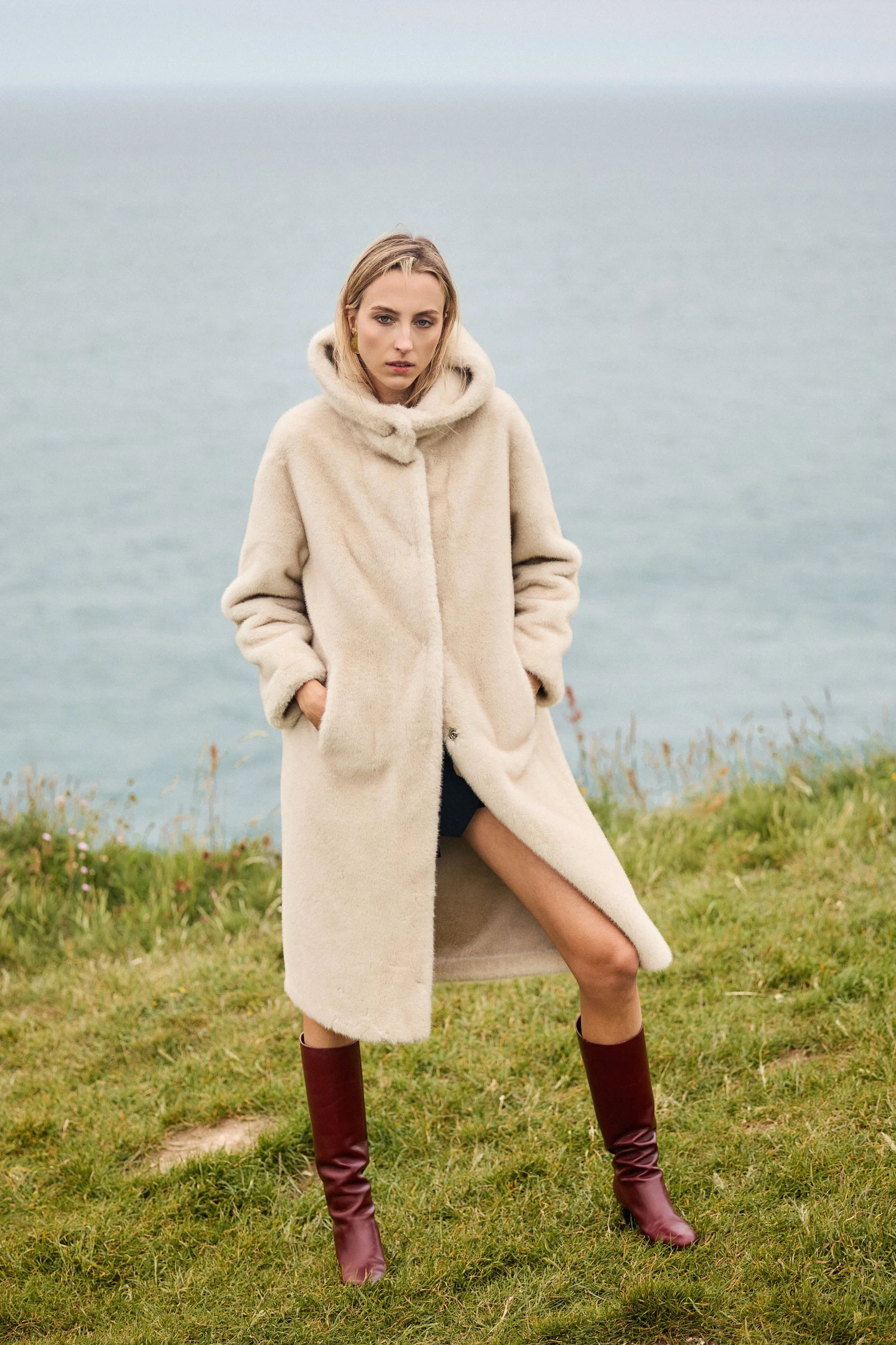 Manteau long avec capuche en fausse fourrure ultra-douce Coupe droite et ample Large col tailleur structuré Fermeture à pression Poches plaquées sur les côtés Conseil taille : prenez une taille en dessous de votre taille habituelle Notre mannequin mesure 177cm et porte une taille S