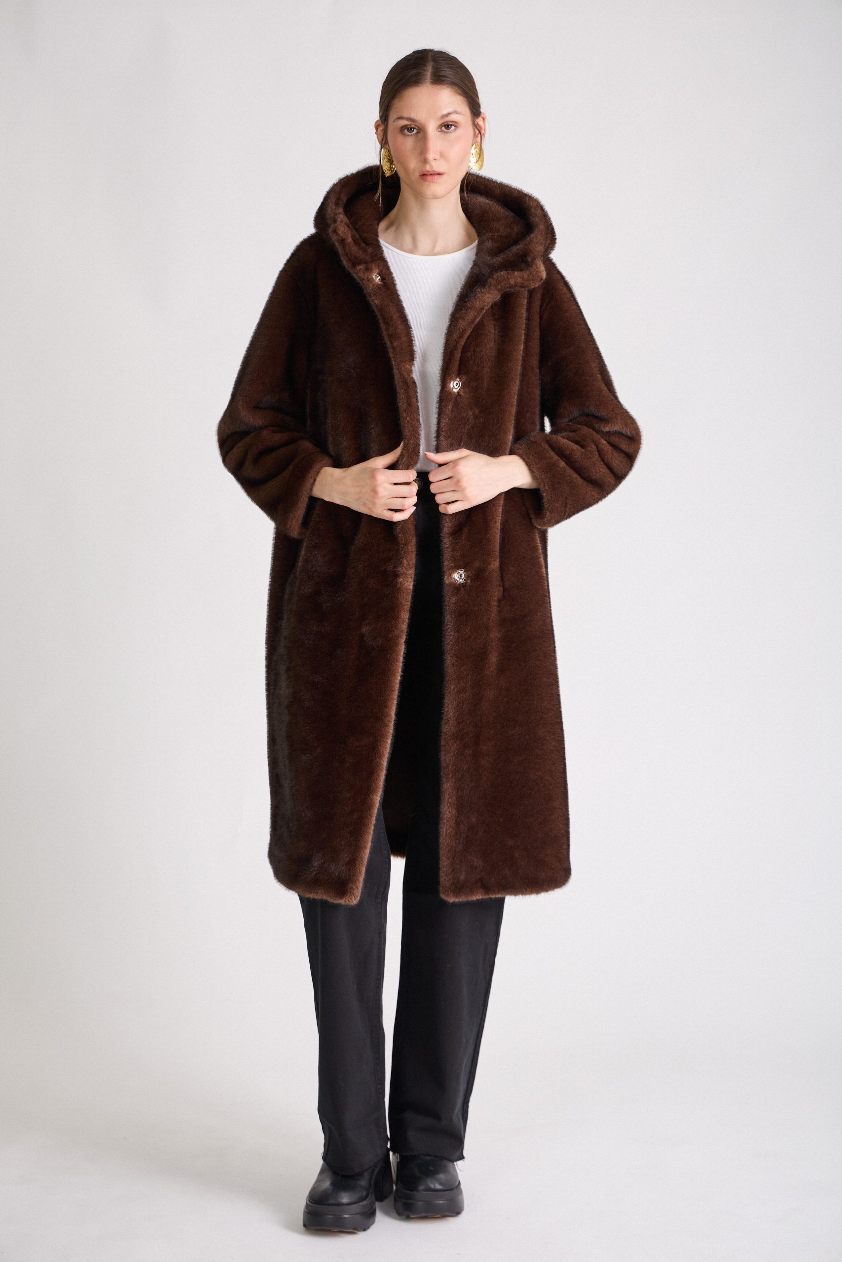 • Manteau long avec capuche en fausse fourrure ultra-douce