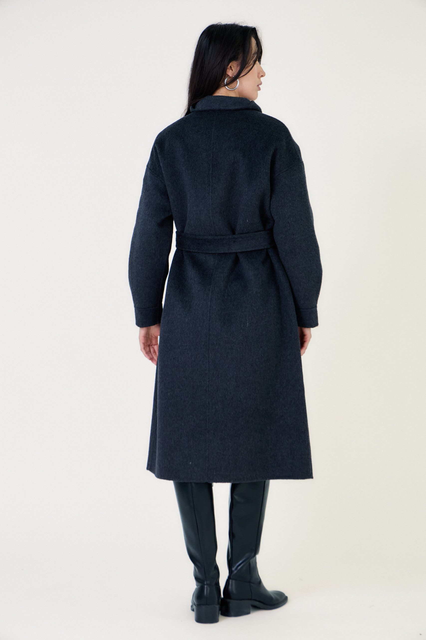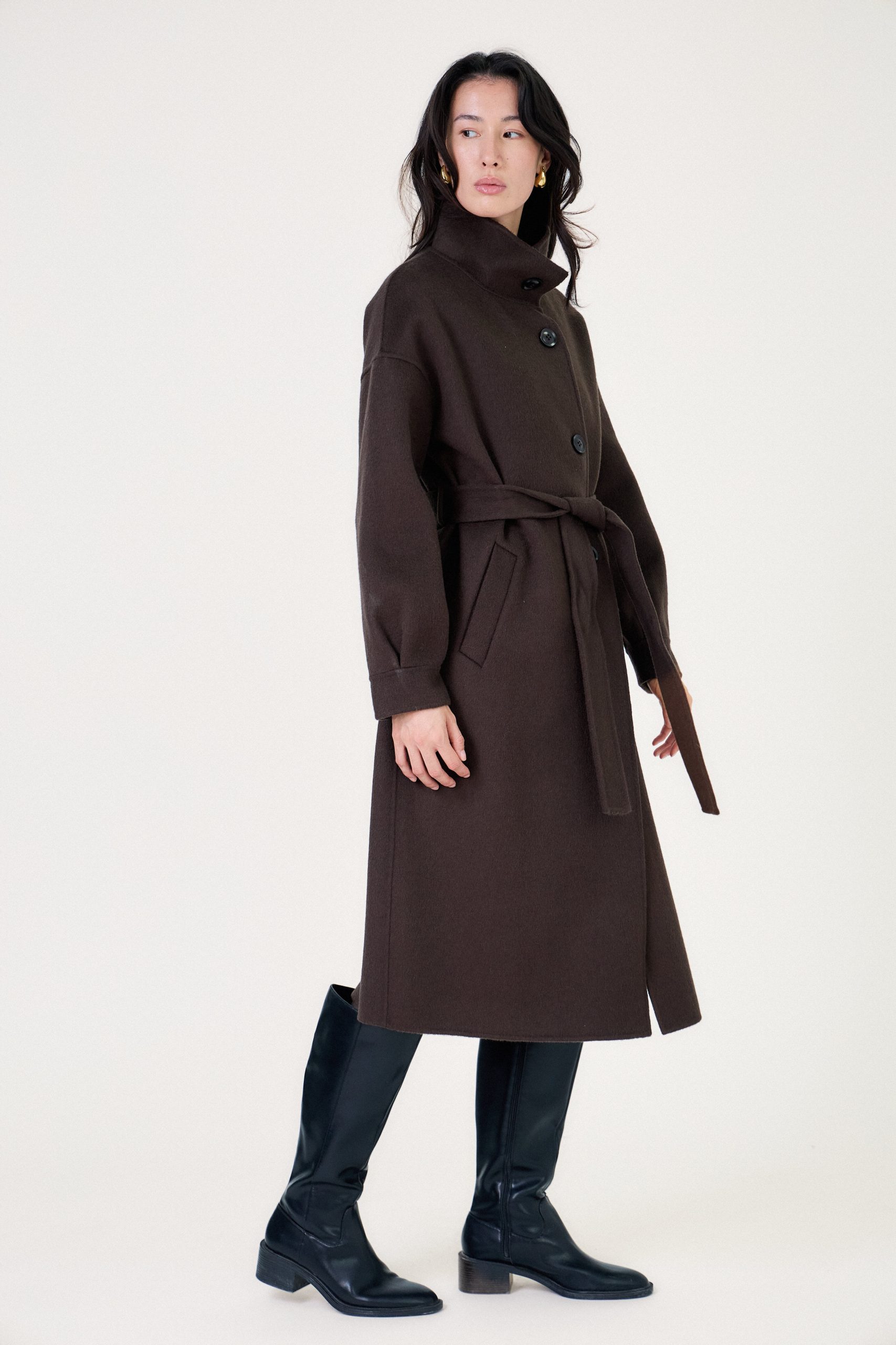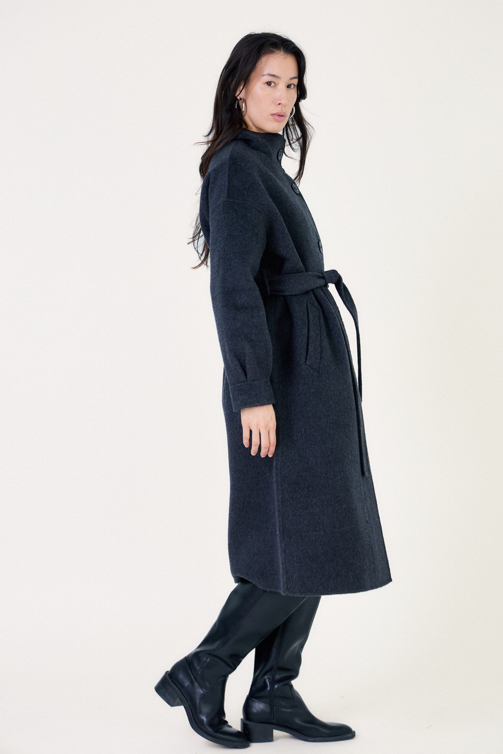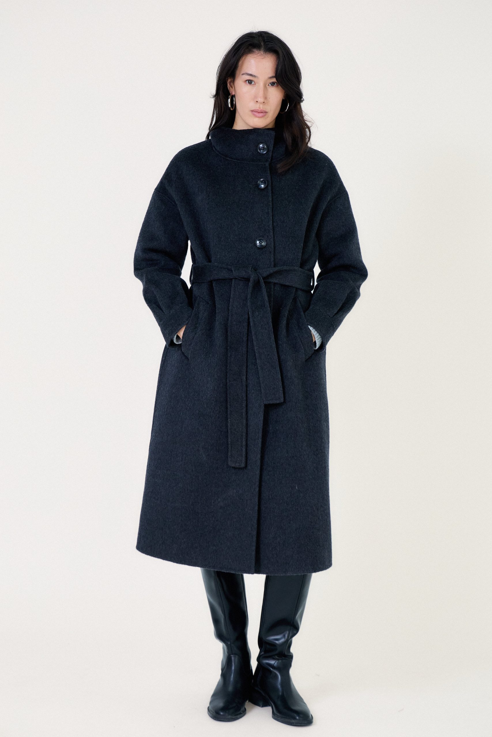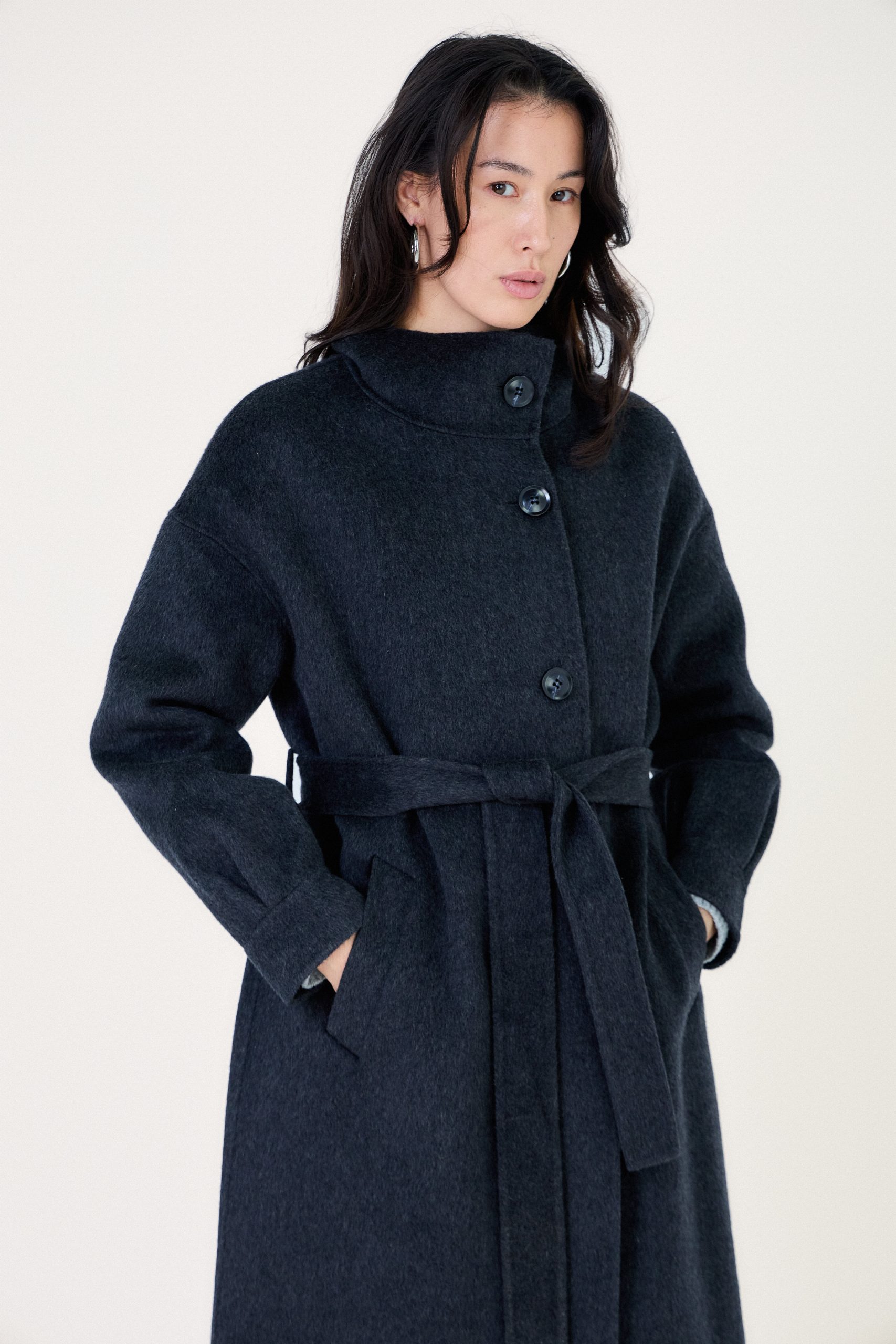 Manteau long en laine Finition main Col montant boutonné Ceinture à la taille Poches discrètes Conseil taille : prenez une taille en dessous de votre taille habituelle Notre mannequin mesure 177cm et porte une taille S