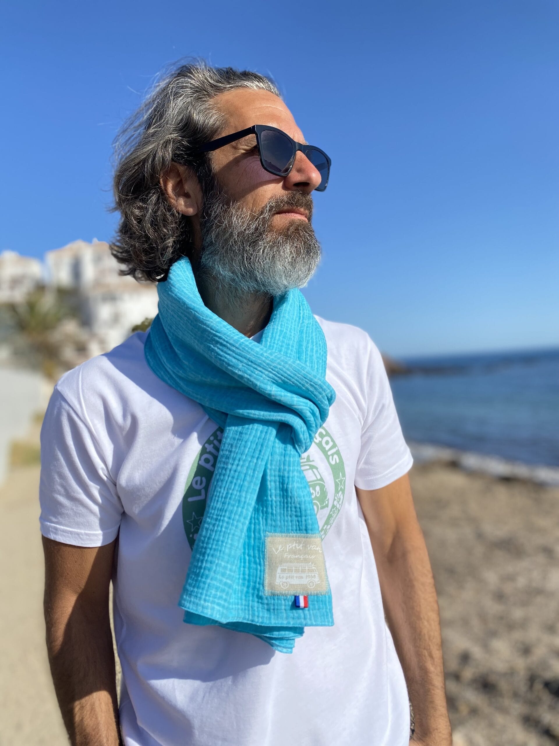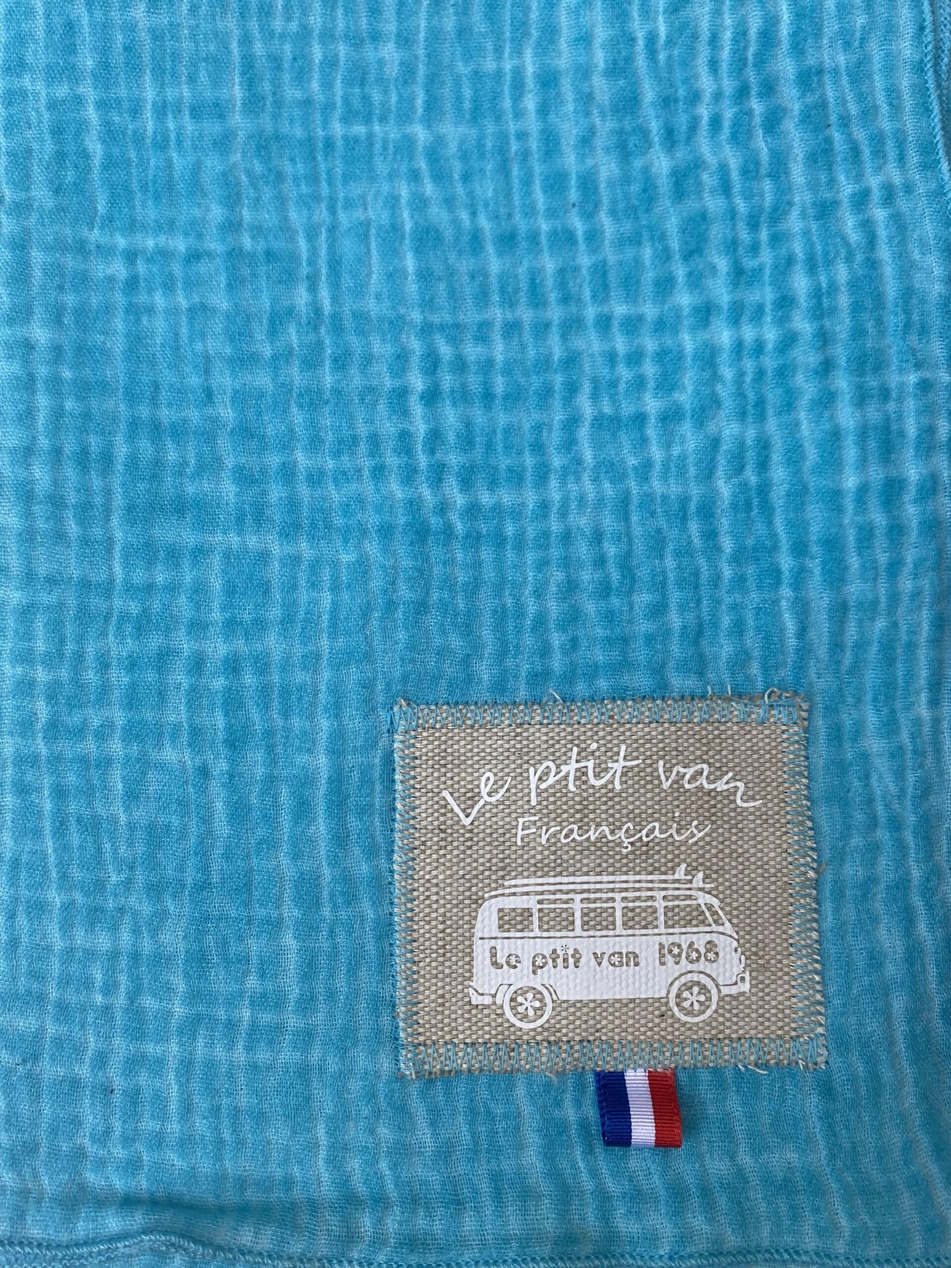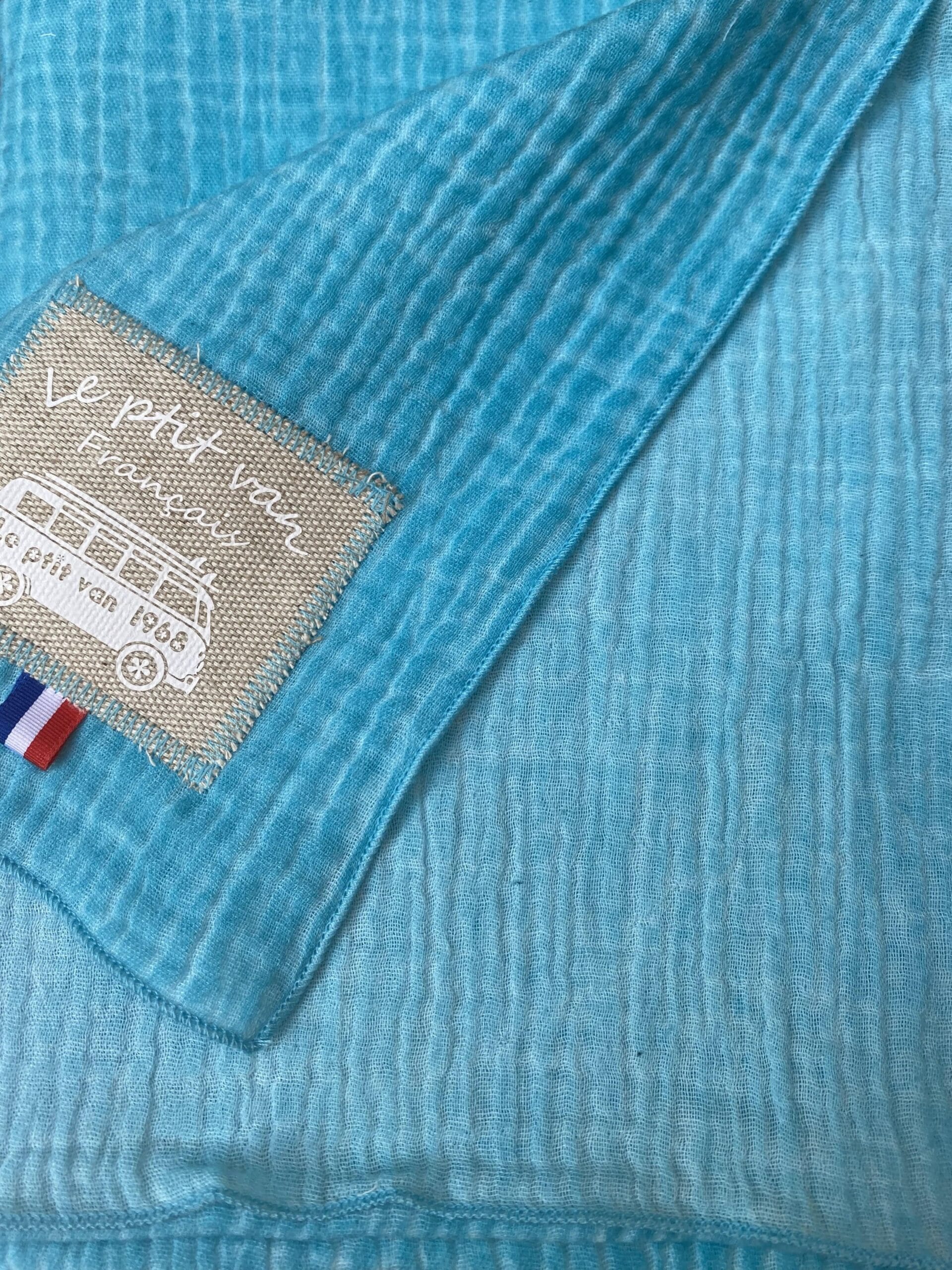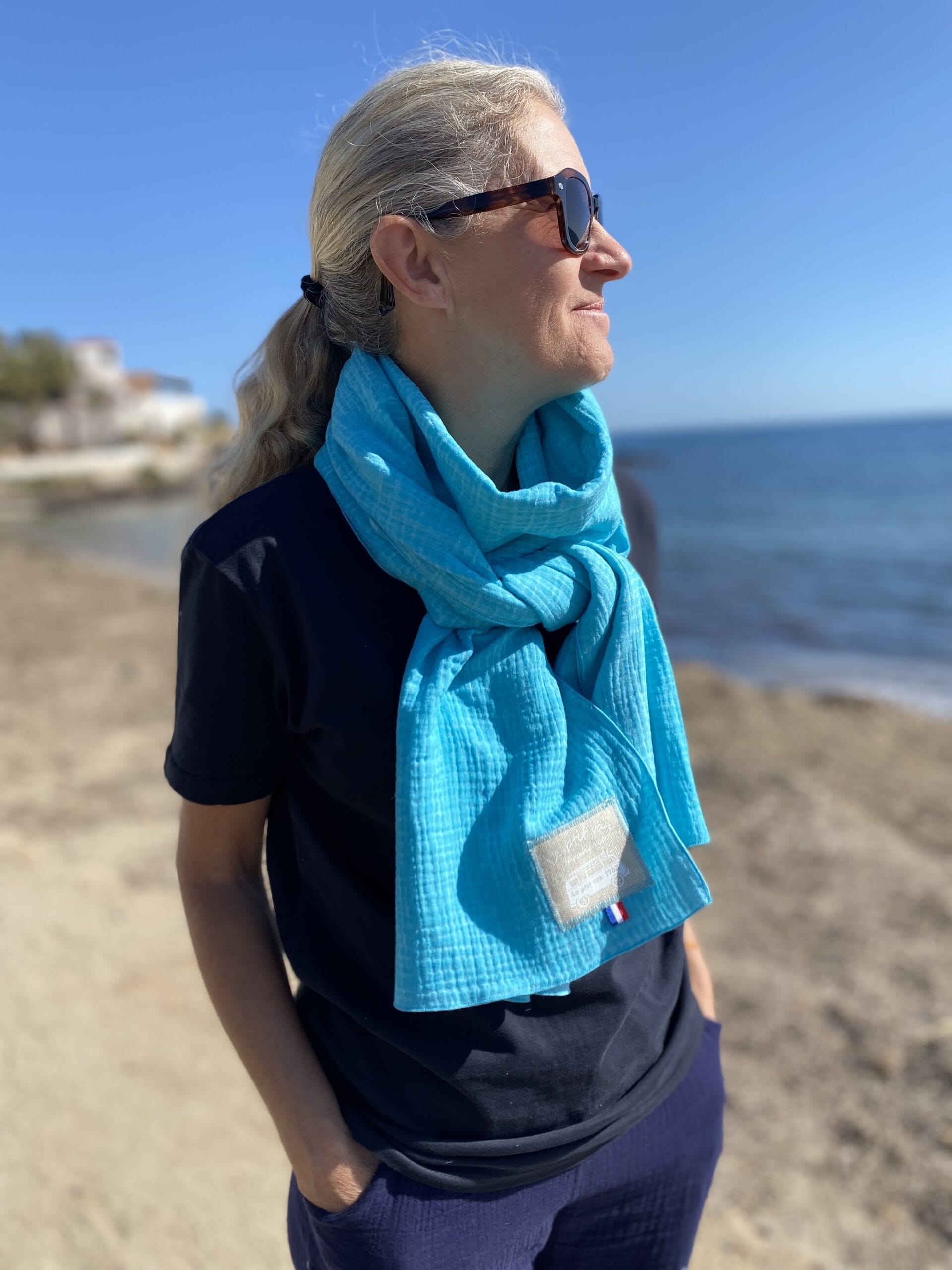 Découvrez l’écharpe Dune Agua bi couleurs avec sa nouvelle étiquette blanche. turquoise à l’extérieur et turquoise clair à l’intérieur. Très douce au toucher, légère, naturelle et élégante, cette écharpe est produite en France. 100% double gaze de coton labellisé Oeko-Tex.