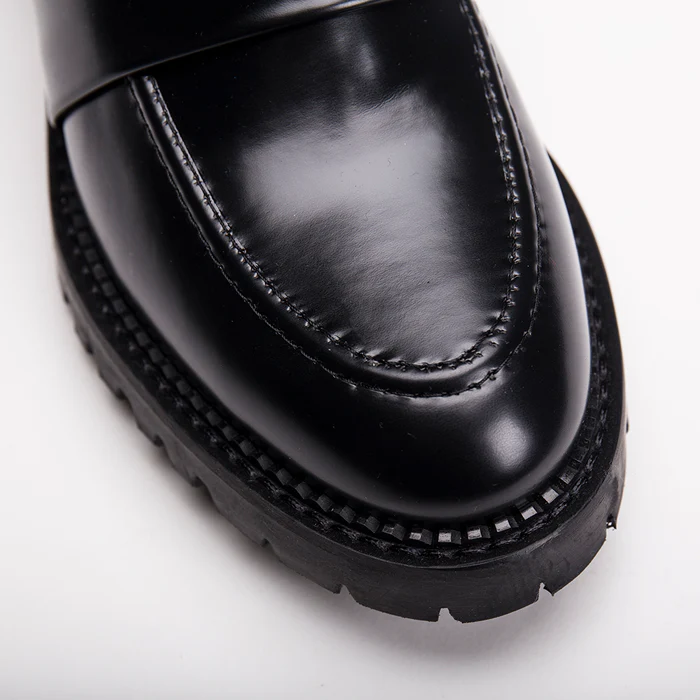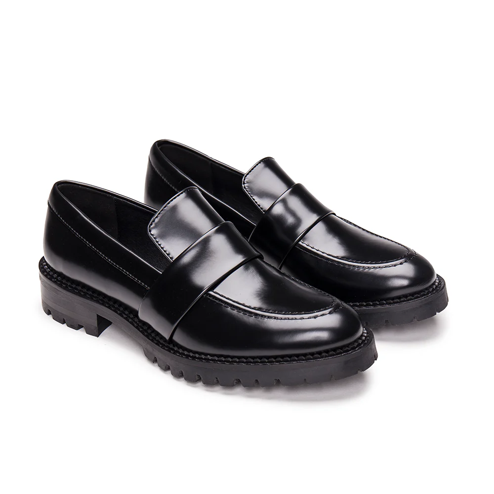 Apresentamos-lhe Elena Black Micro, o sapato Loafer vegan para mulher com uma sela central, fabricado em pele vegan de primeira qualidade. Abrace a sustentabilidade com este material sem crueldade, resistente à água e durável, apresentando bordos cosidos.