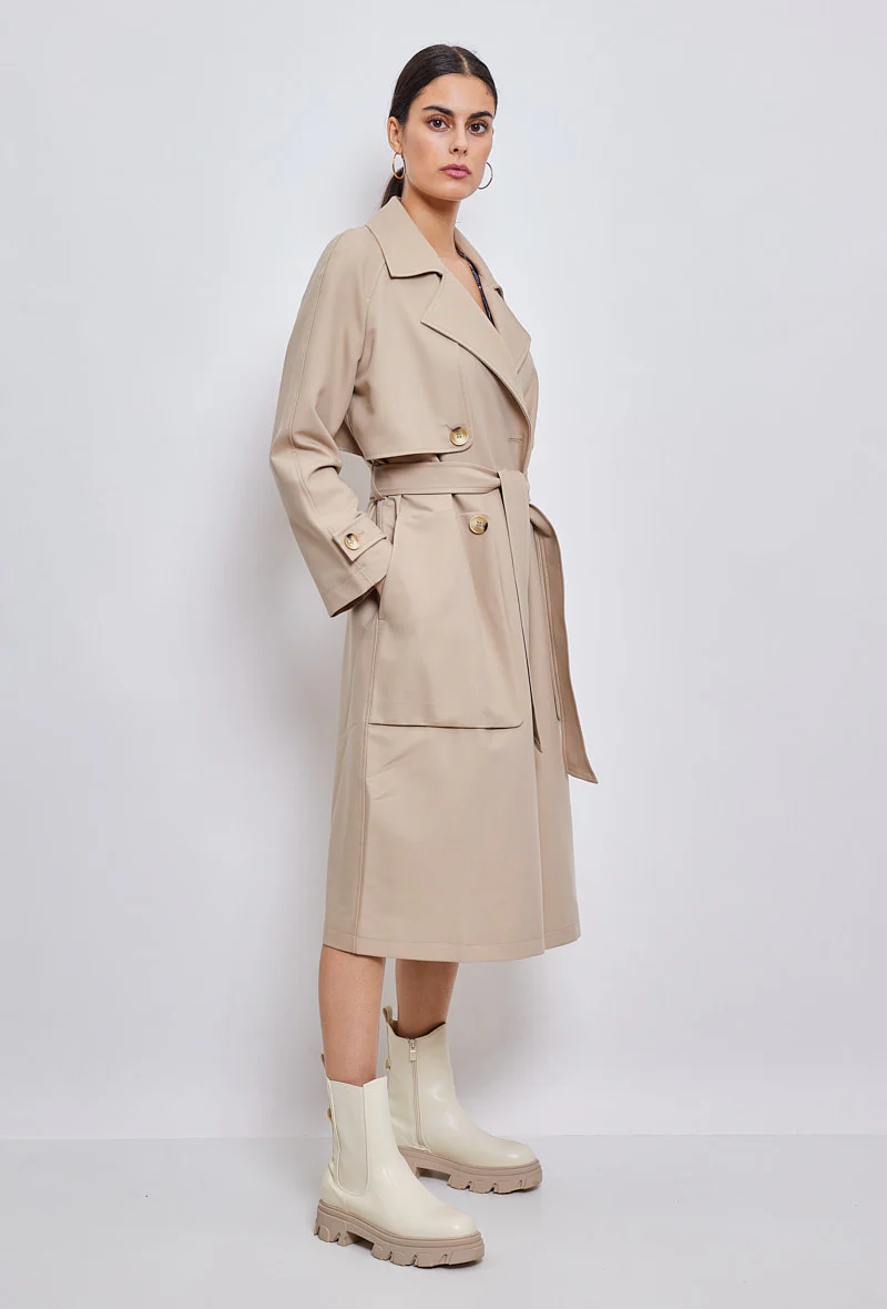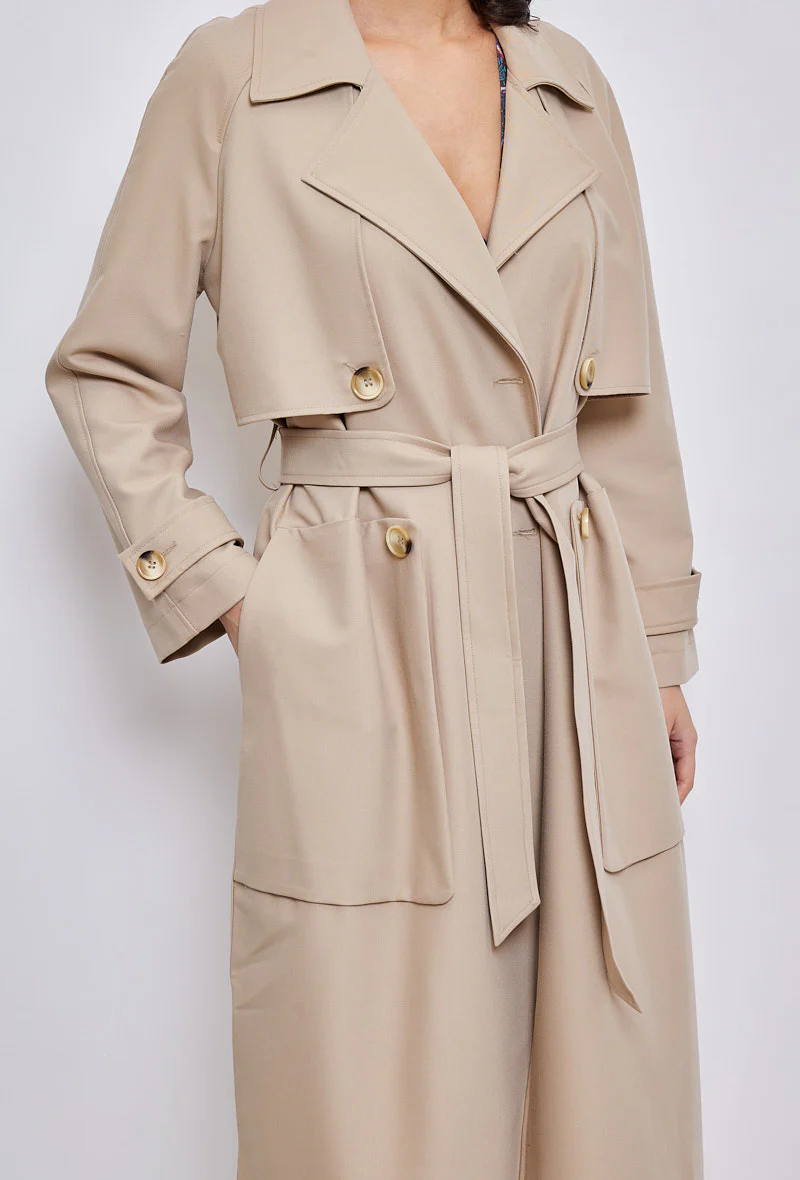 Trench long à ceinture Col à revers Manches longues Poignets à ceinture Boutons Bavolet Larges poches Notre mannequin mesure 176cm et porte une taille S. Longueur correspondant à 115cm