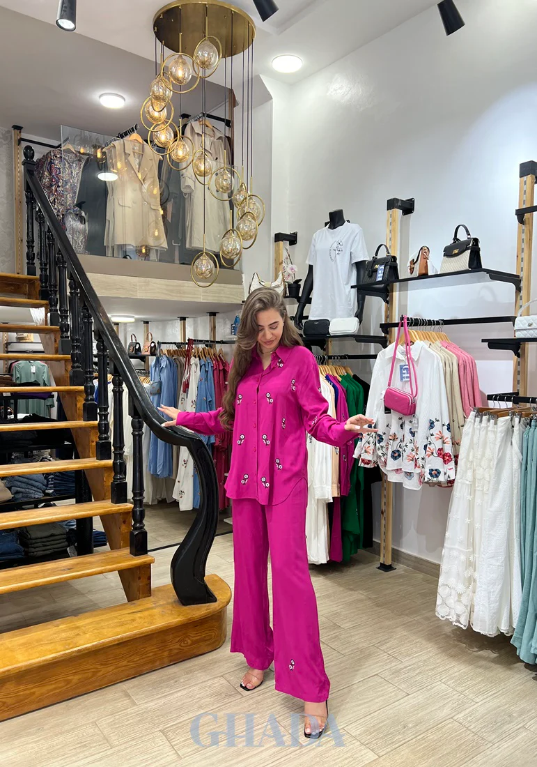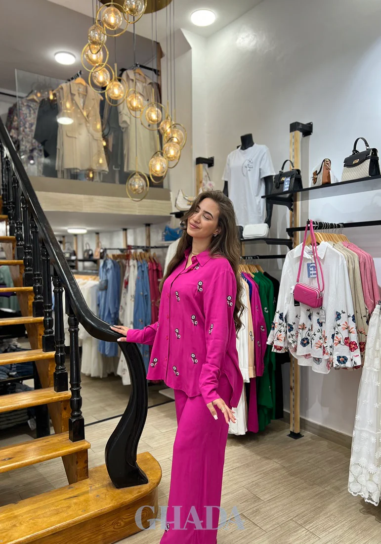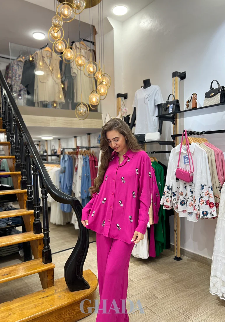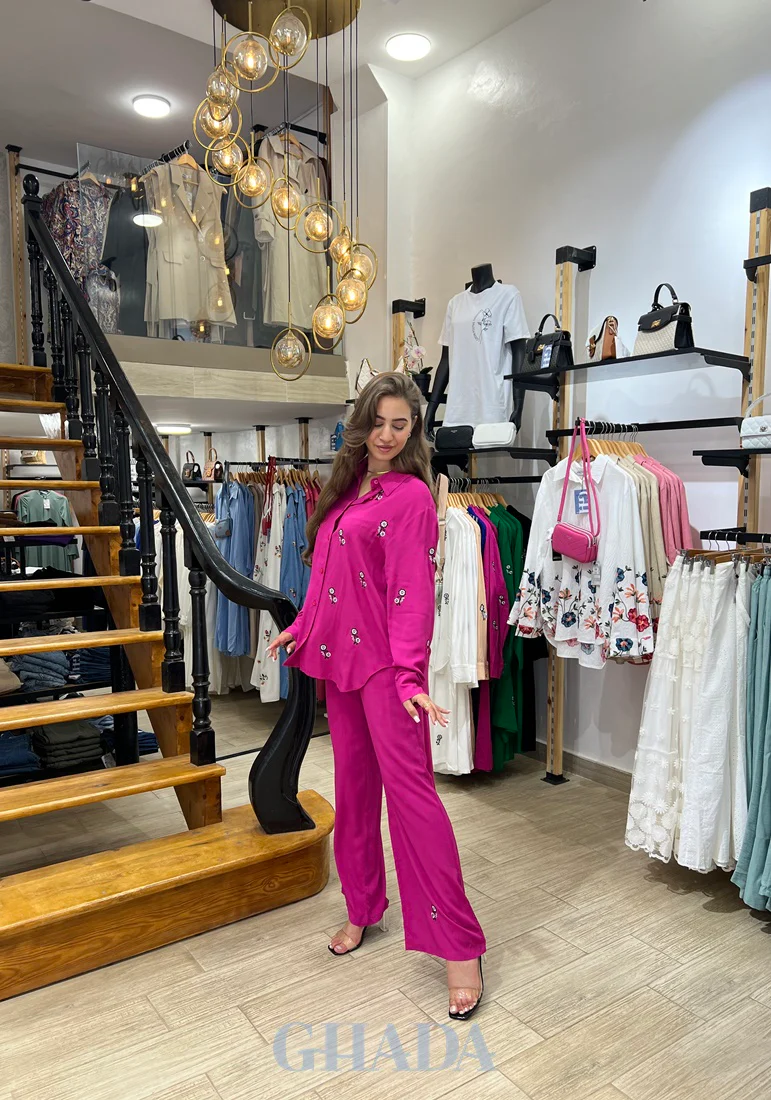 Ensemble chemise brodé & pantalon en rose fuchsia
