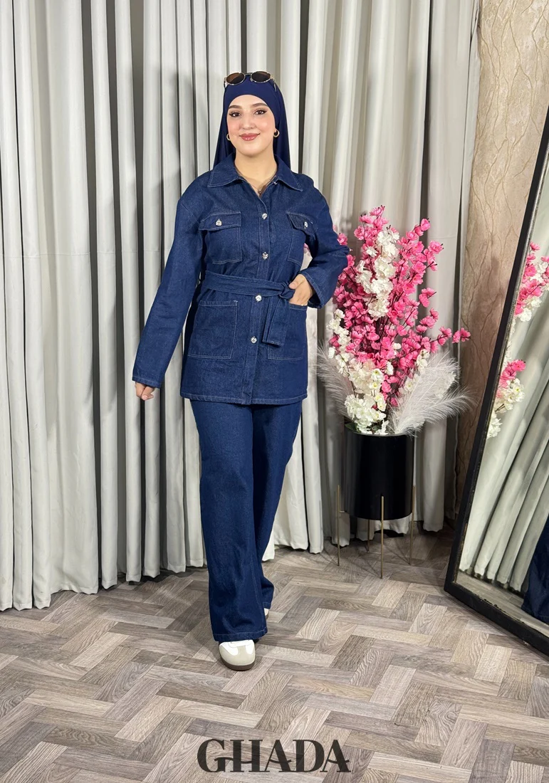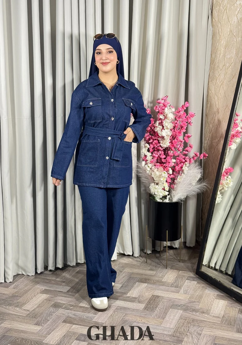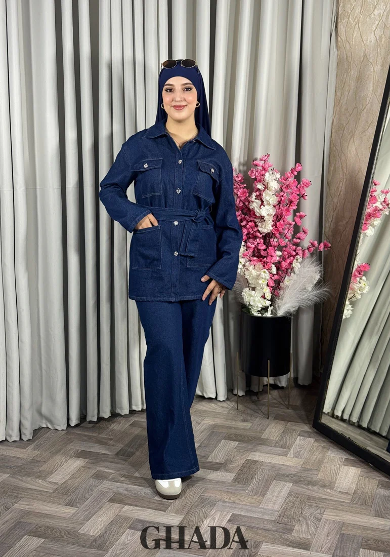 Ensemble deux pièces en denim. Chemise boutonnée sur le devant avec ceinture du même tissu pour marque la taille, avec un pantalon large. Mannequin porte du M
