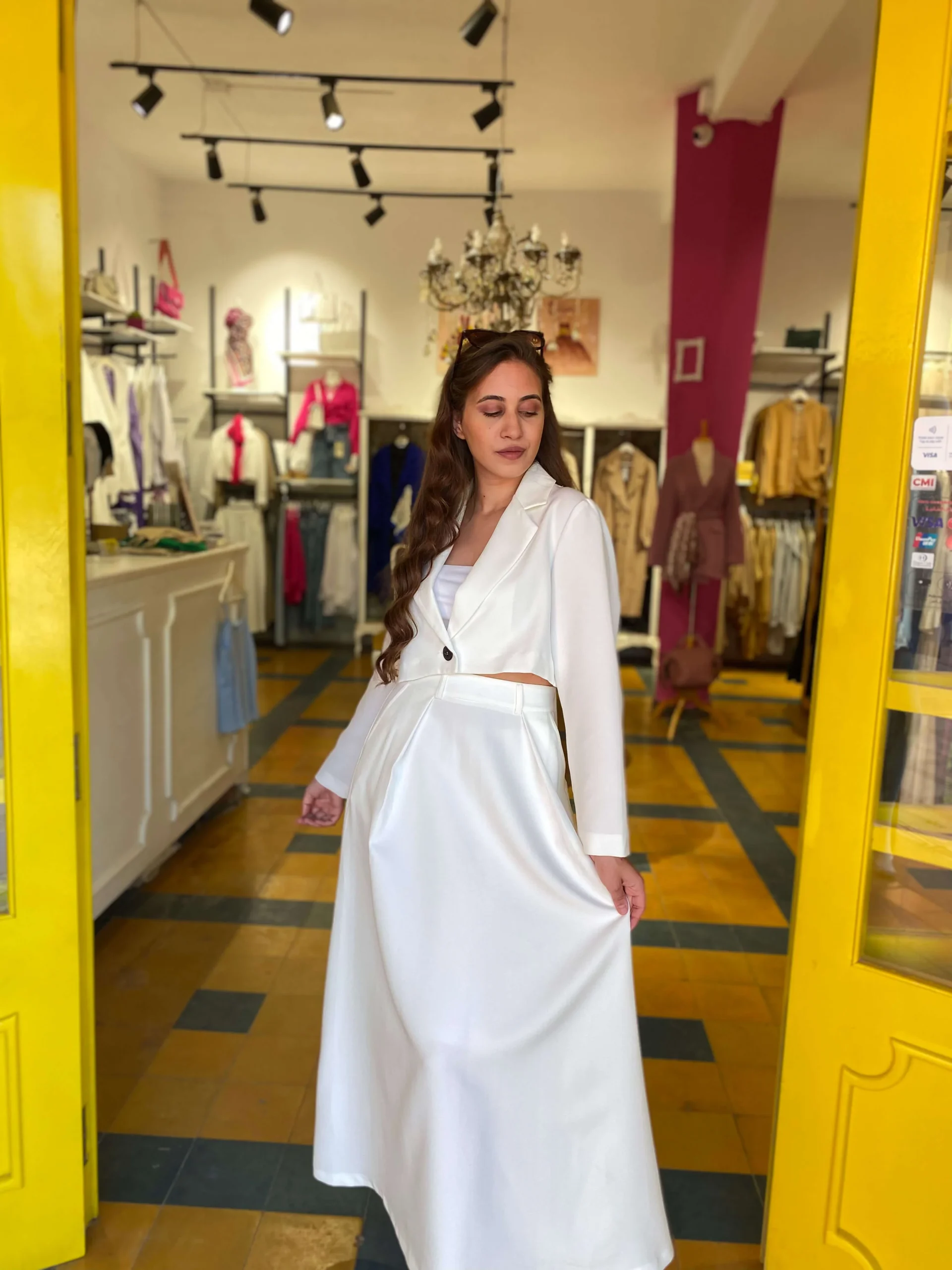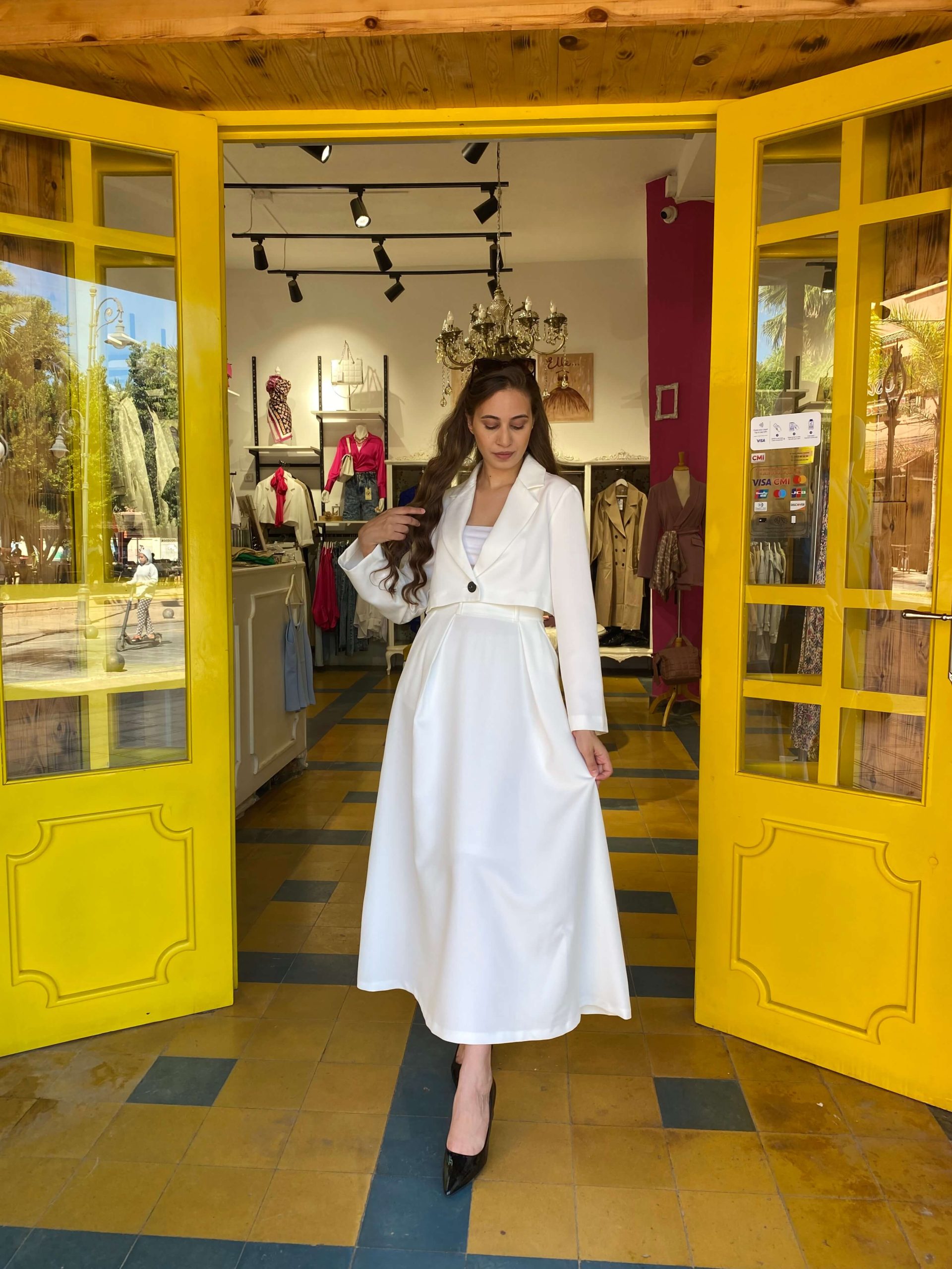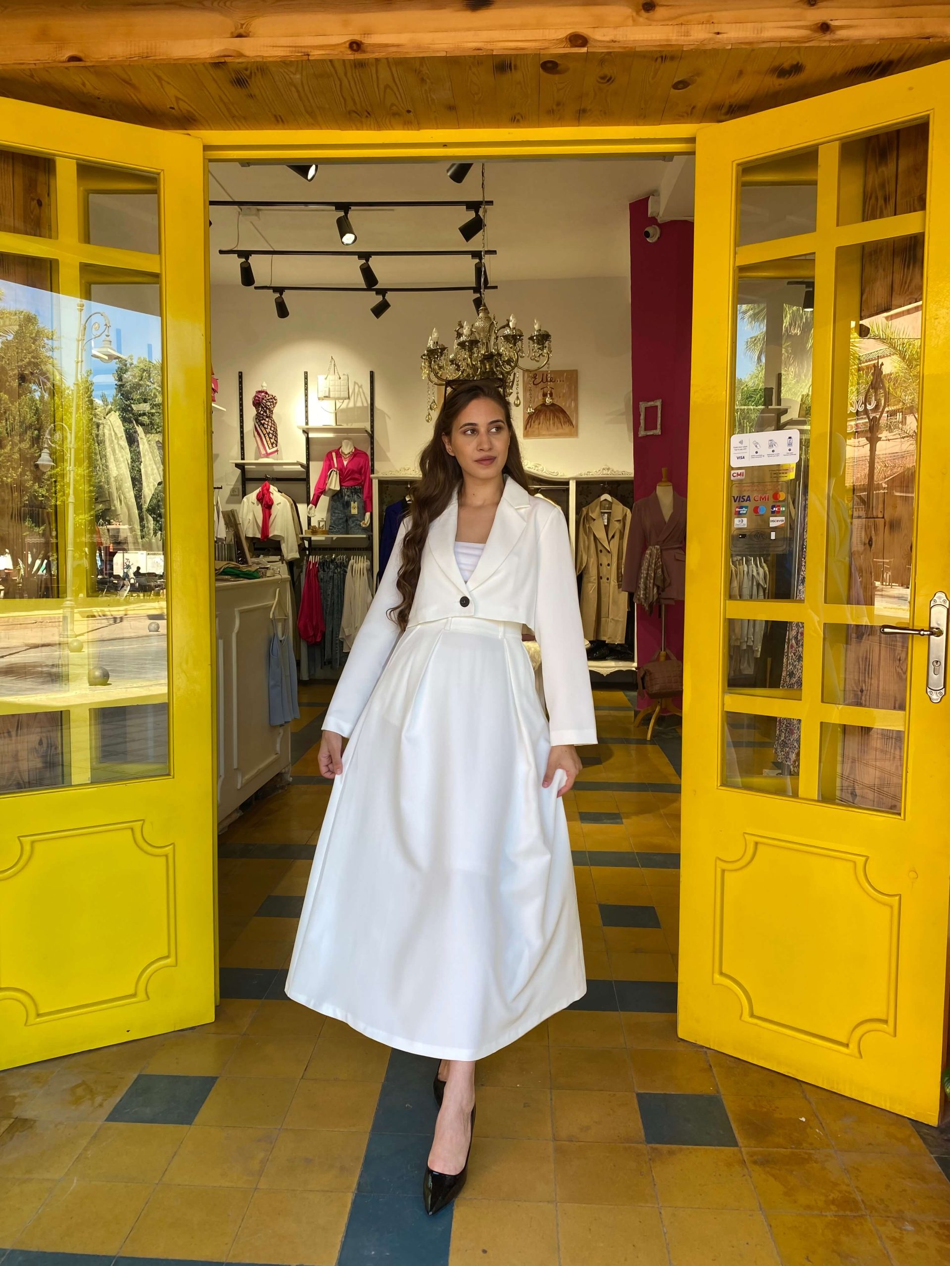Ensemble Veste – jupe en blanc Mannequin porte la taille S et mesure 172 cm 100% fabriqué au maroc