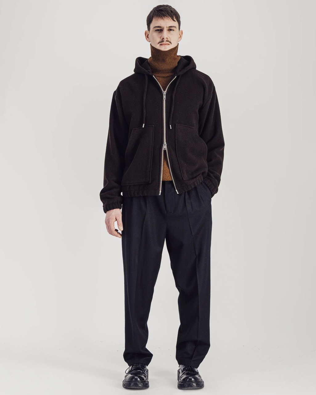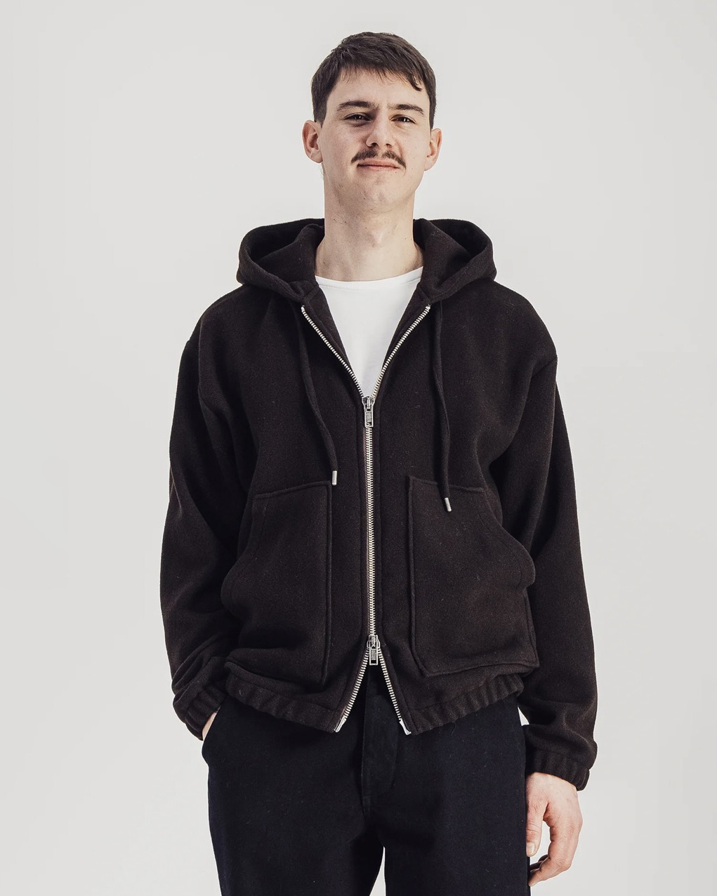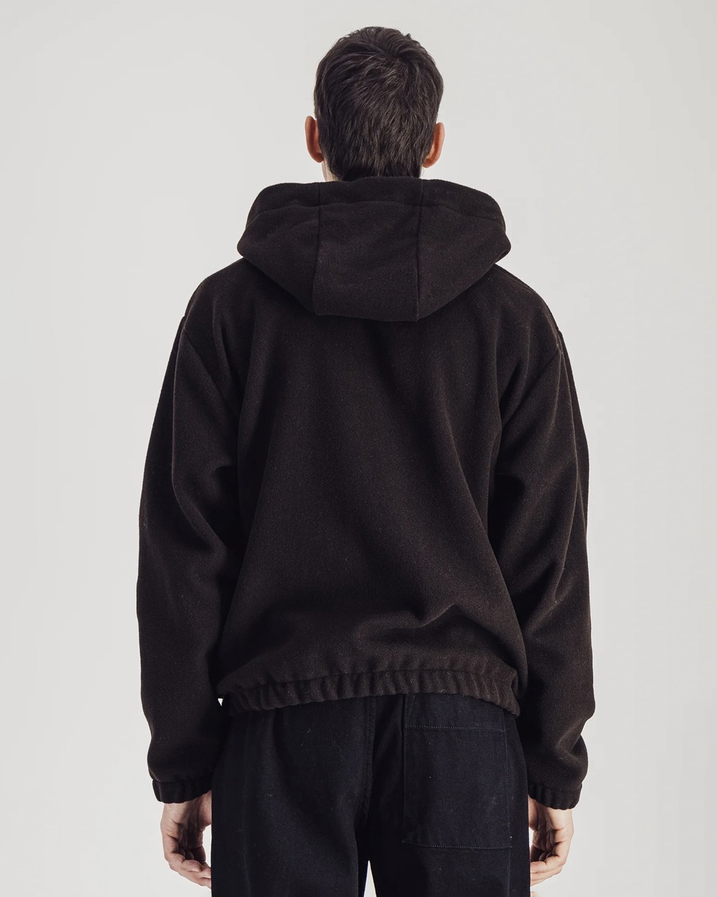 Gilet à capuche en laine polaire marron foncé (80 % laine, 20 % polyamide – 270 g/m²), coupe ample, zip métal double sens YKK, poignets et bas élastiqués, deux poches plaquées. Fabriqué au Portugal.