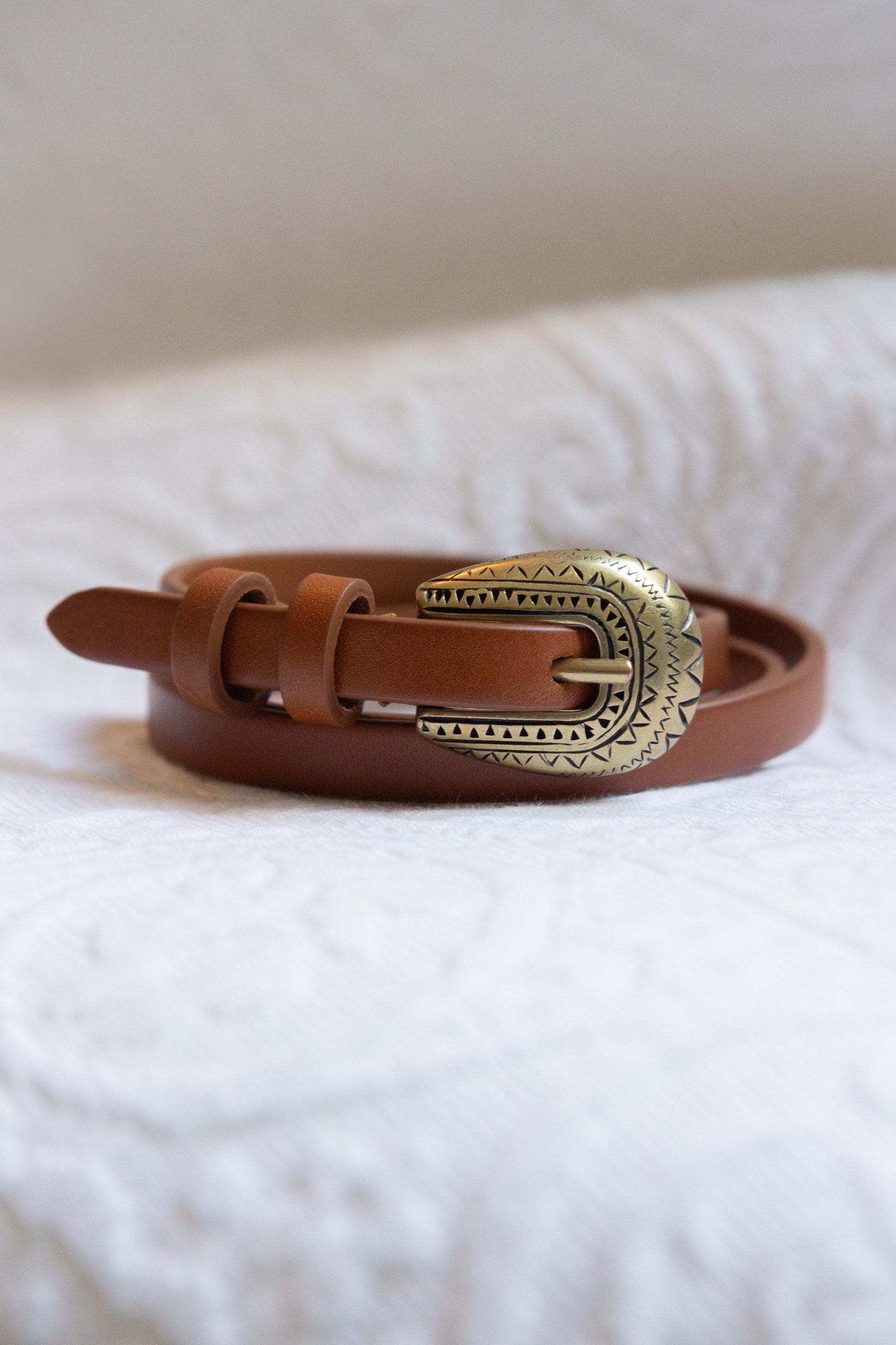 Dieser Gürtel vereint klassische Eleganz mit einem Hauch von Vintage-Charme und wird so zu einem ausdrucksstarken Accessoire für jedes Outfit. Das schlanke Design betont vorteilhaft die Taille, während die kunstvoll gestaltete Schnalle einen markanten, aufmerksamkeitsstarken Akzent setzt.
