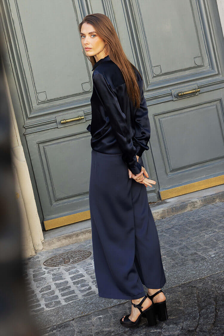 Sie ist aus weichem, fliessendem Satin gefertigt und hat ein weites, leicht verkürztes Bein.