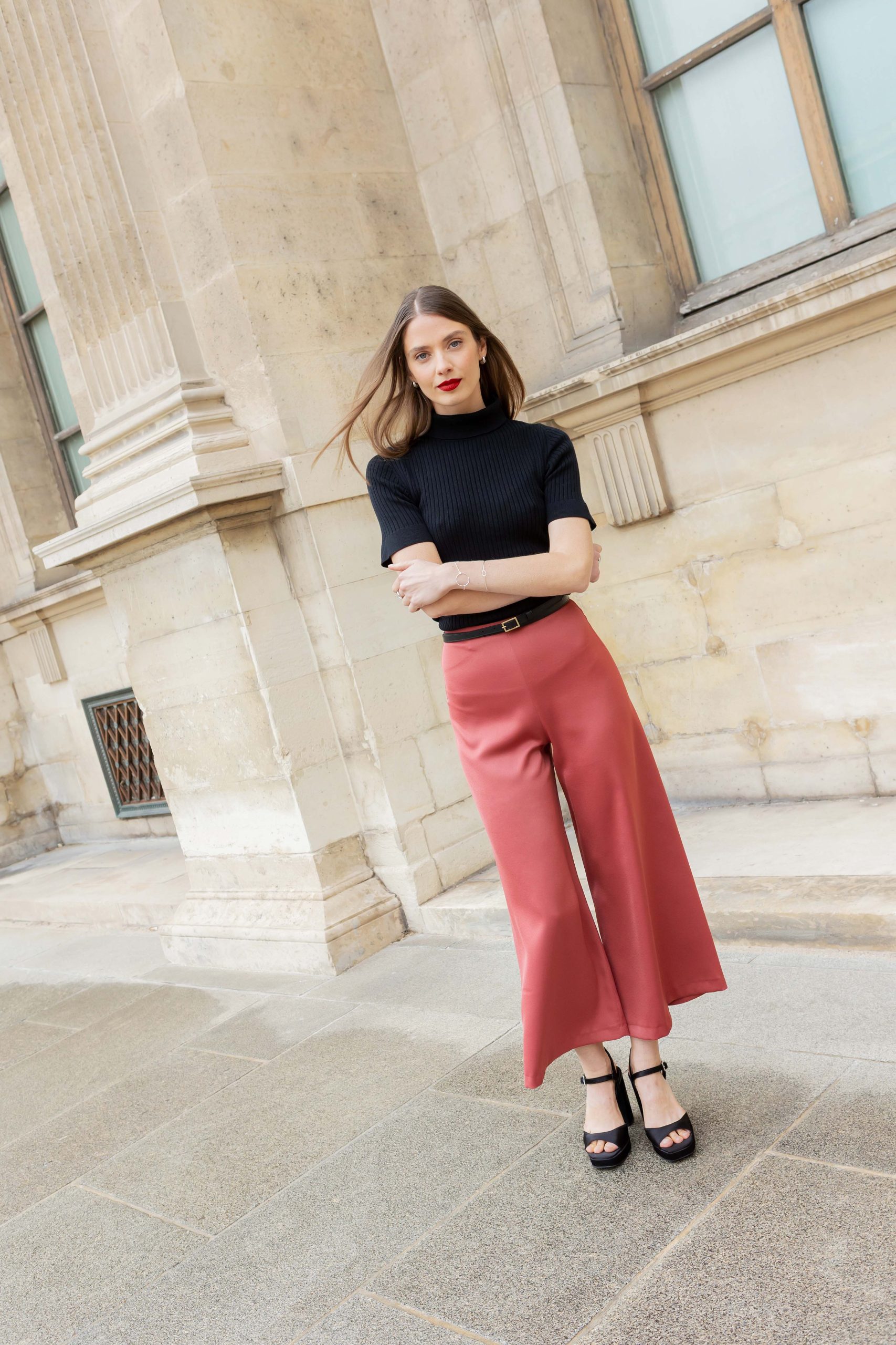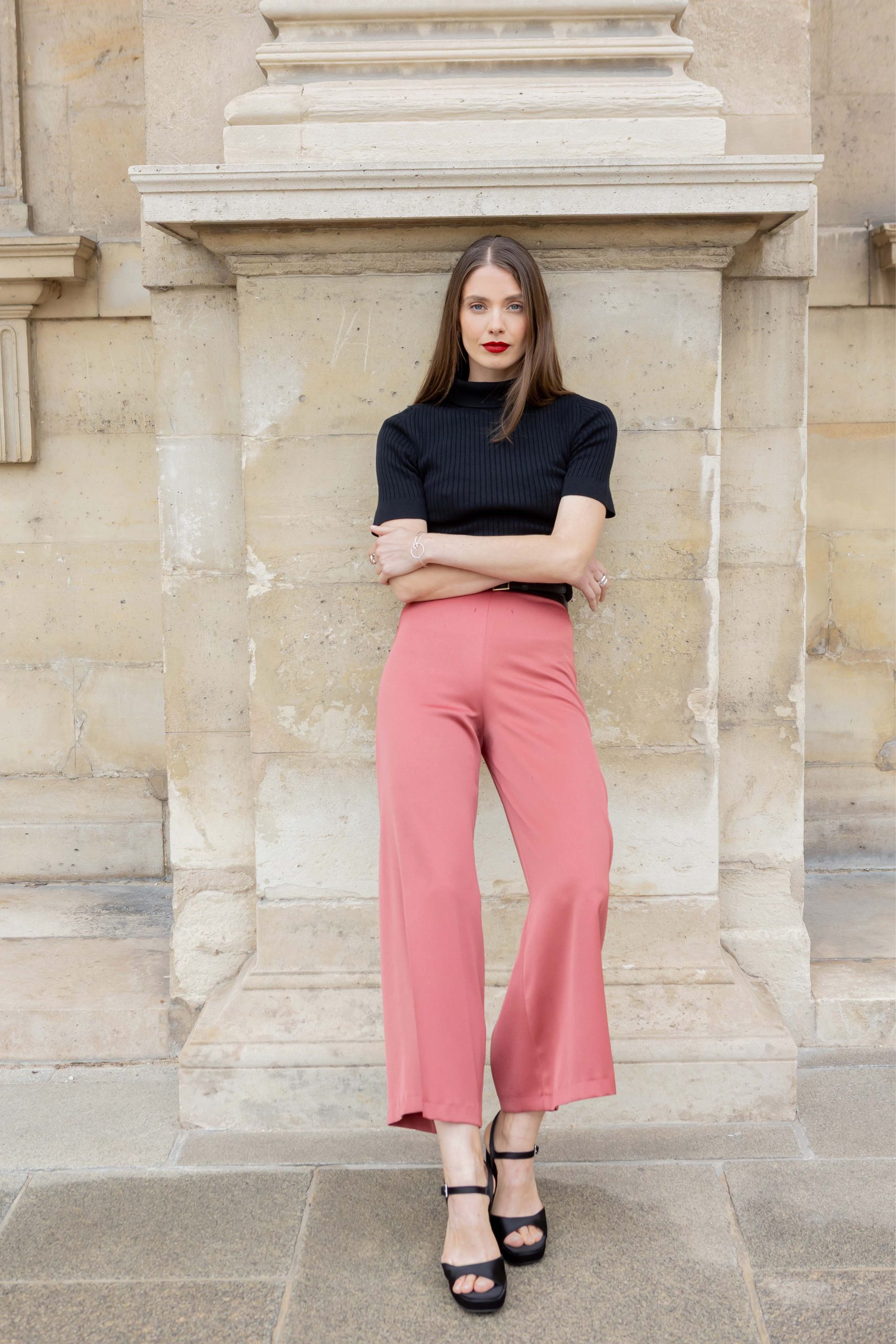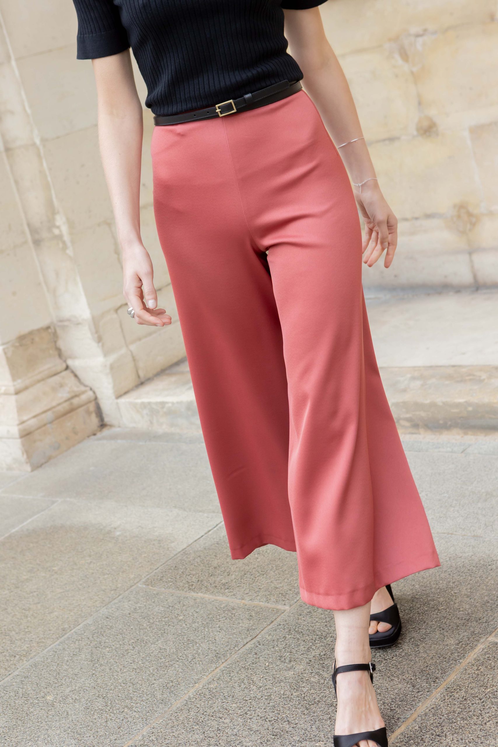 Sie ist aus fließendem Crêpe gefertigt und hat ein weites, leicht verkürztes Bein.