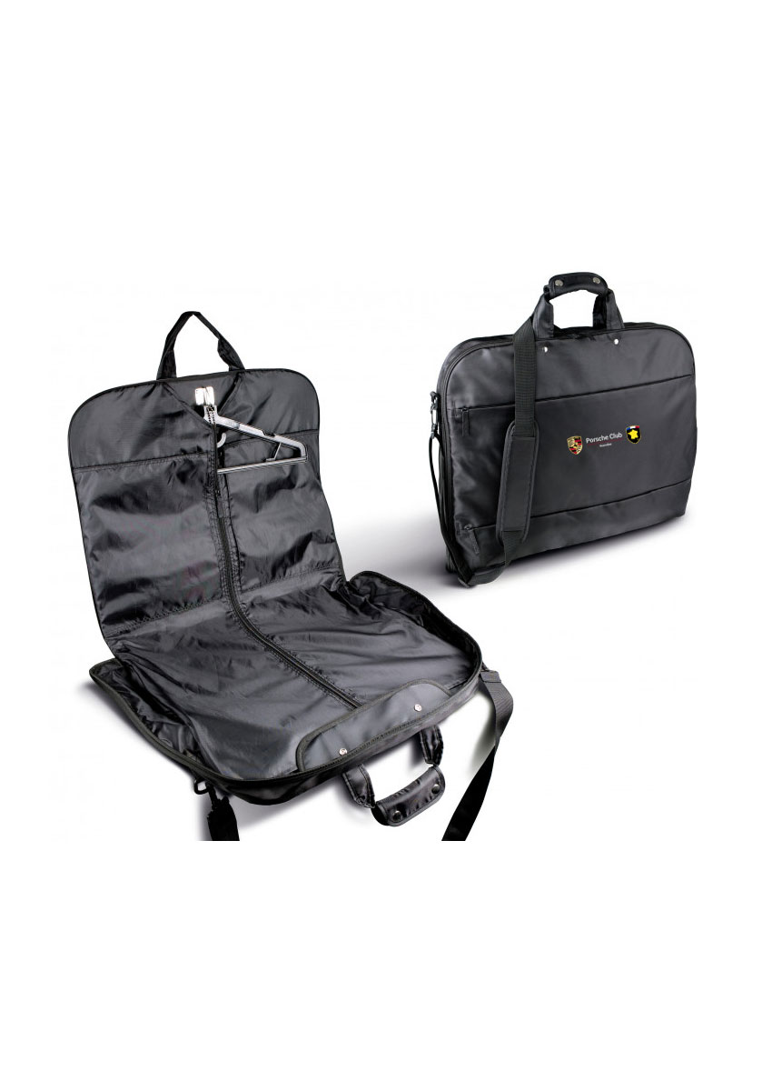 Housse de voyage en polyester 840D. 2 grandes poches devant zippées pour faciliter la sérigraphie / broderie et une petite pour les accessoires. Bandoulière ajustable et amovible avec crochet de suspension et cintre inclus, doublure de protection pour les vêtements et 2 larges poches intérieures.