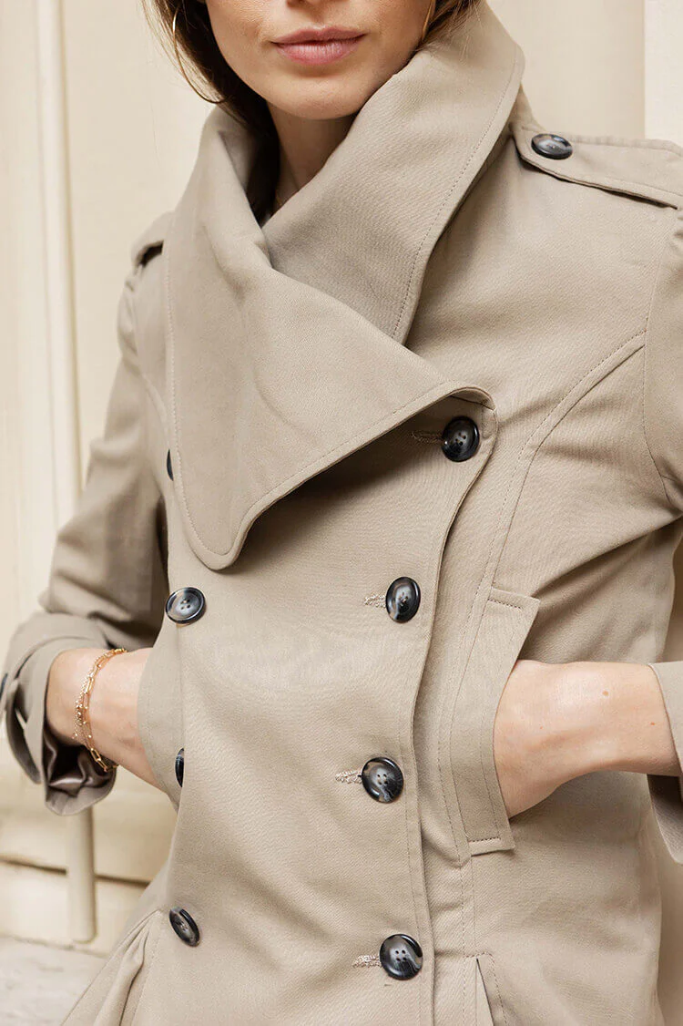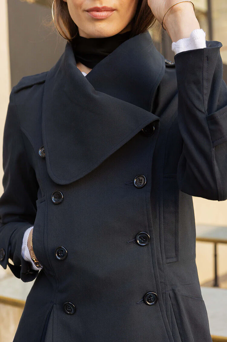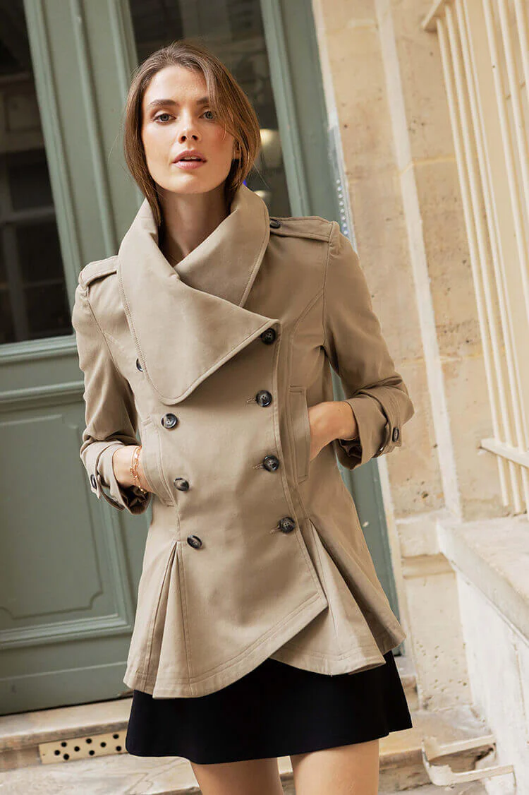Die gefütterte Jacke zeichnet sich durch den umgeschlagenen Kragen, die doppelte Knopfreihe und den schön taillierten Schnitt aus. Die Einsätze am Saum sorgen für einen außergewöhnlichen Look und eine feminine Silhouette.