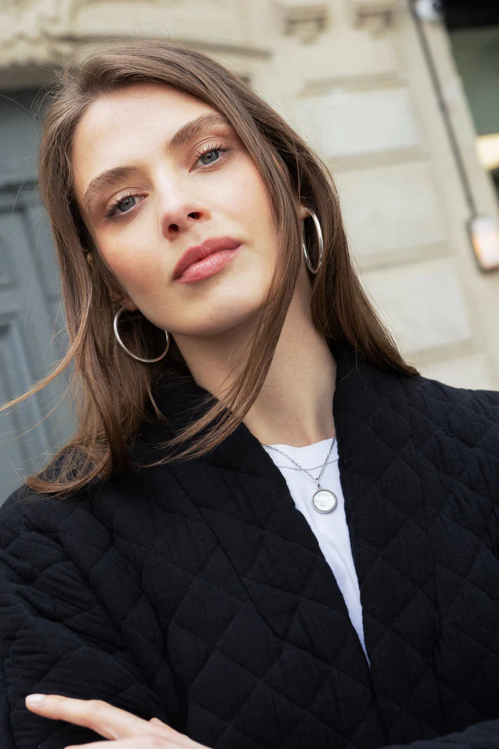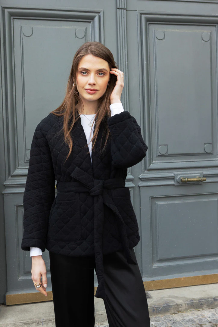 Diese elegante schwarze Steppjacke kombiniert Komfort und Stil, perfekt für kühlere Tage. Leicht gepolstert und mit einem subtilen Steppmuster versehen, bietet sie einen modernen, strukturierten Look.