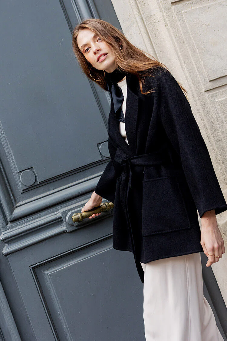 Kalte Tage verlangen nach einer warmen Jacke. Die Yasmin Jacke wurde aus hochwertigem italienischem Doubleface Wollstoff gefertigt und verfügt über große Eingriffstaschen.