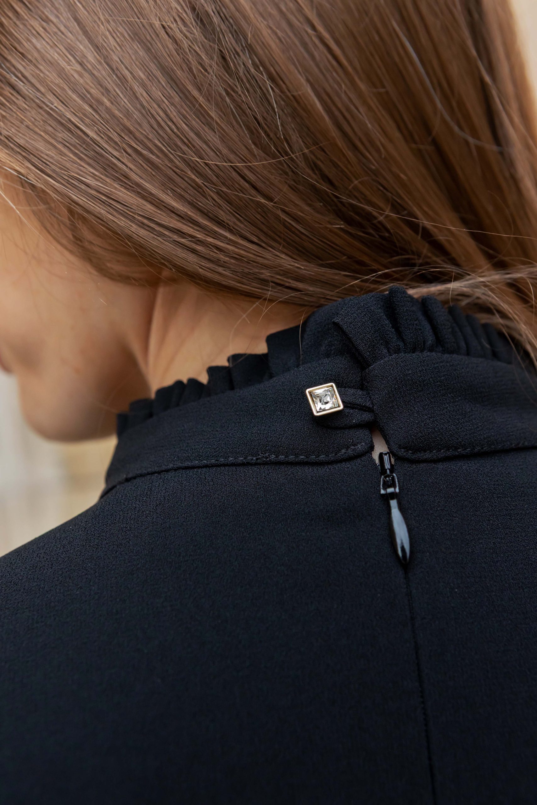 Die langen Ärmel sind mit zarten Rüschenbündchen versehen, die dem schlichten Gesamtbild einen femininen Touch verleihen. Der hohe Halsausschnitt wird durch ein zartes Rüschendetail aufgewertet, das einen Hauch von Vintage-Charme versprüht. Der leichte Stoff schmiegt sich wunderbar an den Körper an und sorgt für Komfort, ohne den Stil zu beeinträchtigen.