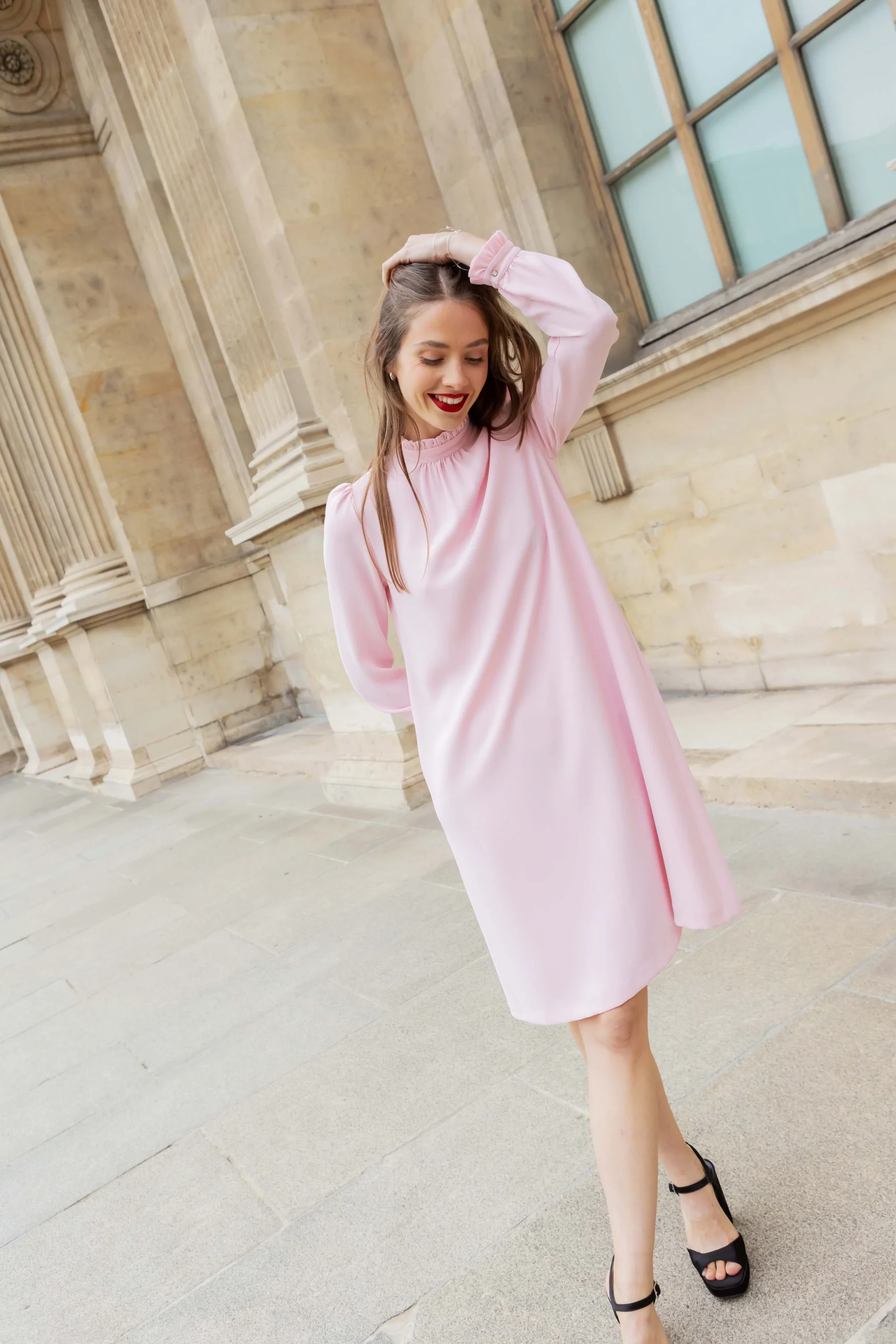 Dieses Kleid ist ein raffiniertes Stück mit zeitlosem und minimalistischem Design, das sich sowohl für legere als auch für formelle Anlässe eignet. Die fliessende Silhouette ermöglicht eine leichte Bewegung und bewahrt gleichzeitig eine strukturierte Eleganz.Die langen Ärmel sind mit zarten Rüschenbündchen versehen, die dem schlichten Gesamtbild einen femininen Touch verleihen. Der hohe Halsausschnitt wird durch […]
