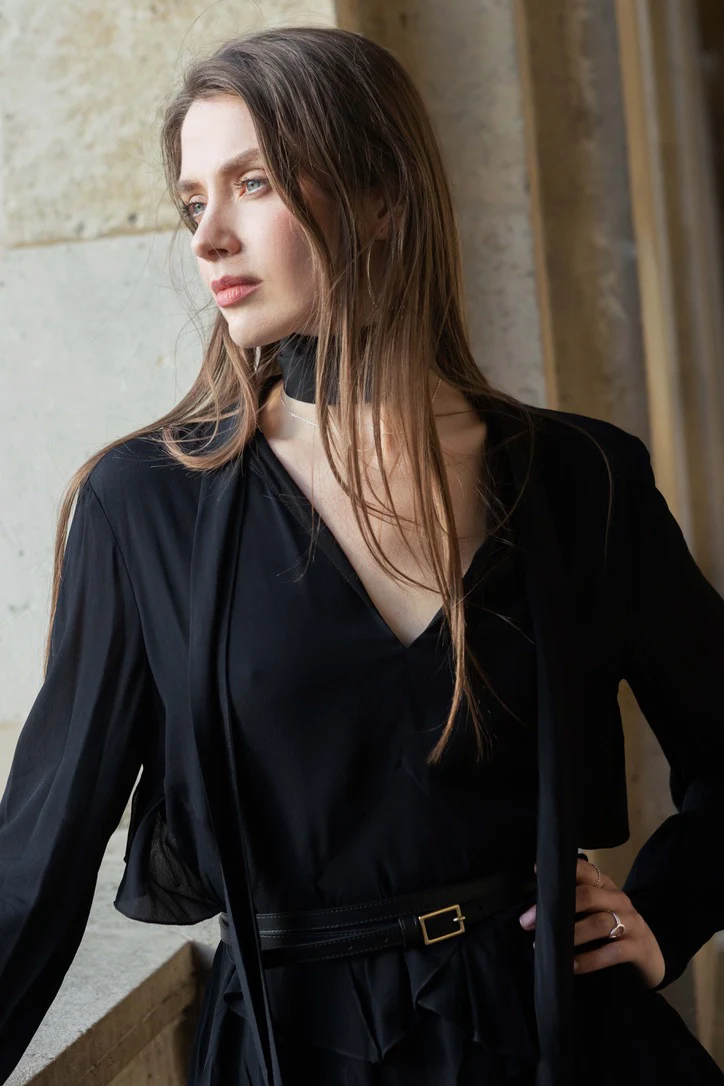 Es hat Volants und Puffärmel, die seinen femininen Look betonen, und endet mit einem asymmetrischen Saum, der bei jedem Schritt dezent mitschwingt.