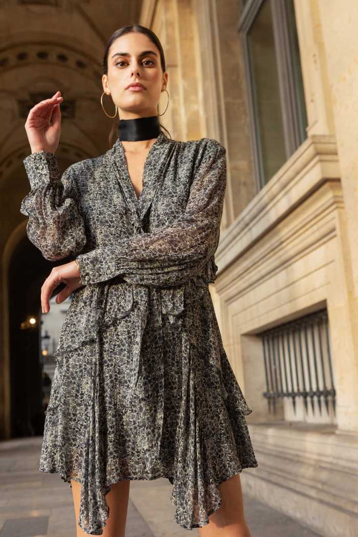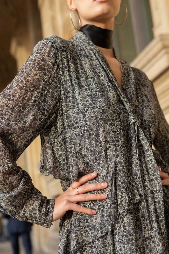 Das Kleid Celestine Julia ist aus luftigem Viskosechiffon gefertigt und mit romantischen graublauen Blumen bedruckt.