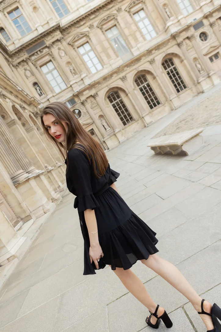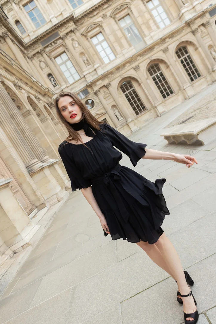 Dieses Minikleid mit seiner romantischen Silhouette ist aus luftigem Crêpe gefertigt. Es hat luftige Ärmel und einen fließenden Rock mit Rüschen. Es hat einen runden Ausschnitt und einen langen Gürtel, der Ihre Taille betont. Der Charme des Dorothée-Kleides liegt darin, dass es sowohl in der Stadt als auch im Urlaub getragen werden kann und dass […]