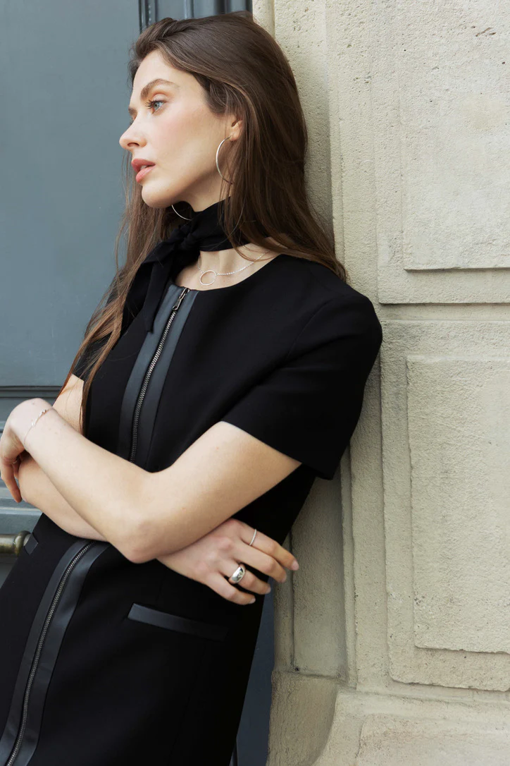 Dieses kurzärmelige Minikleid überzeugt durch seinen minimalistischen, klar strukturierten Schnitt und vertikale Linienführung. Ein durchgehender Reissverschluss verläuft entlang der Vorderseite – vom Halsausschnitt bis zum Saum – und fungiert sowohl als praktischer Verschluss als auch als zentrales Designelement.