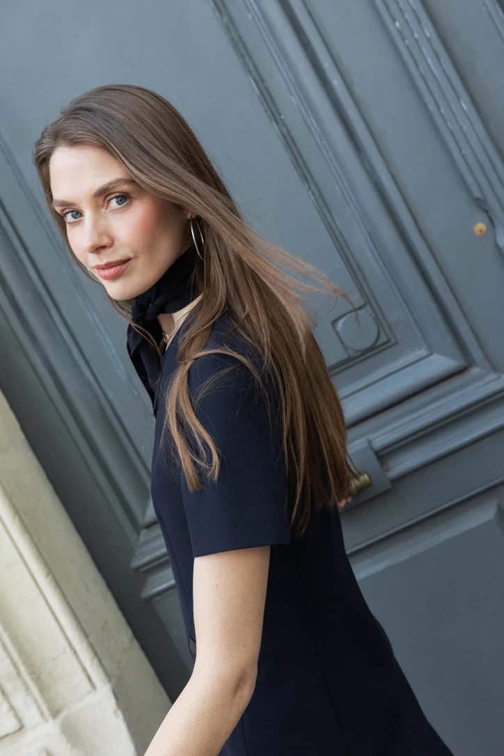 Der runde Halsausschnitt bildet eine elegante Grundlage, die sich perfekt mit unserem separat erhältlichen Foulard kombinieren lässt – für eine besonders stilvolle Note. Die kurzen Ärmel runden das edle Design ab und machen das Kleid zu einem vielseitigen Begleiter für Tag und Abend.