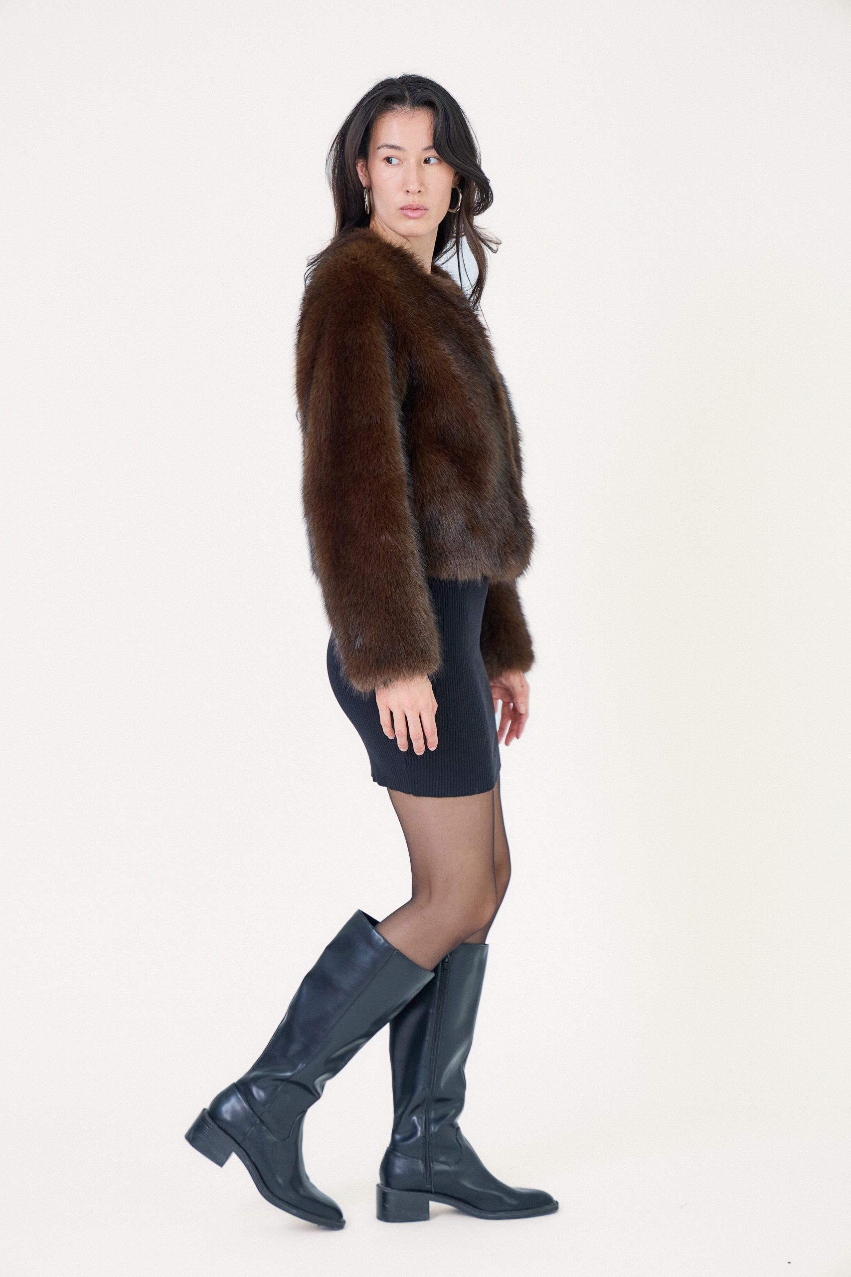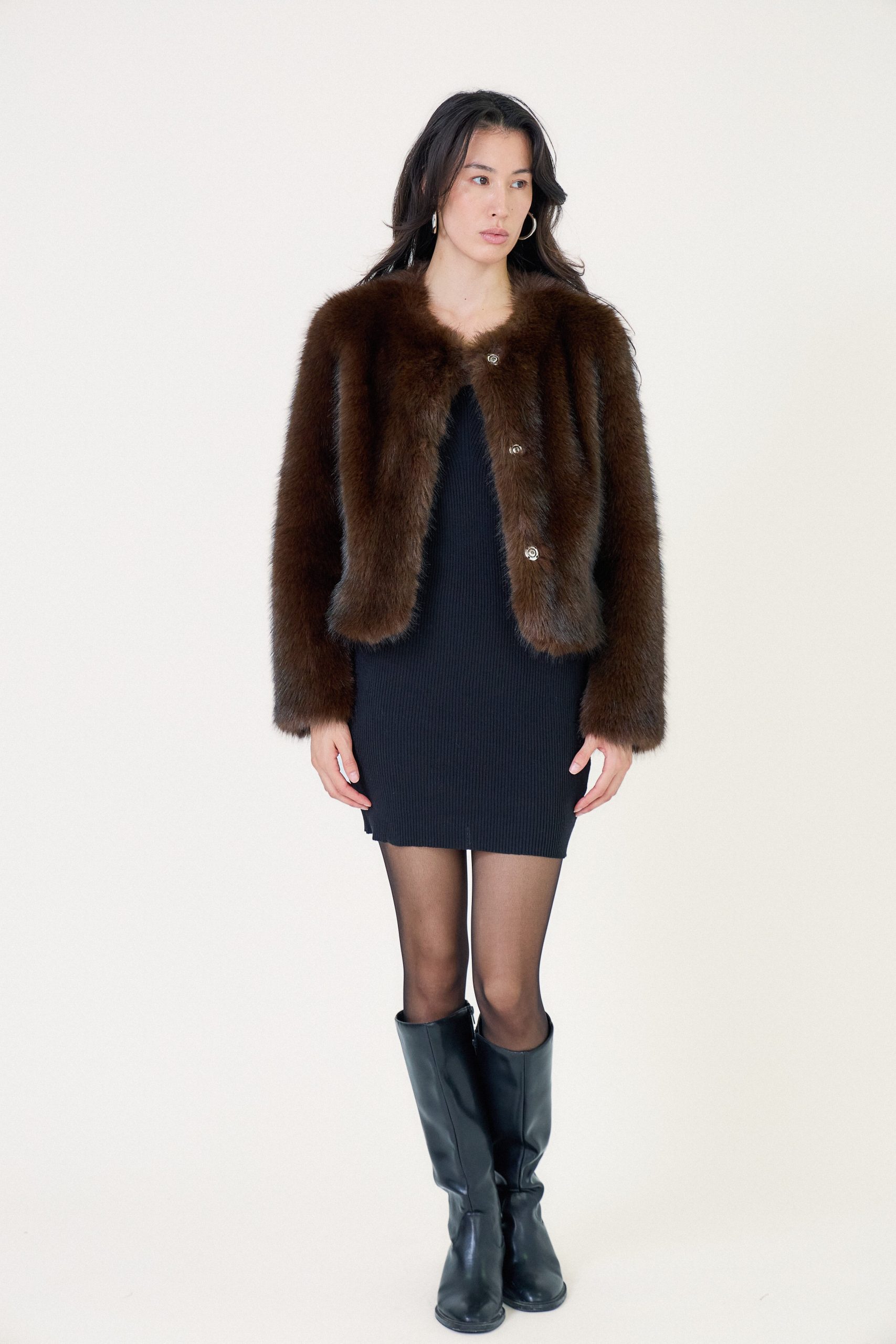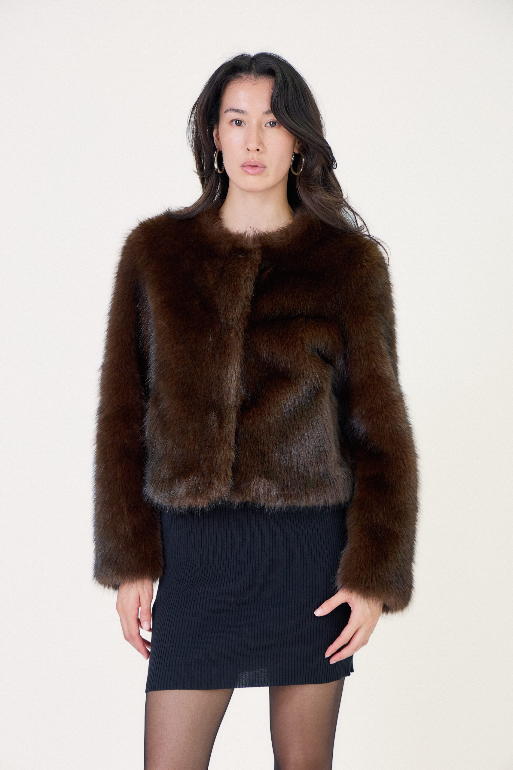 Manteau fausse fourrure courte à col rond Fausse fourrure à poils longs, toucher doux et volumineux Coupe courte et structurée Col rond élégant Fermeture à pressions dissimulées Manches longues légèrement amples Notre mannequin mesure 177cm et porte une taille S