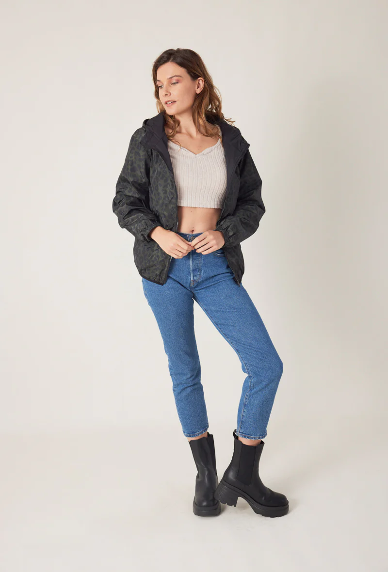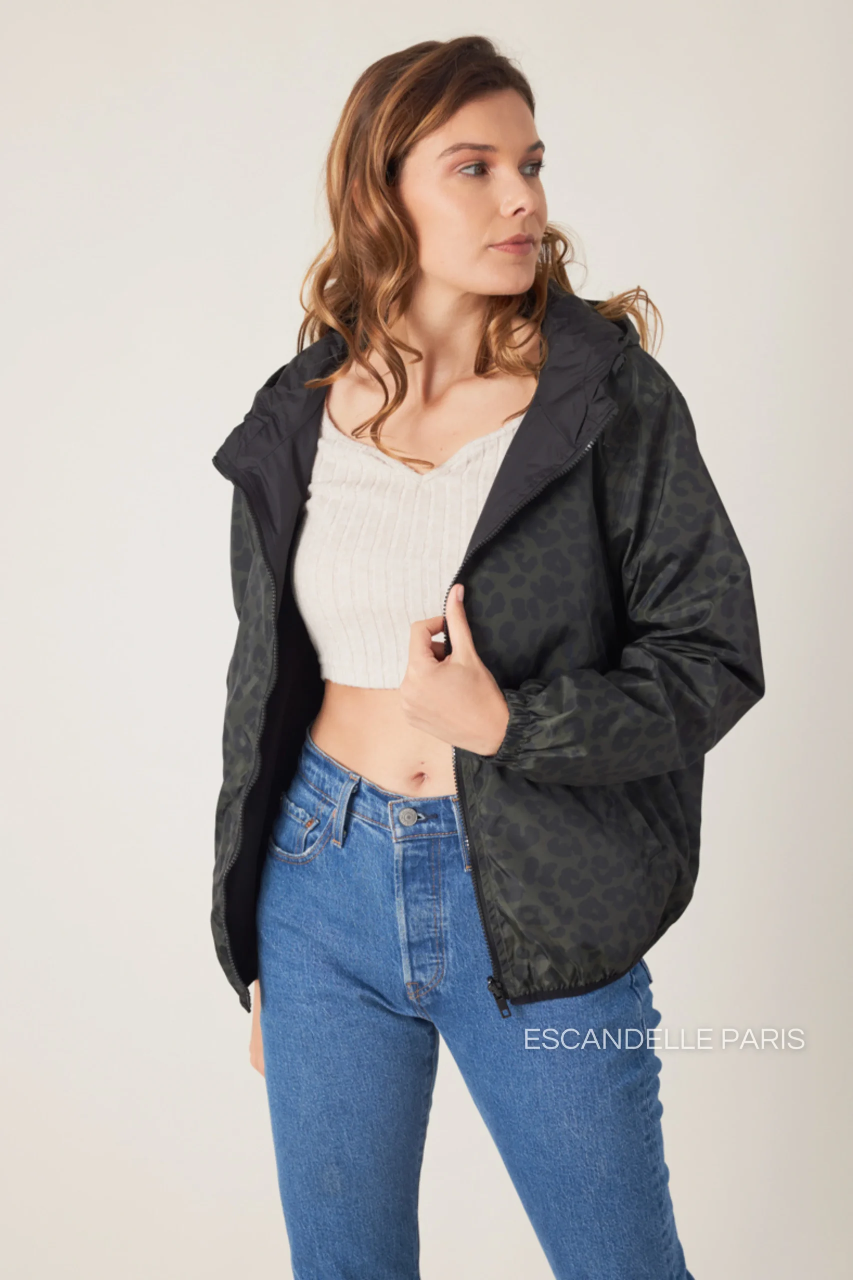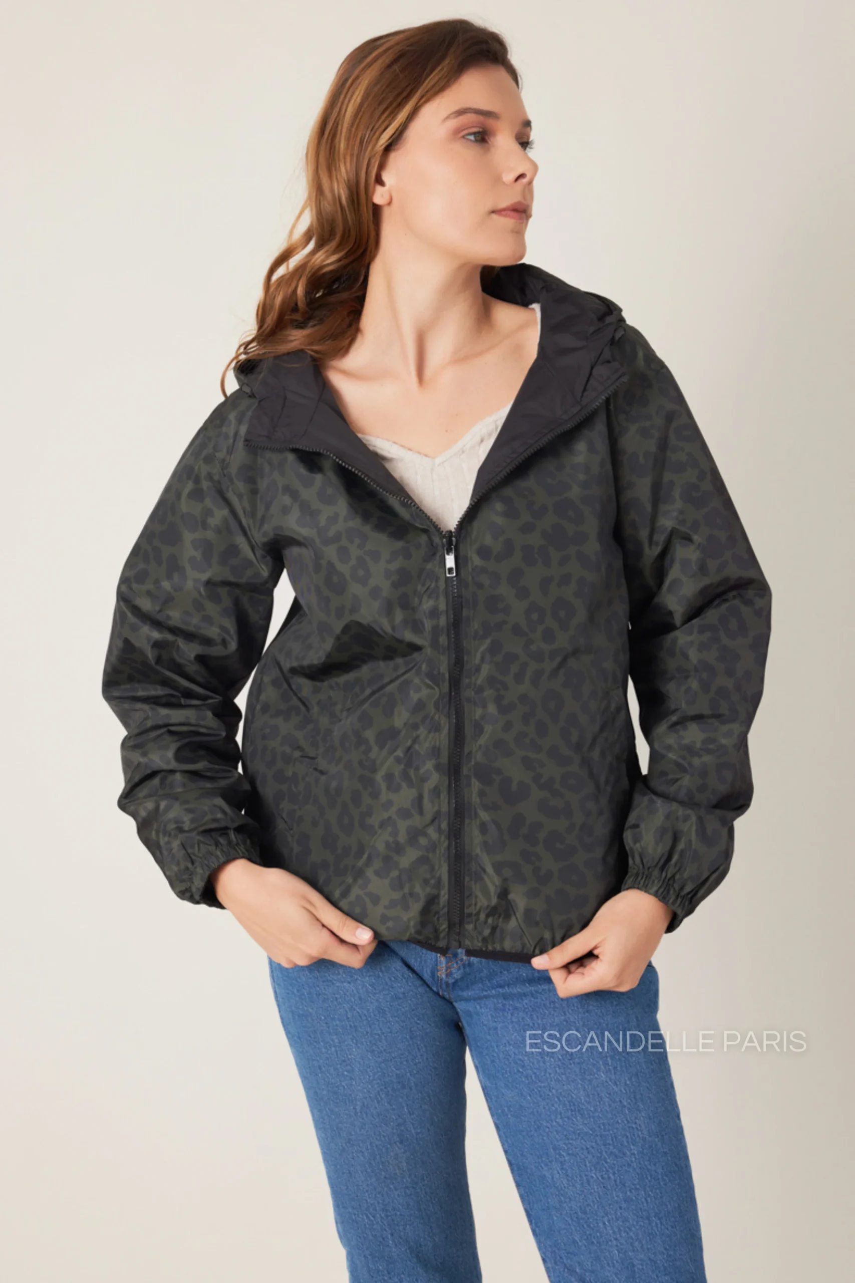 Parka courte imperméable à motifs léopard Réversible Capuche Fermeture à glissière Poches latérales Imperméable et coupe-vent Notre mannequin mesure 173cm et porte une taille S