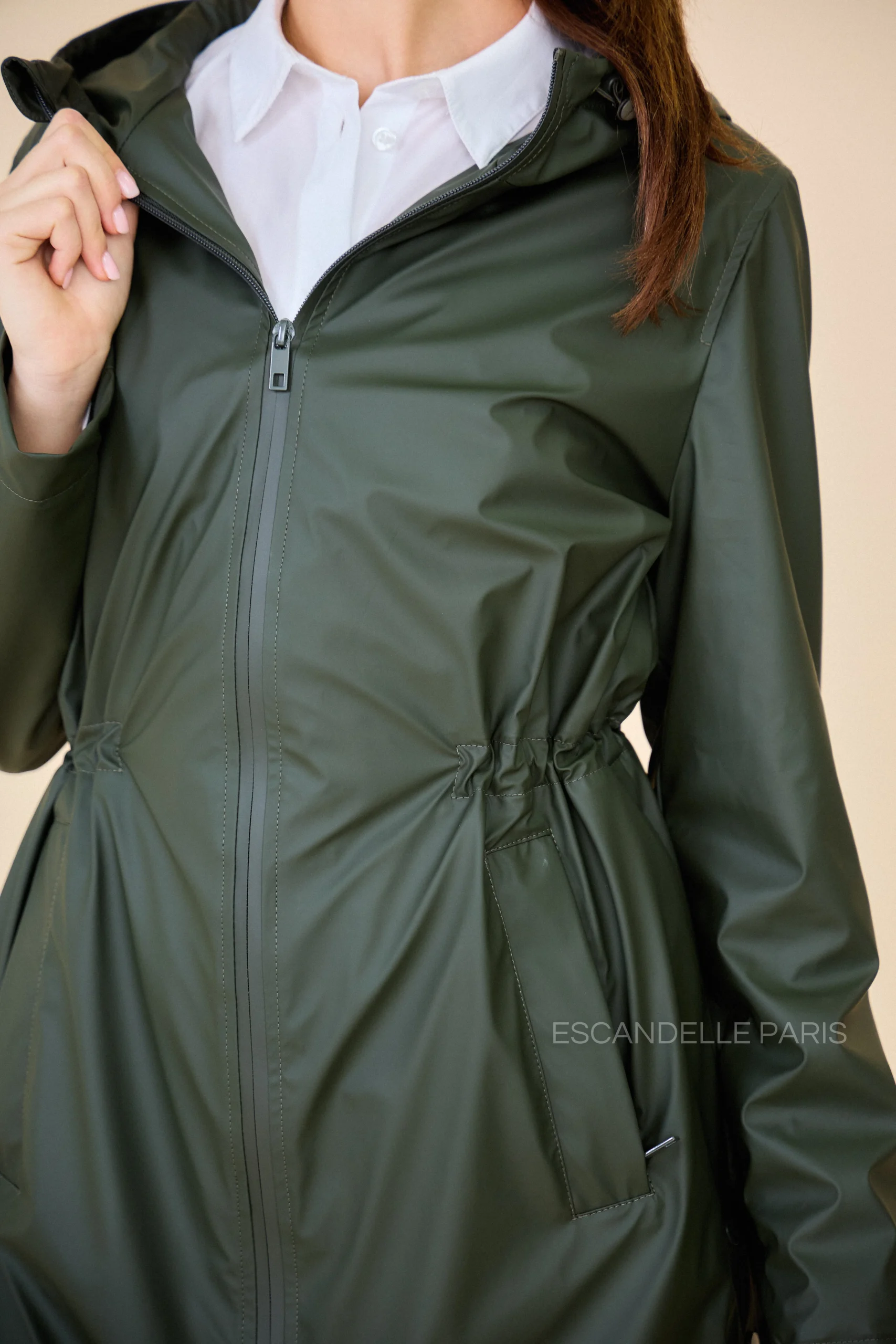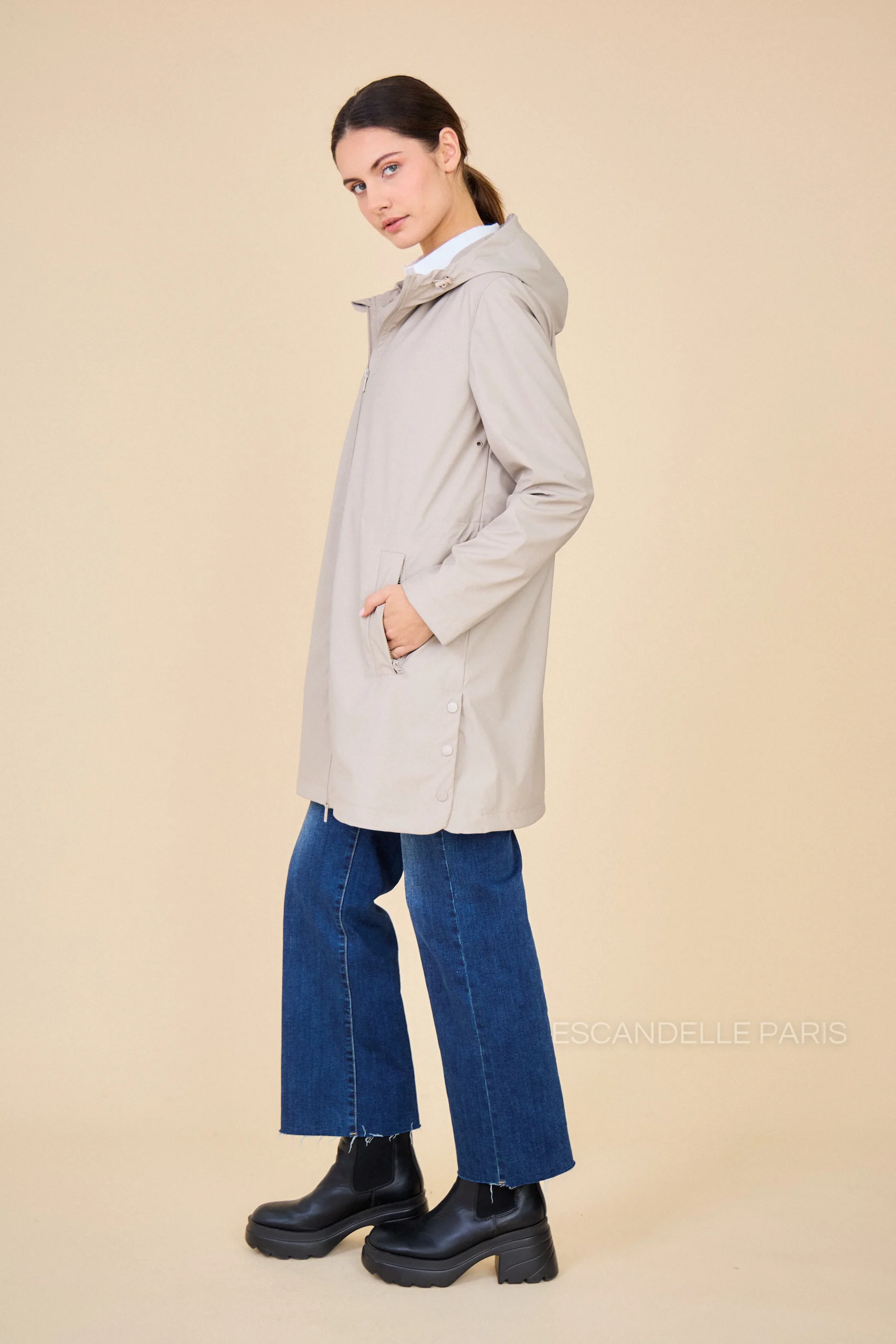 Imperméable mi-long à élastique Capuche à cordons et poches Poignets non élastiqués Zip ton sur ton Élastique à la taille Fentes boutonnées sur les côtés Longueur: mi-cuisse Notre mannequin mesure 175cm et porte une taille S