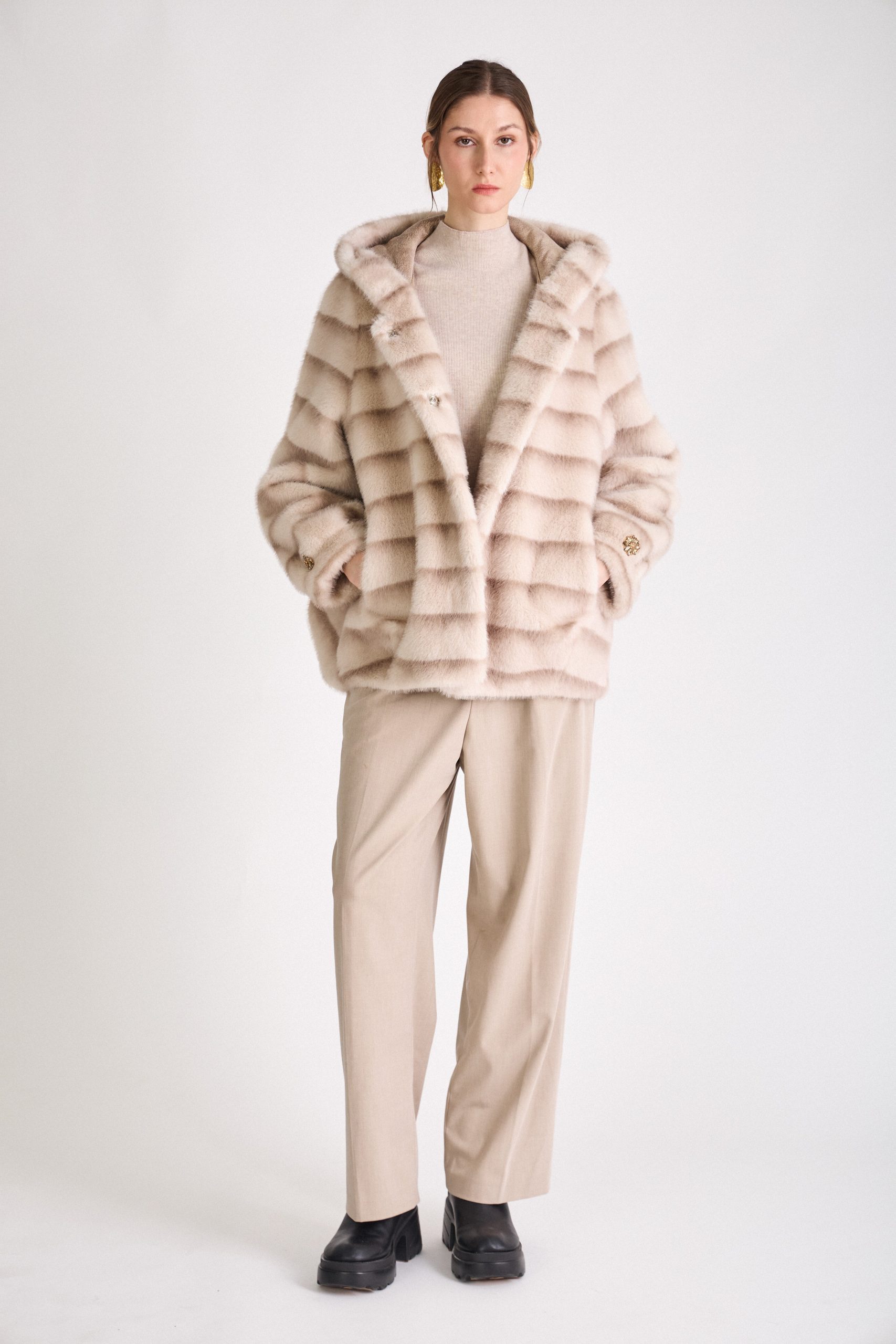 Manteau fausse fourrure à rayures Fourrure à capuche Col montant Fermeture zip sur le devant Poches avant Bijou décoratif au niveau du col COUPE OVERSIZED: Nous vous conseillons de choisir votre taille habituelle ou une taille en dessous Notre mannequin mesure 177cm et porte une taille S