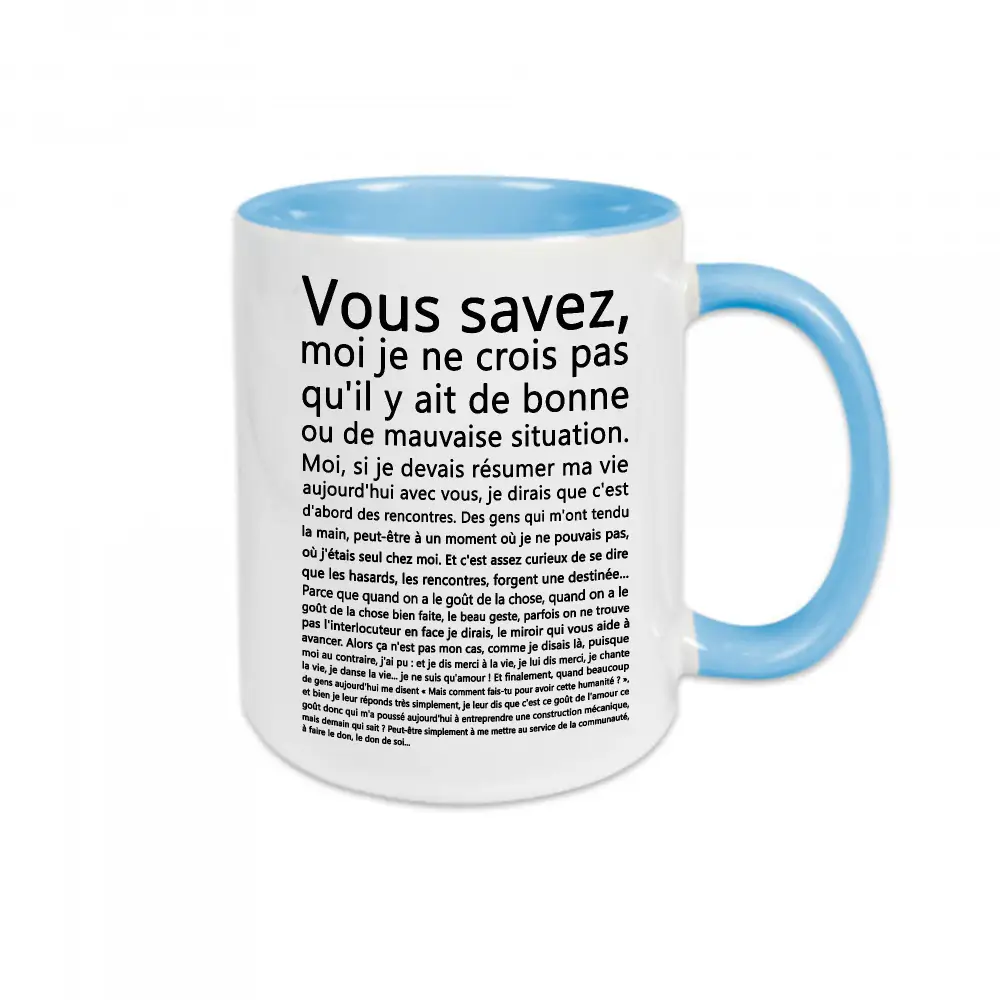 Vous êtes fan de répliques légendaires ? Ce mug céramique Vous savez est fait pour vous. Avec la citation mythique « Vous savez, moi je ne crois pas qu’il y ait de bonne ou de mauvaise situation », vous afficherez fièrement votre amour pour le cinéma français… et pour les grandes réflexions philosophiques de la pause café.