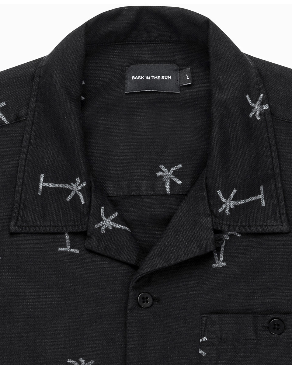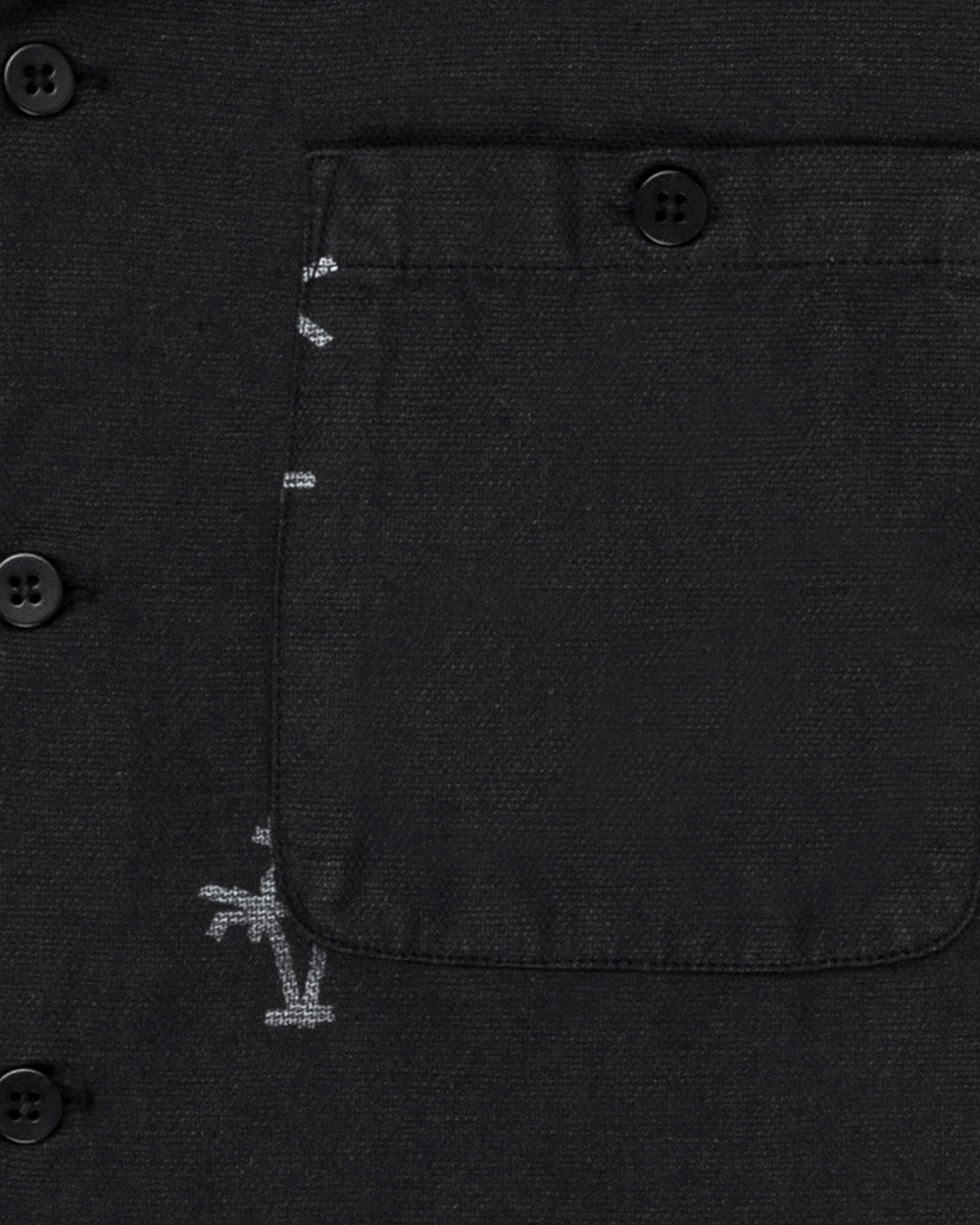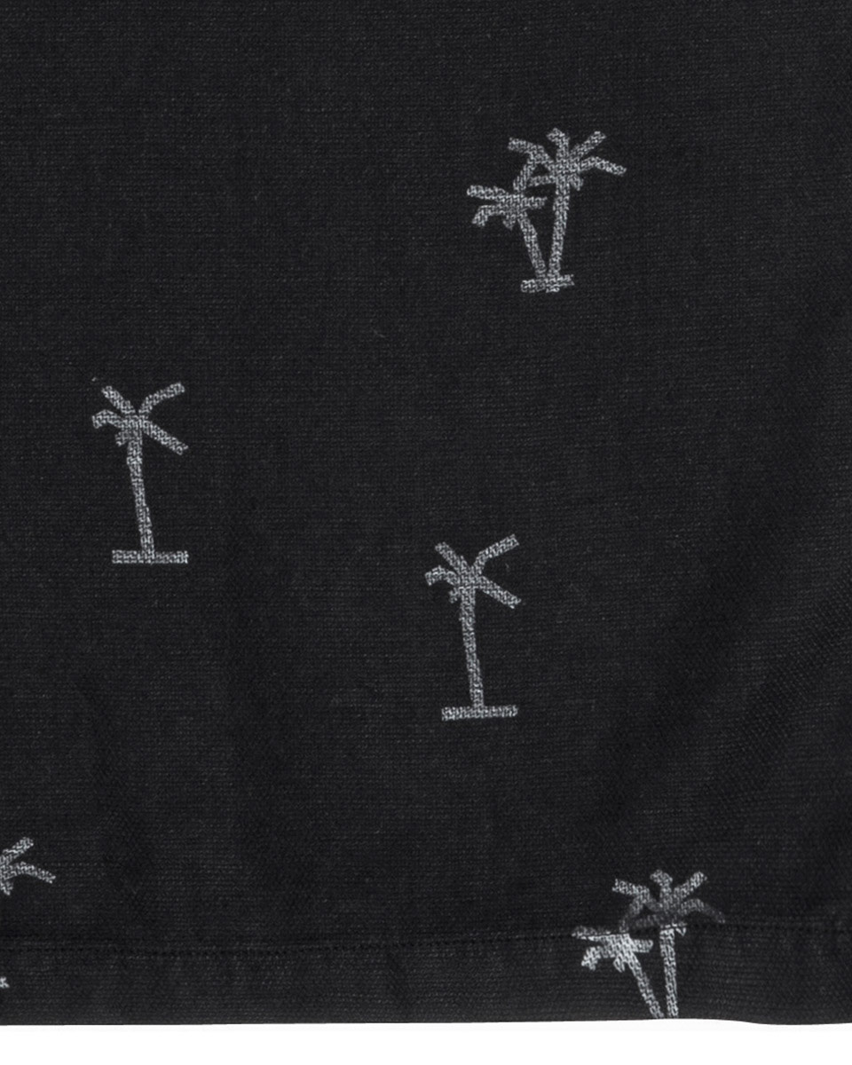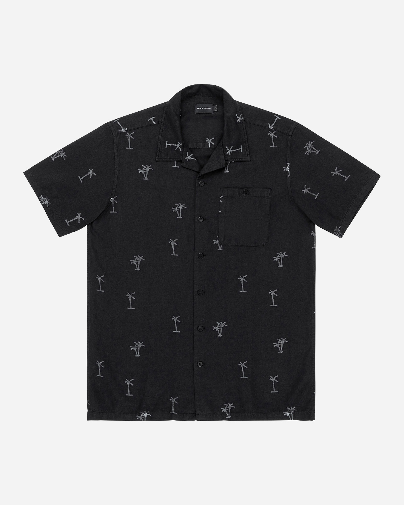 Chemisette pour un été sous les cocotiers Coloris : Noir Composition : 52% coton biologique / 48% Lin Poche poitrine à bouton Imprimé original d’après une œuvre du Graphiste Kanardo, à partir de rubans adhésifs Teinture non toxique Oeko-Tex Fabriqué au Portugal