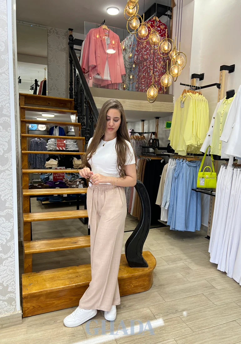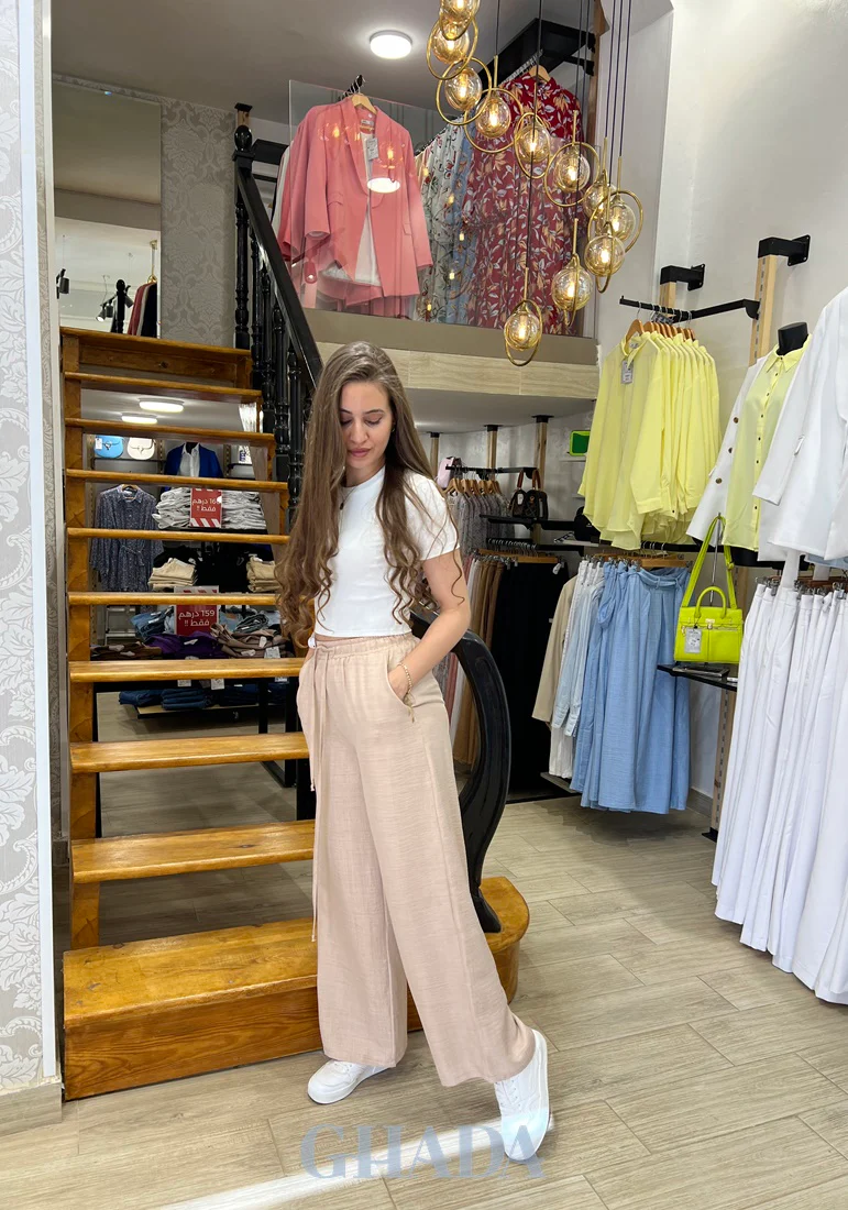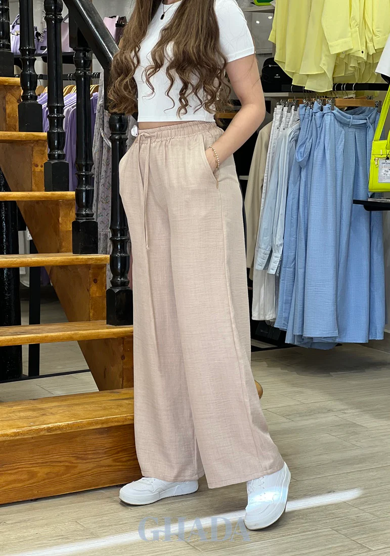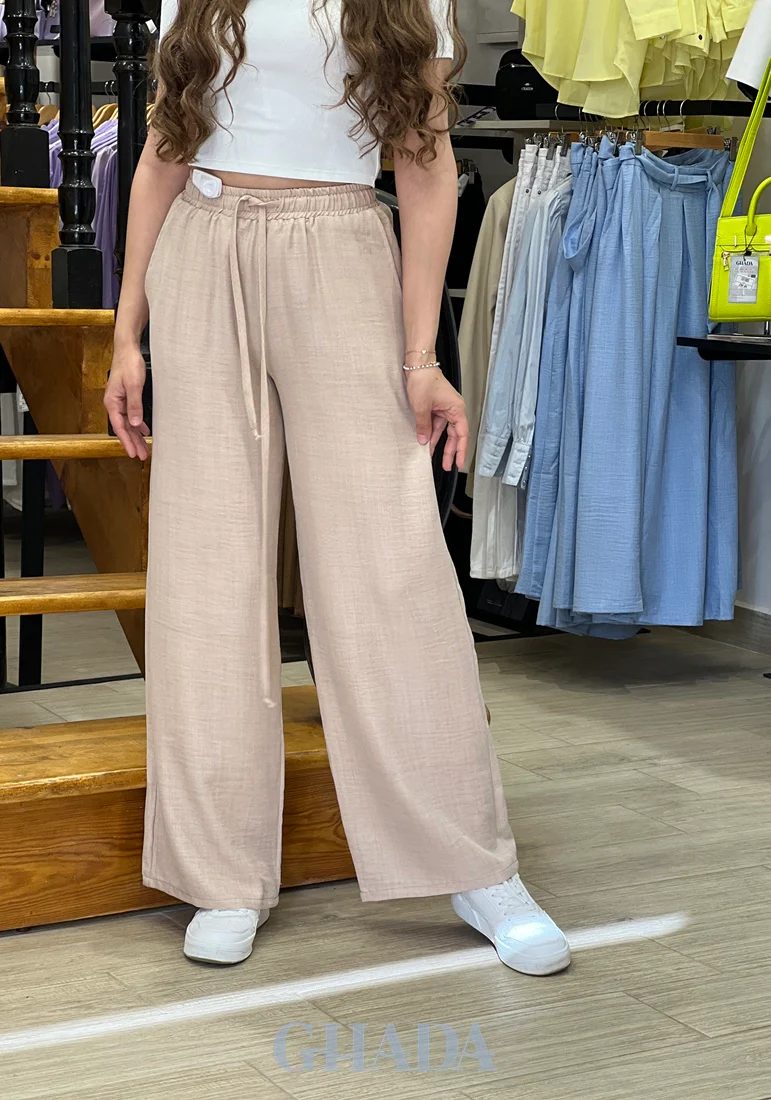 Ajouter à votre garde-robe un pantalon large beige en lin pour des tenues décontractées estivales pour toutes vos occasions.