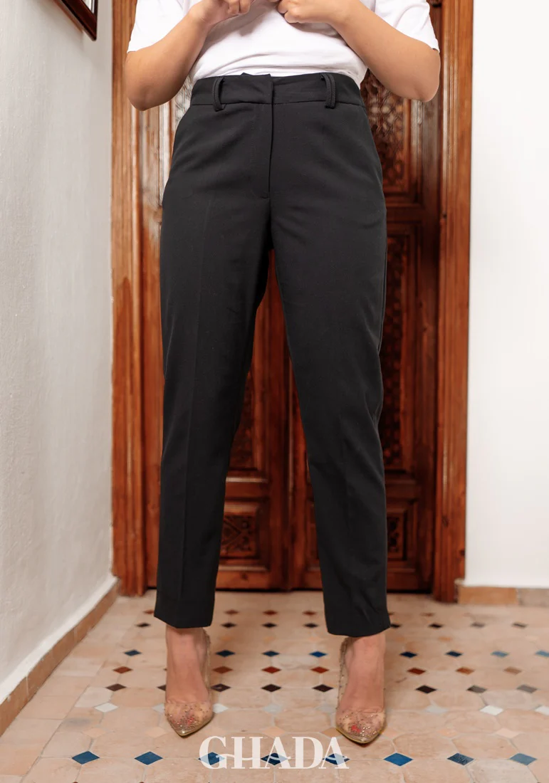 Pantalon en noir avec fente, découpe mom. GUIDE DES MESURES S M L XL XXL 36 38 40 42 44 Tour de poitrine 76 78 80 82 84 Tour de bassin 92 94 96 98 100 Longueur totale 92 92 92 94 94